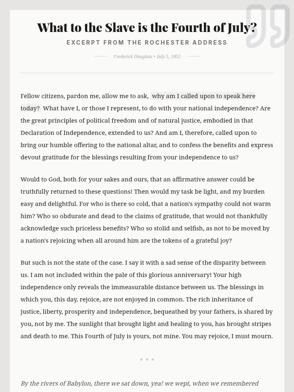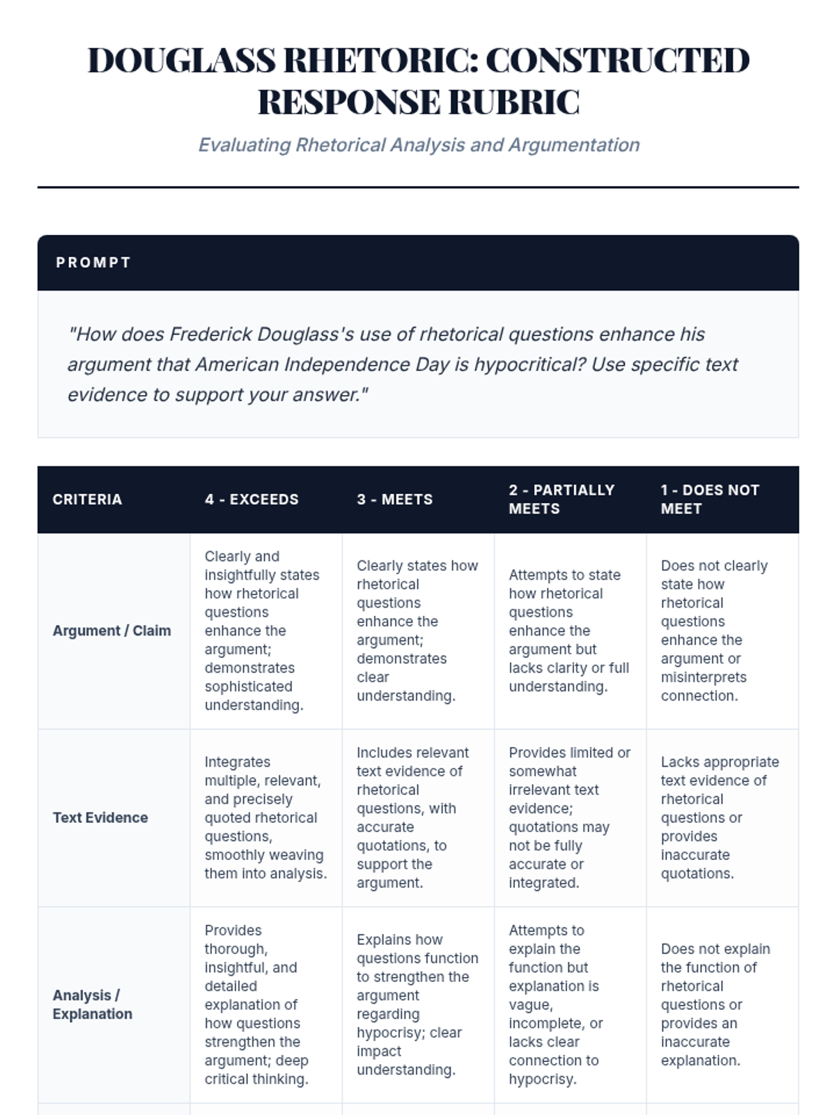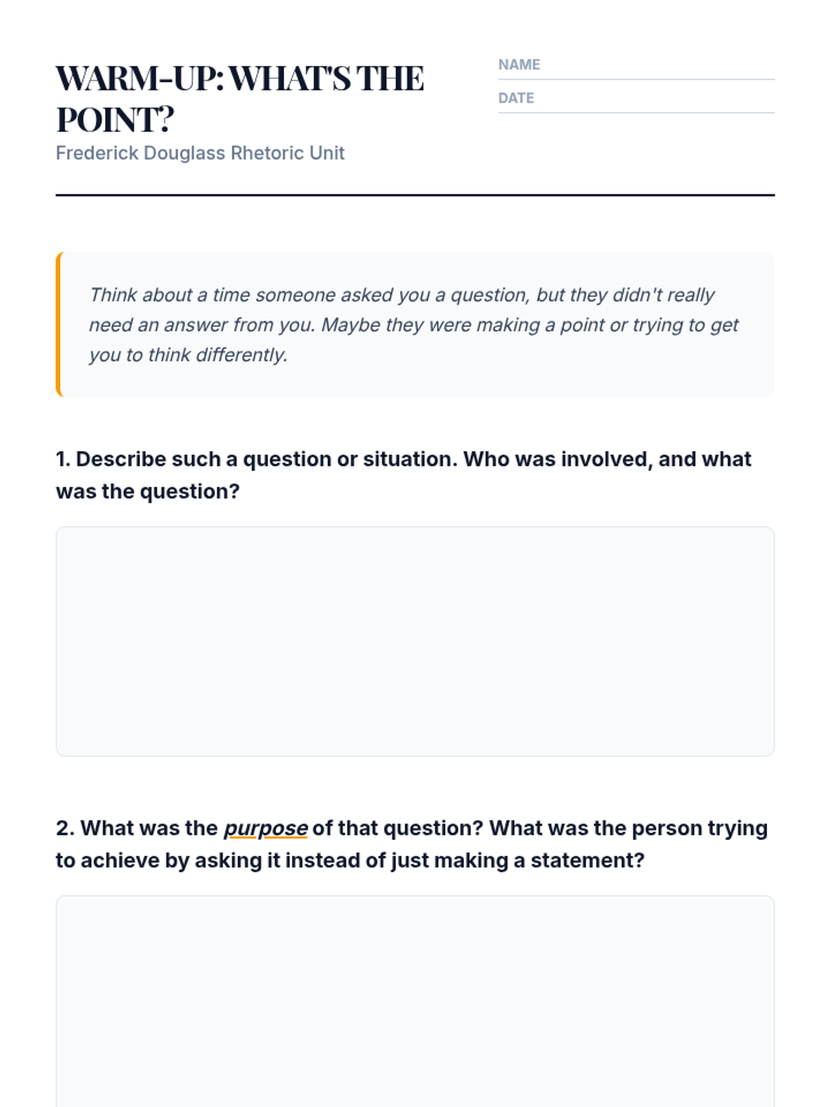 A 30-minute exploration of Frederick Douglass's use of rhetorical questions to expose the hypocrisy of American Independence Day. Students identify and analyze specific rhetorical strategies in his famous 1852 speech.