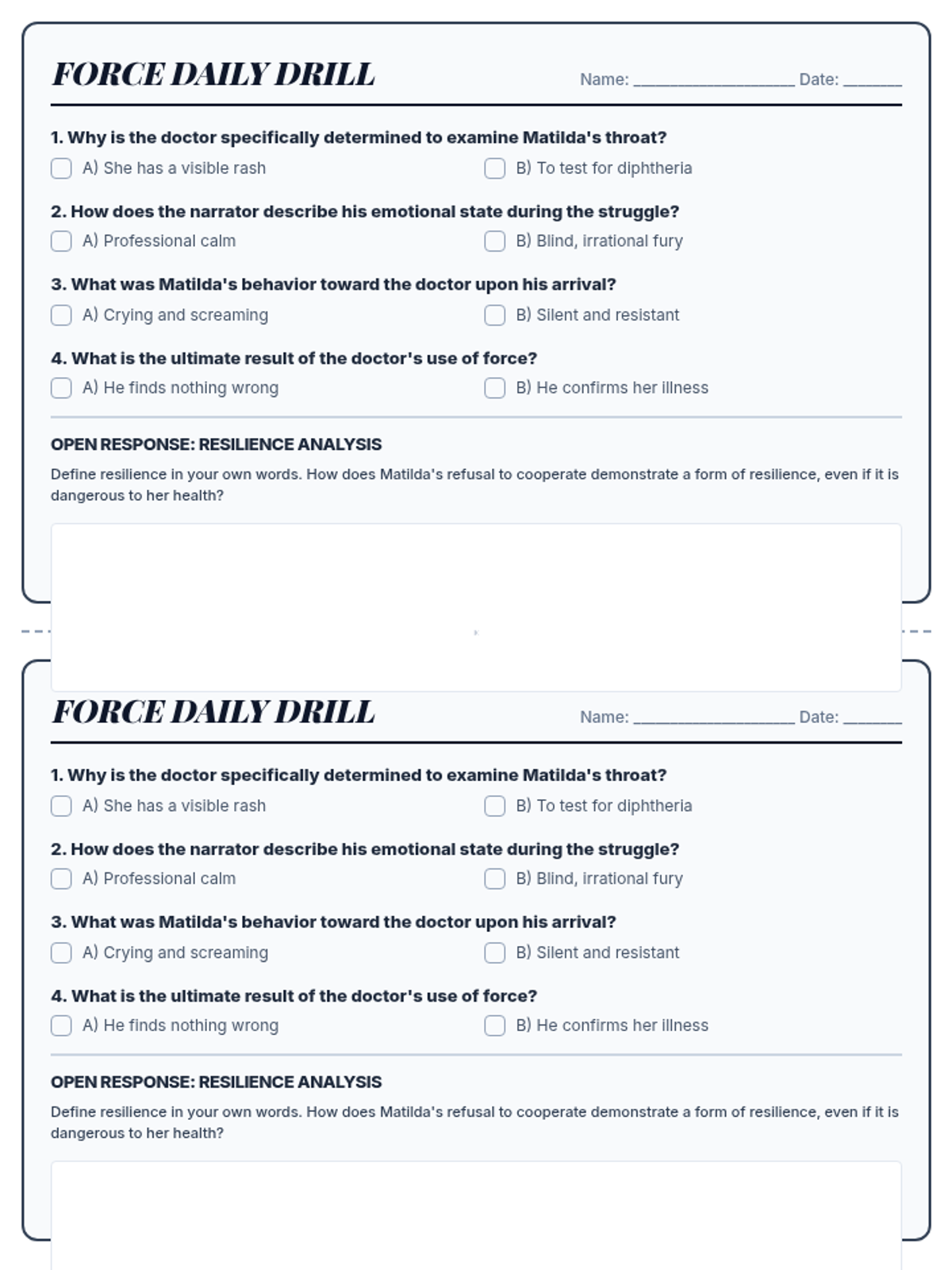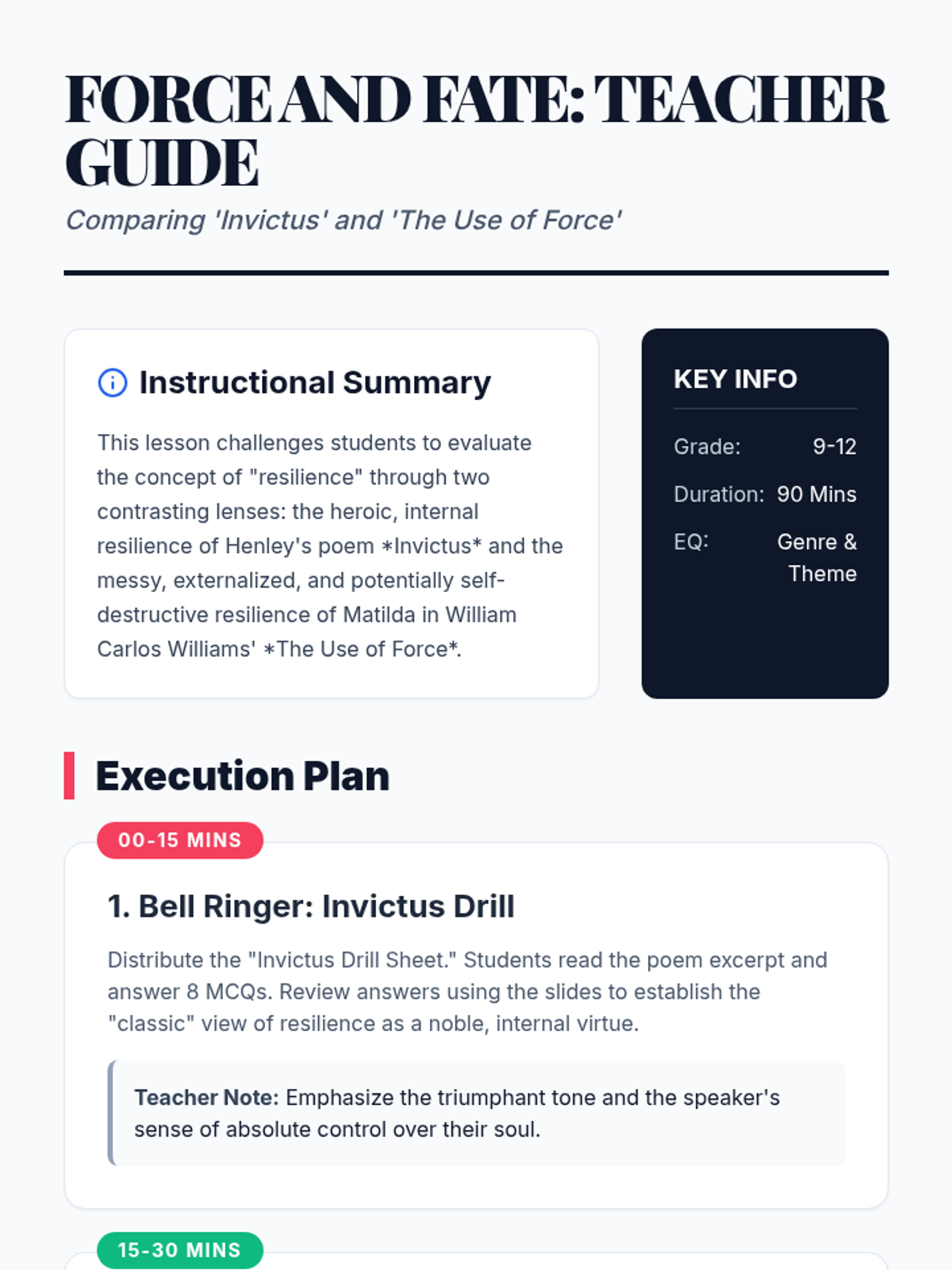 A comprehensive lesson exploring the themes of resilience and the use of force through William Carlos Williams' 'The Use of Force' and William Ernest Henley's 'Invictus'. Students compare how different genres portray a battle of wills.