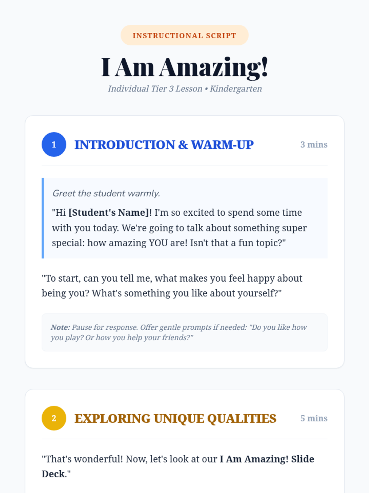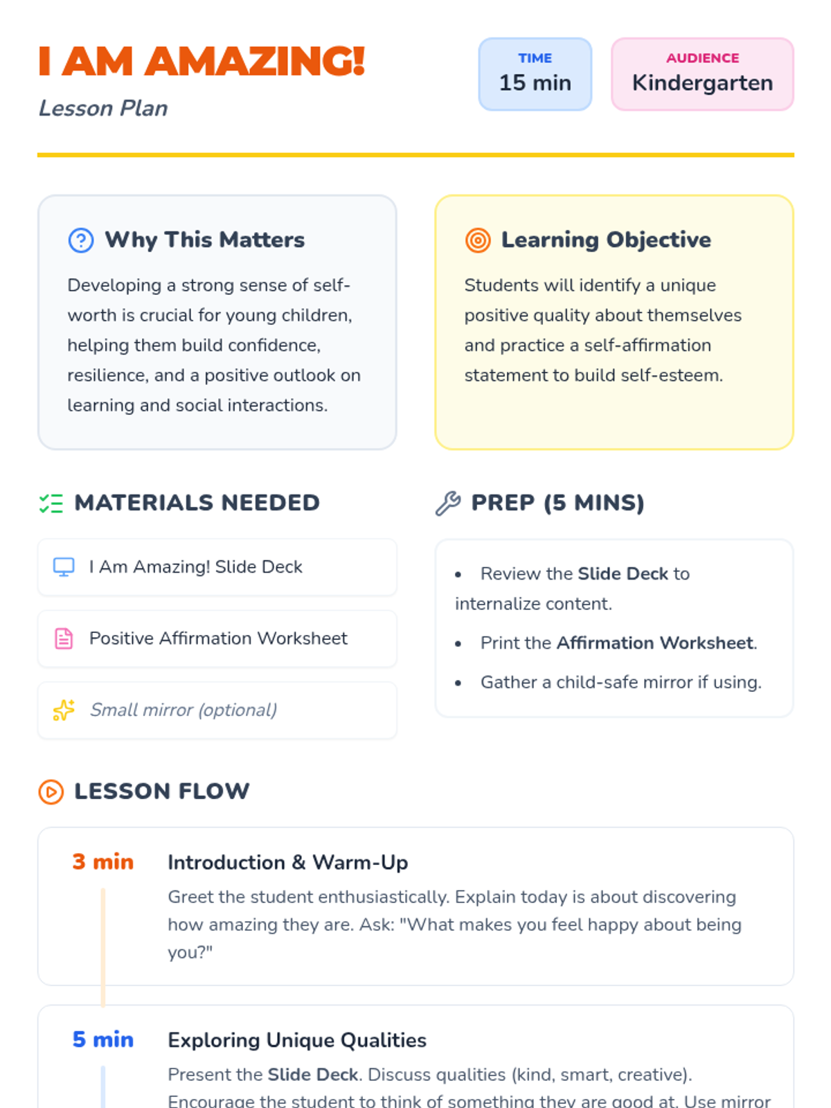 A 15-minute individual lesson for Kindergarten students to help them recognize their unique strengths and build self-esteem through positive self-talk and affirmations.