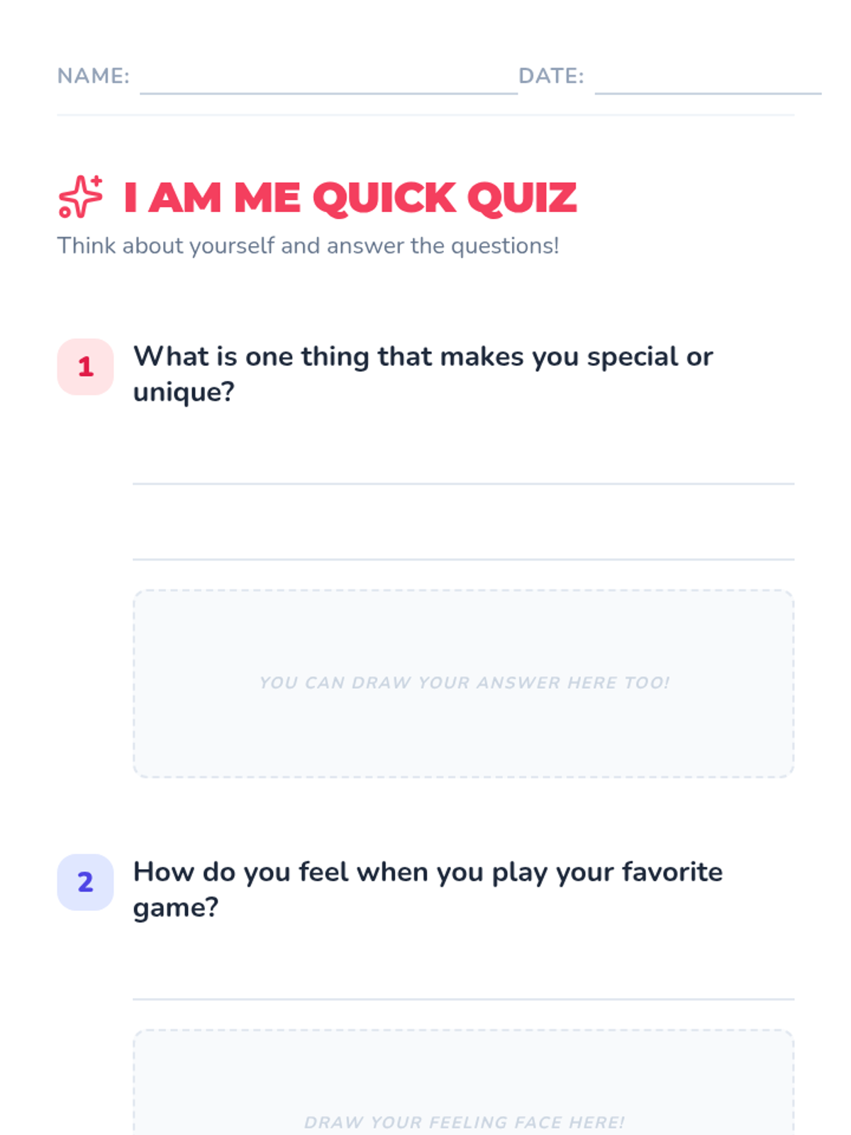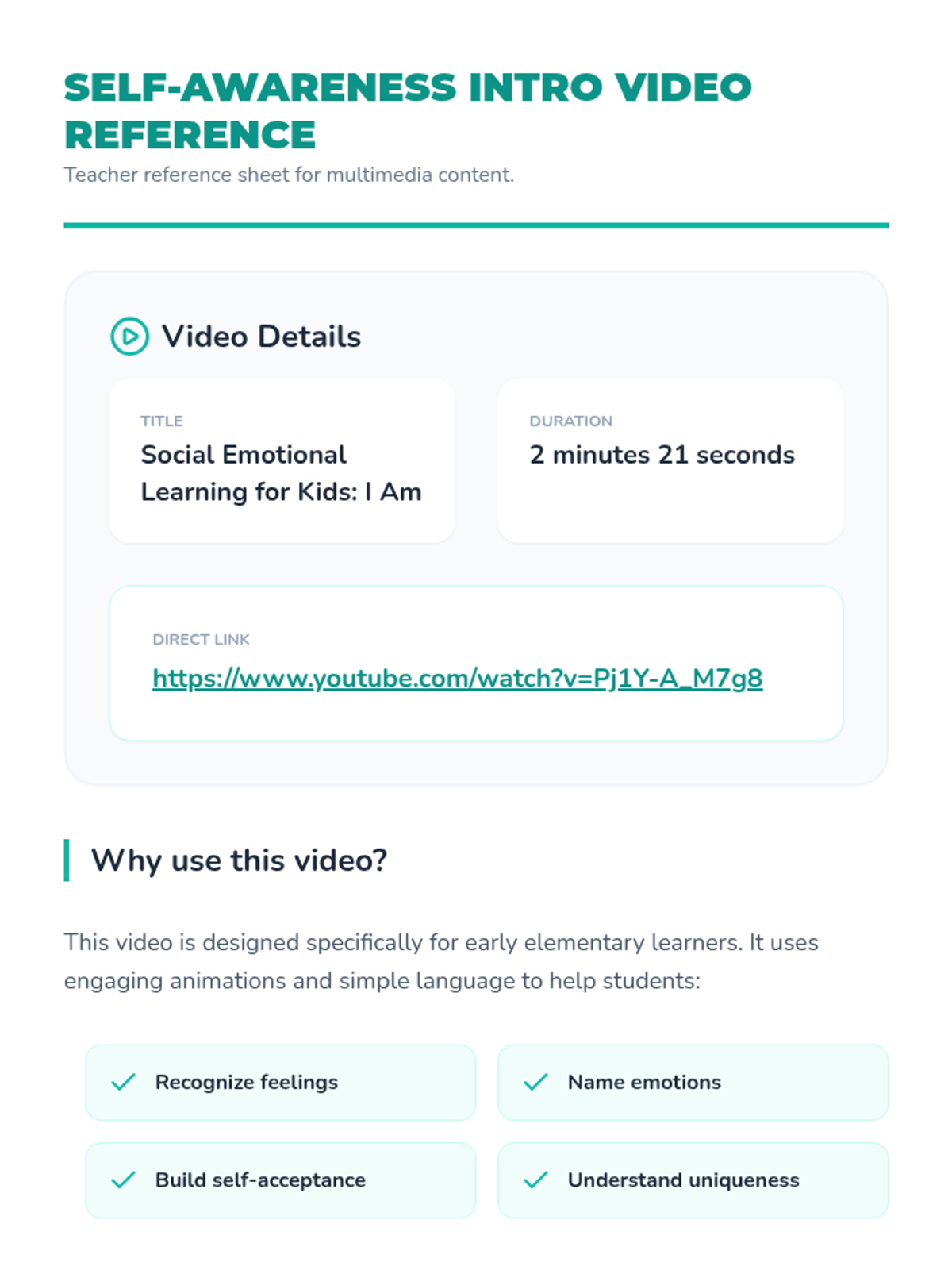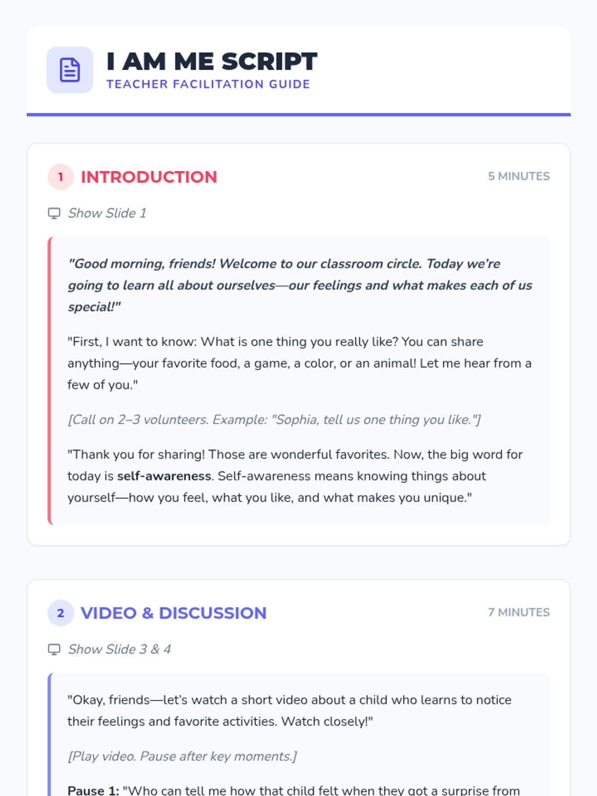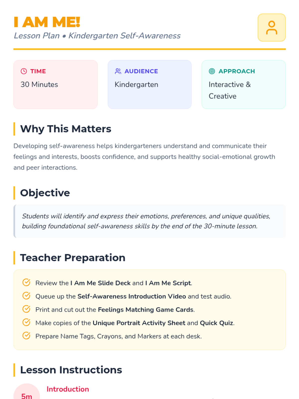 A 30-minute kindergarten lesson on self-awareness where students explore emotions, preferences, and unique qualities through videos, games, and art.