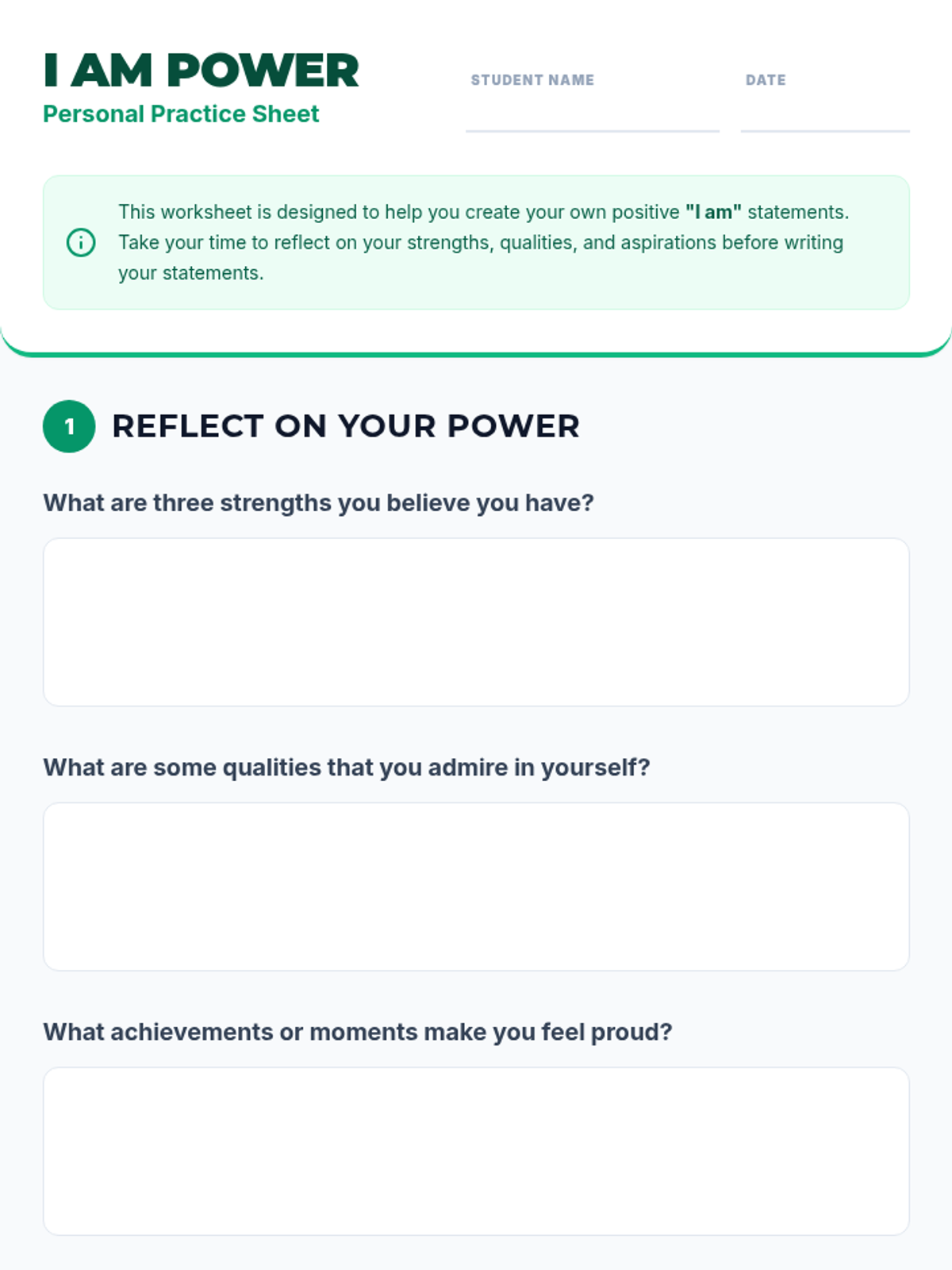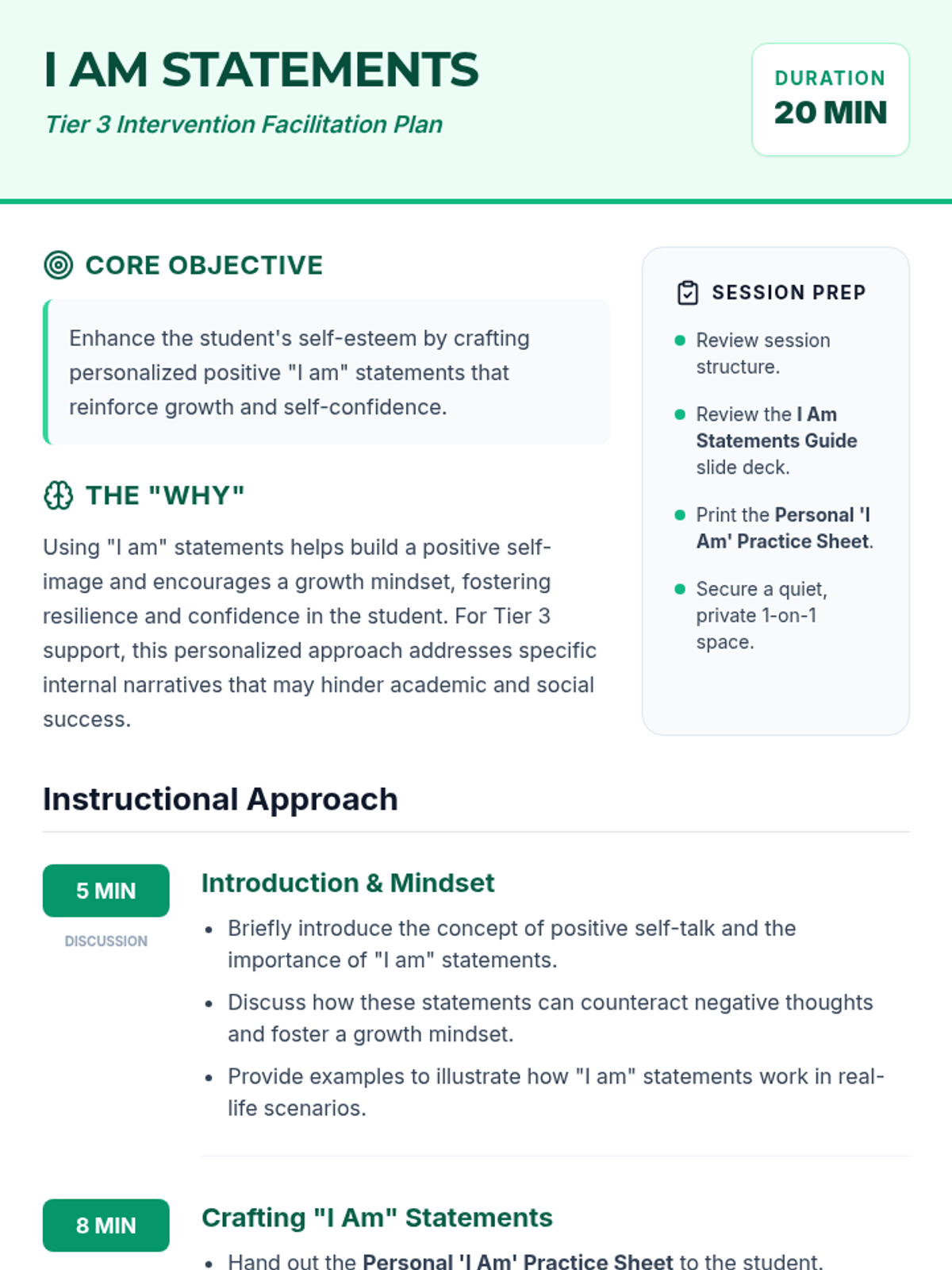 A Tier 3 intervention lesson for 9th-grade students to build self-esteem through personalized positive affirmations and growth mindset practices.