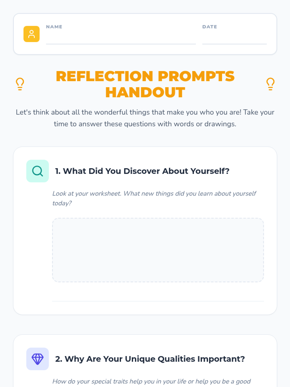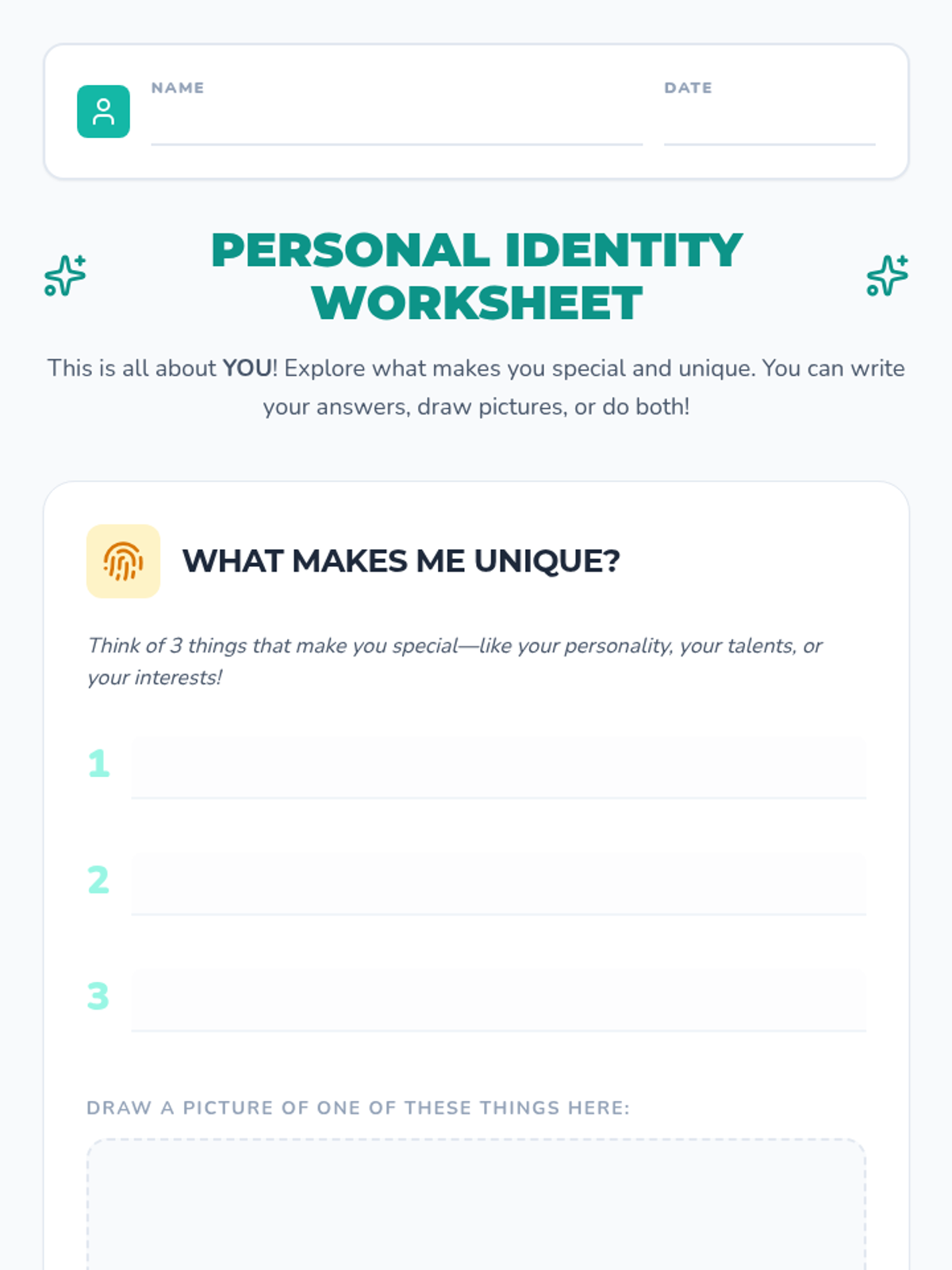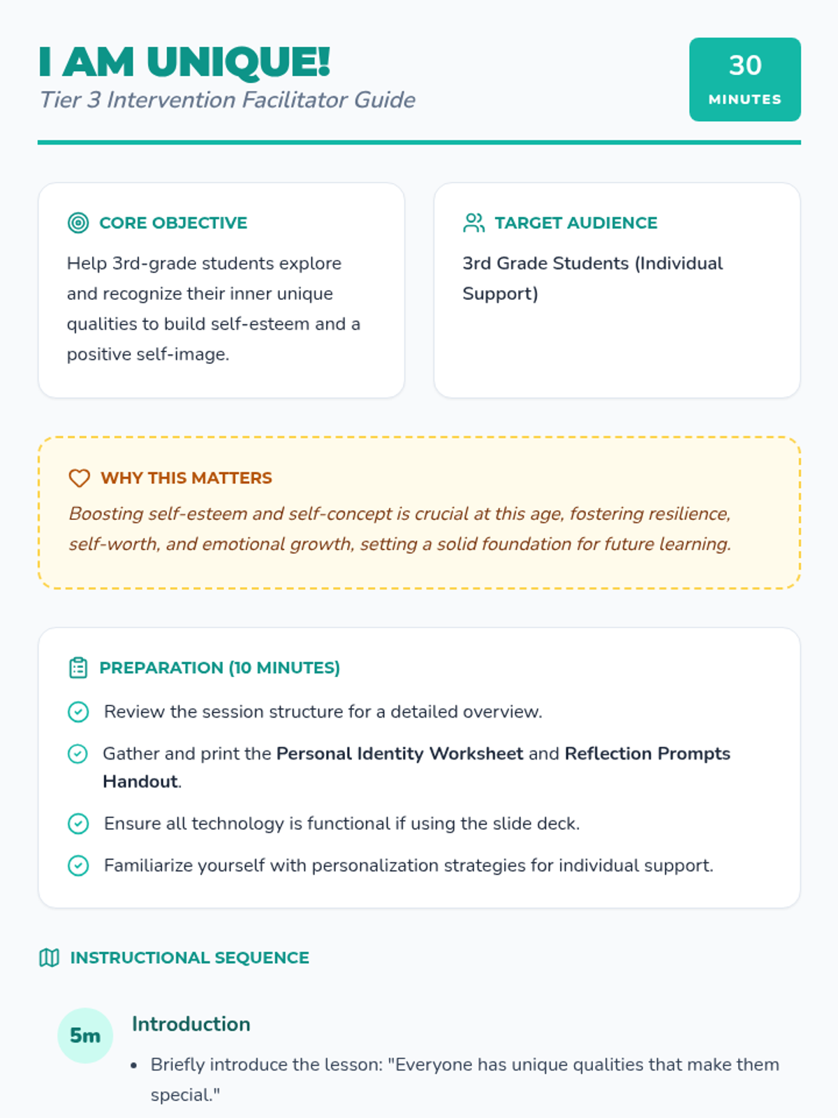A Tier 3 intervention lesson for 3rd-grade students focused on building self-esteem and self-concept through personalized identity activities. Students explore their unique traits, interests, and values to foster a positive self-image.
