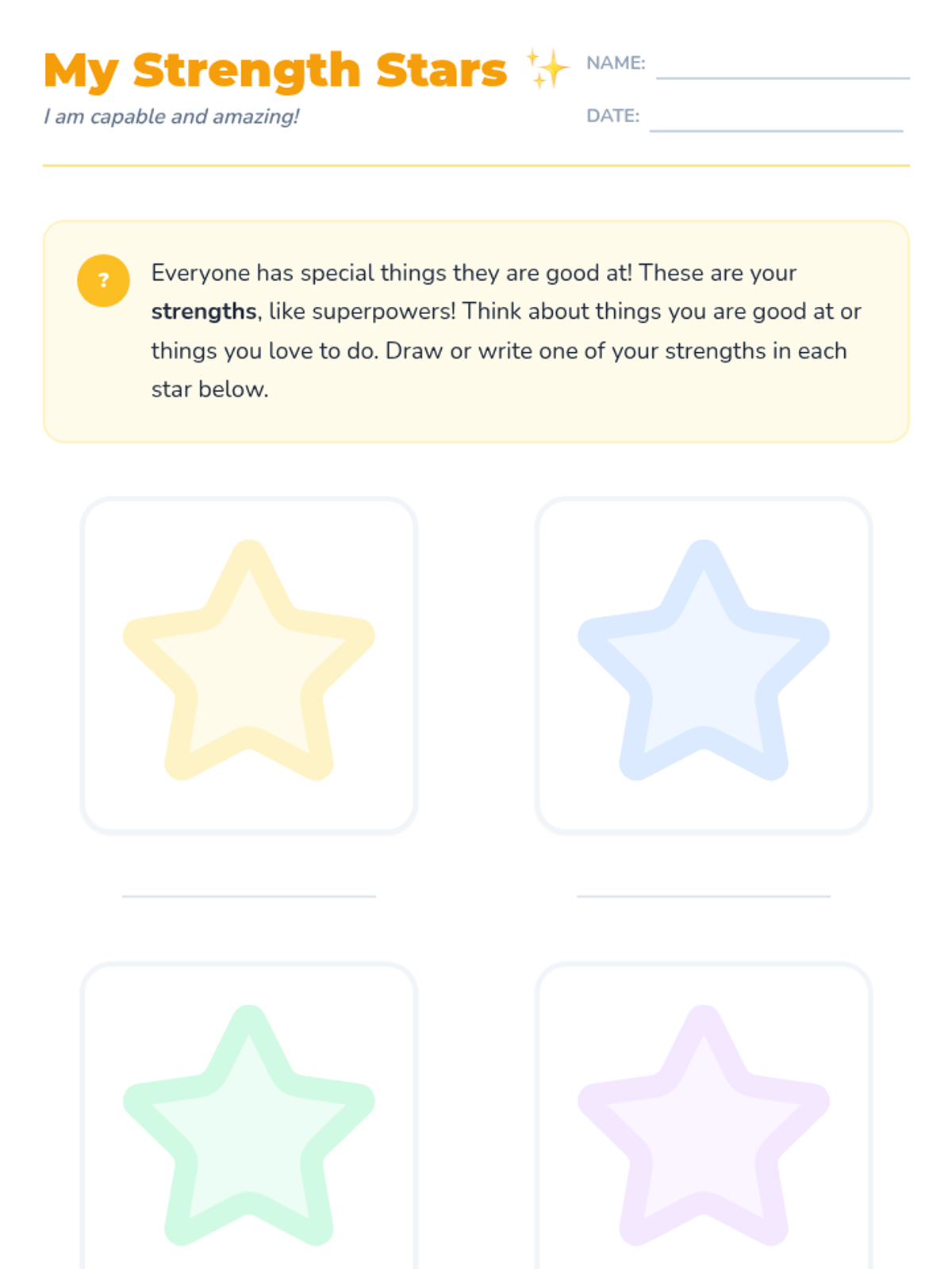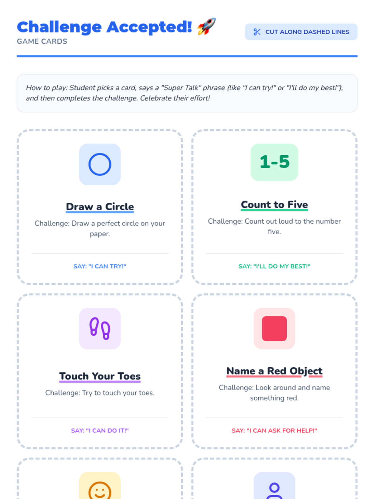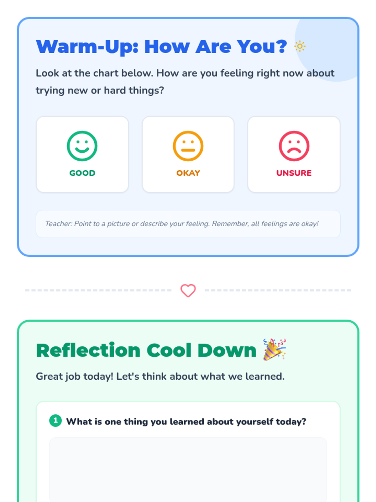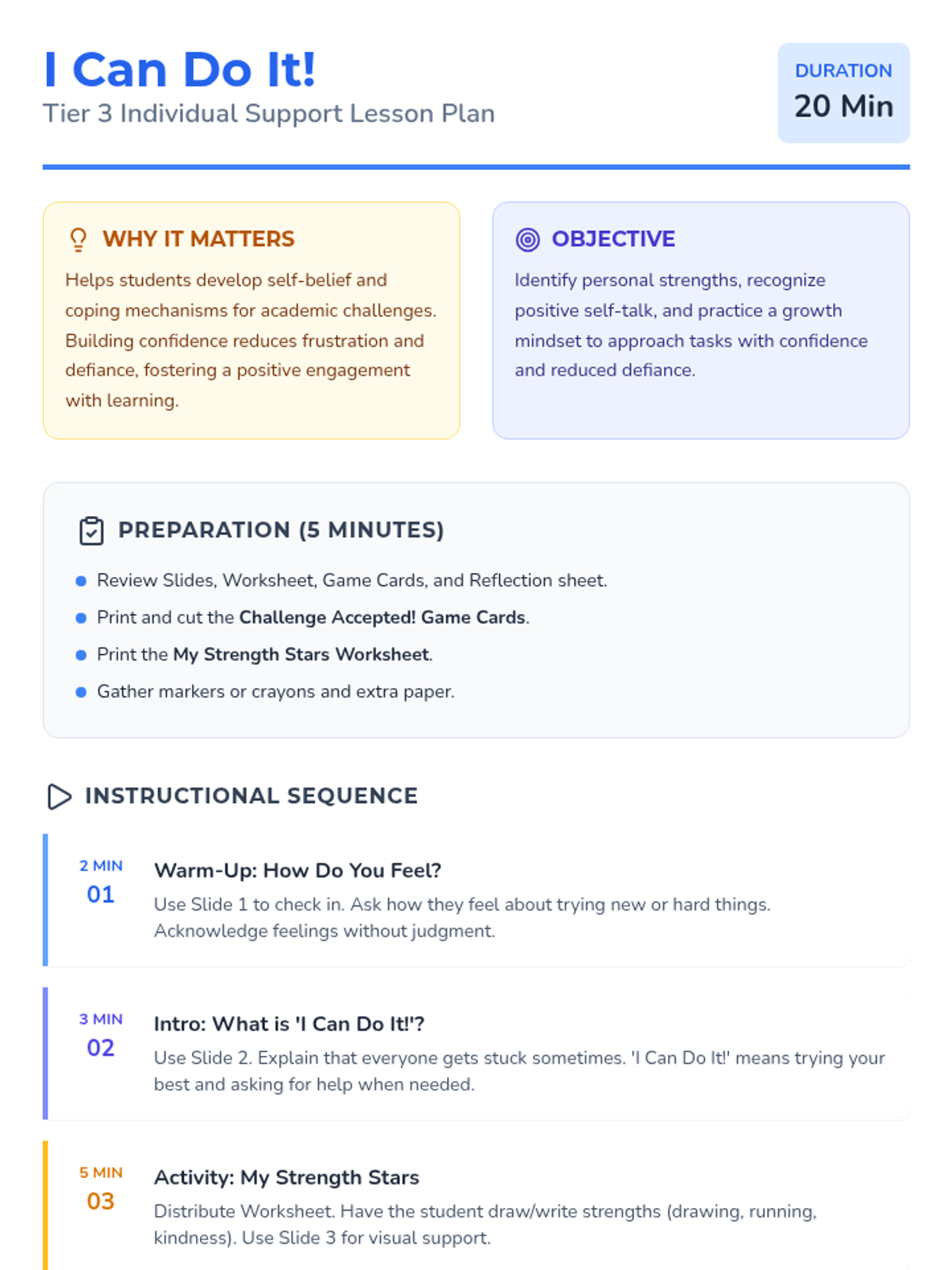 A 20-minute, single-session Tier 3 lesson for 1st-grade students to build self-confidence and growth mindset through identifying strengths and practicing positive self-talk.