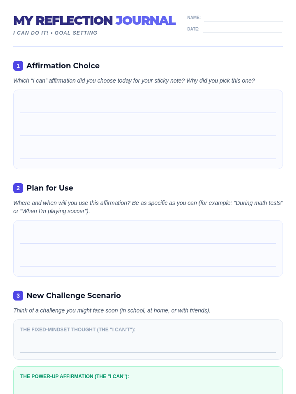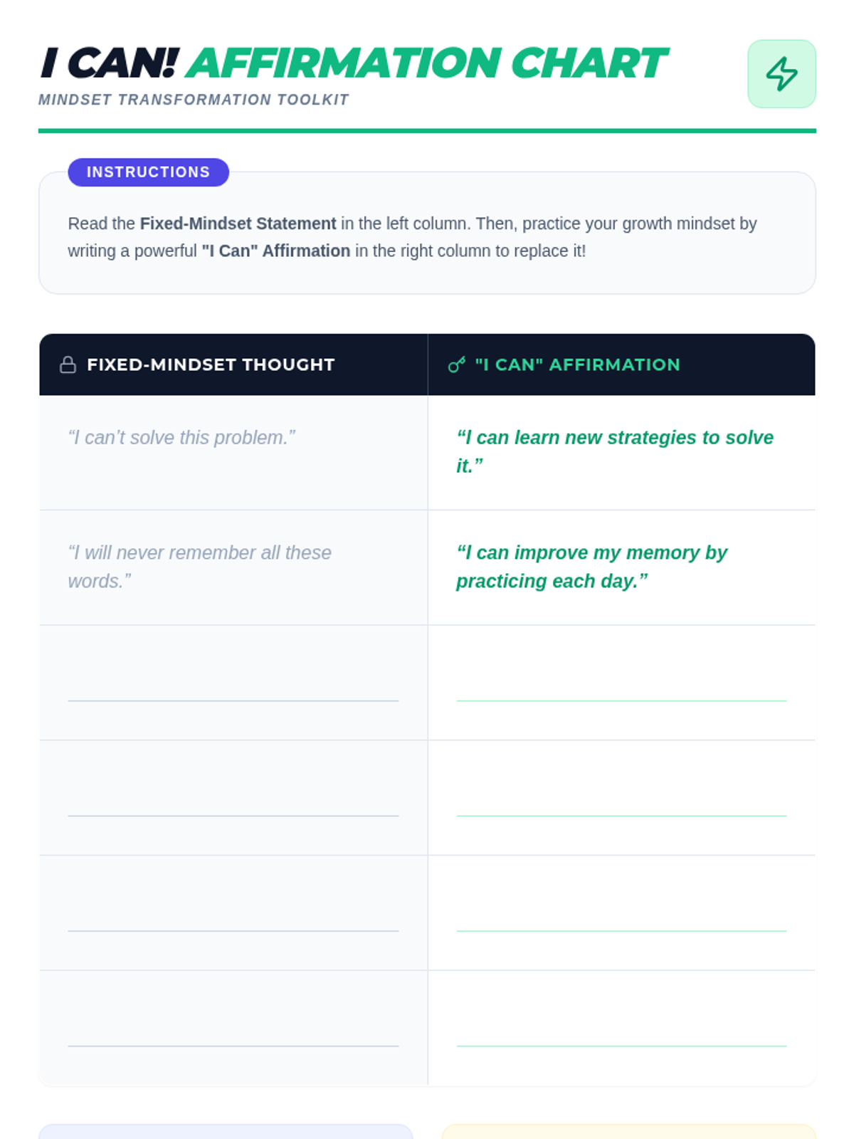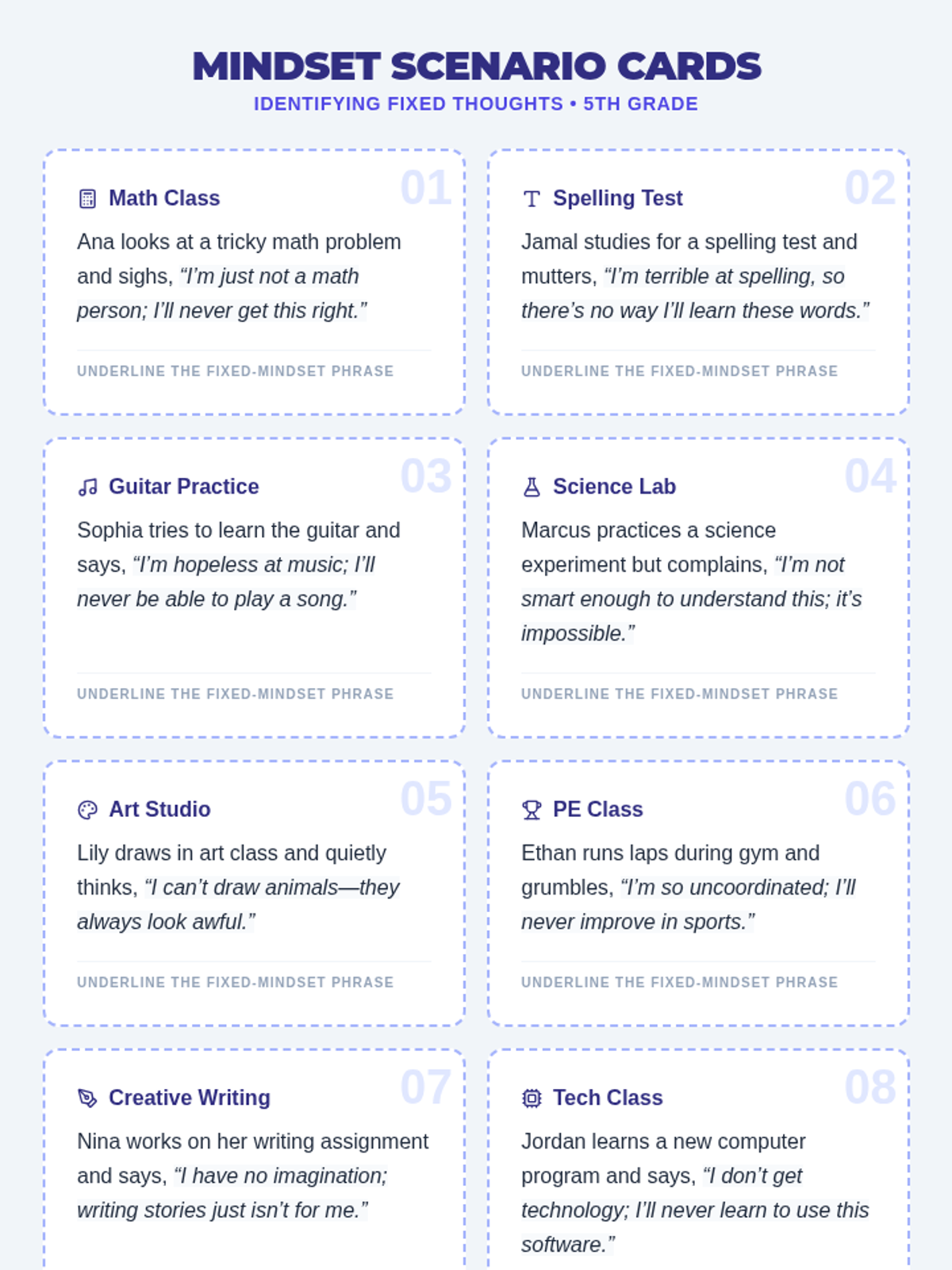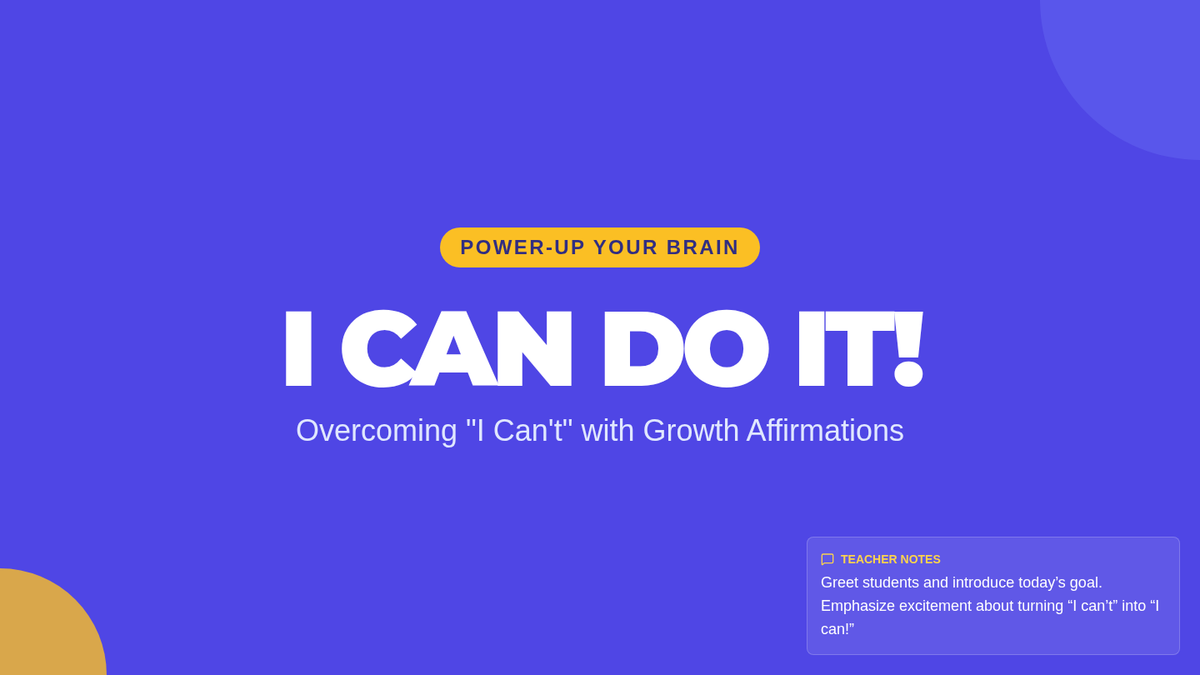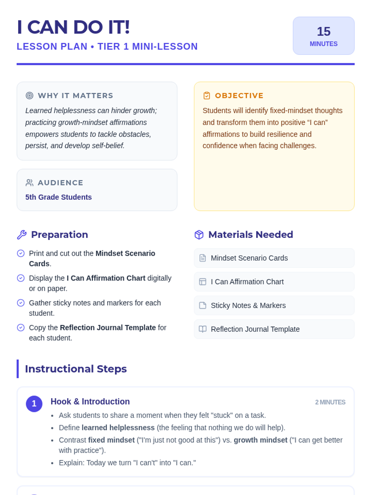 A 15-minute Tier 1 mini-lesson for 5th graders to recognize learned helplessness, identify fixed mindset thoughts, and practice resilience-building "I can" affirmations.