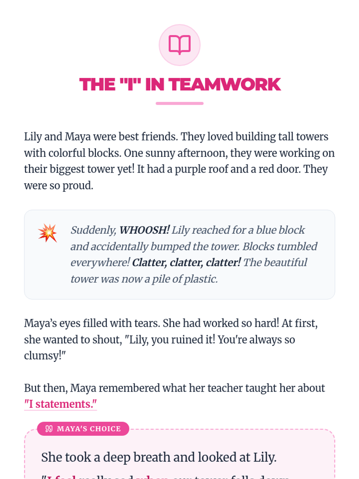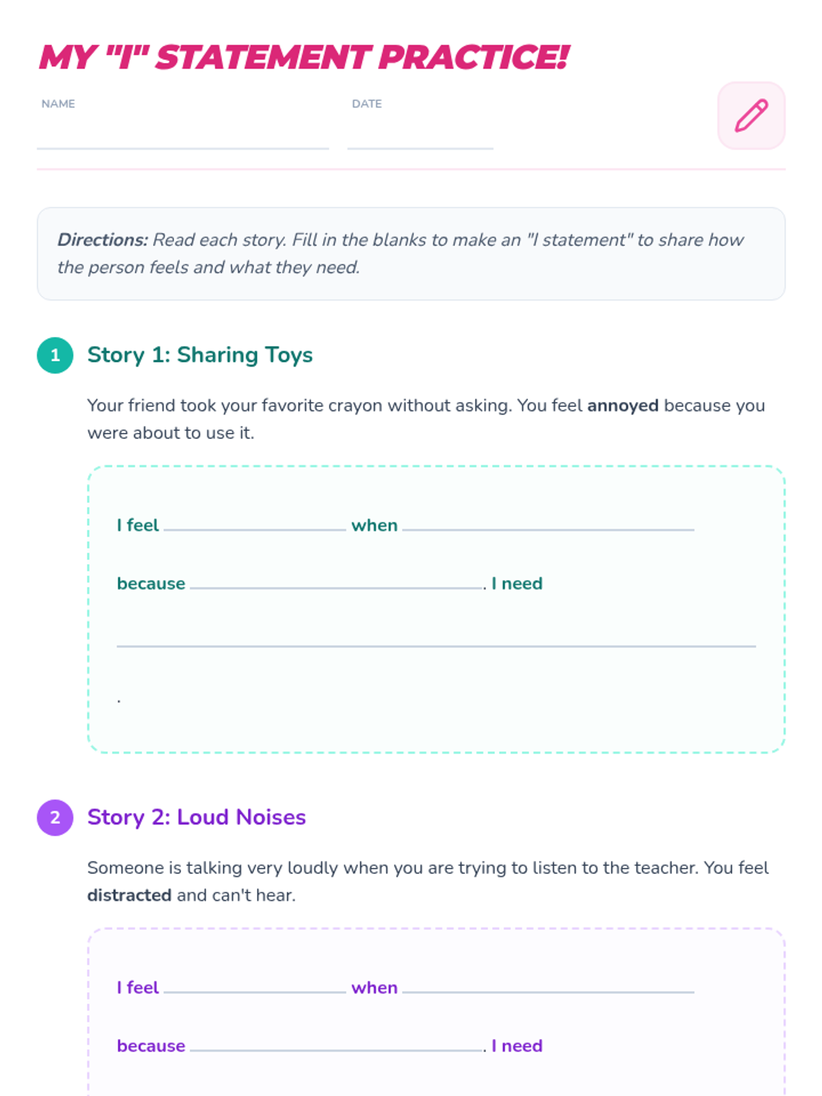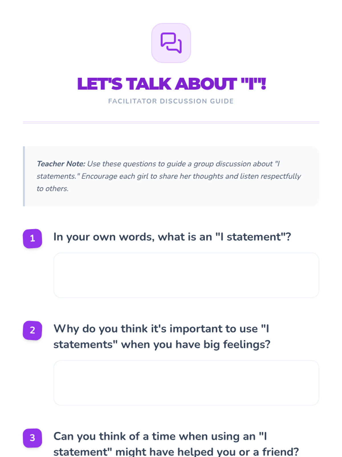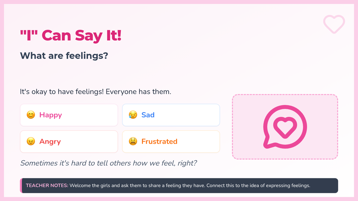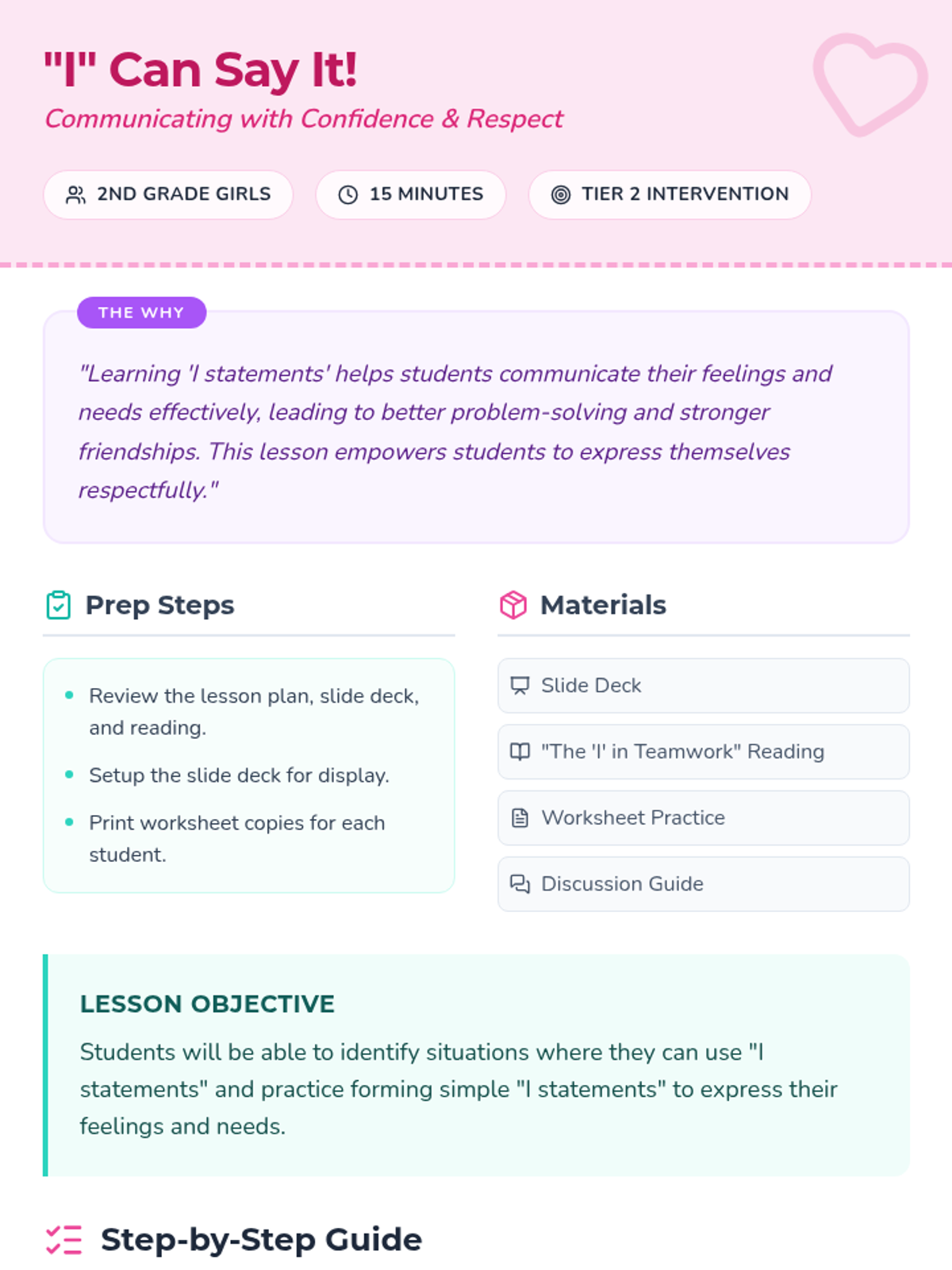 A 15-minute small group lesson for second-grade girls focused on identifying feelings and using 'I statements' to communicate needs respectfully.