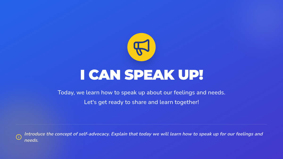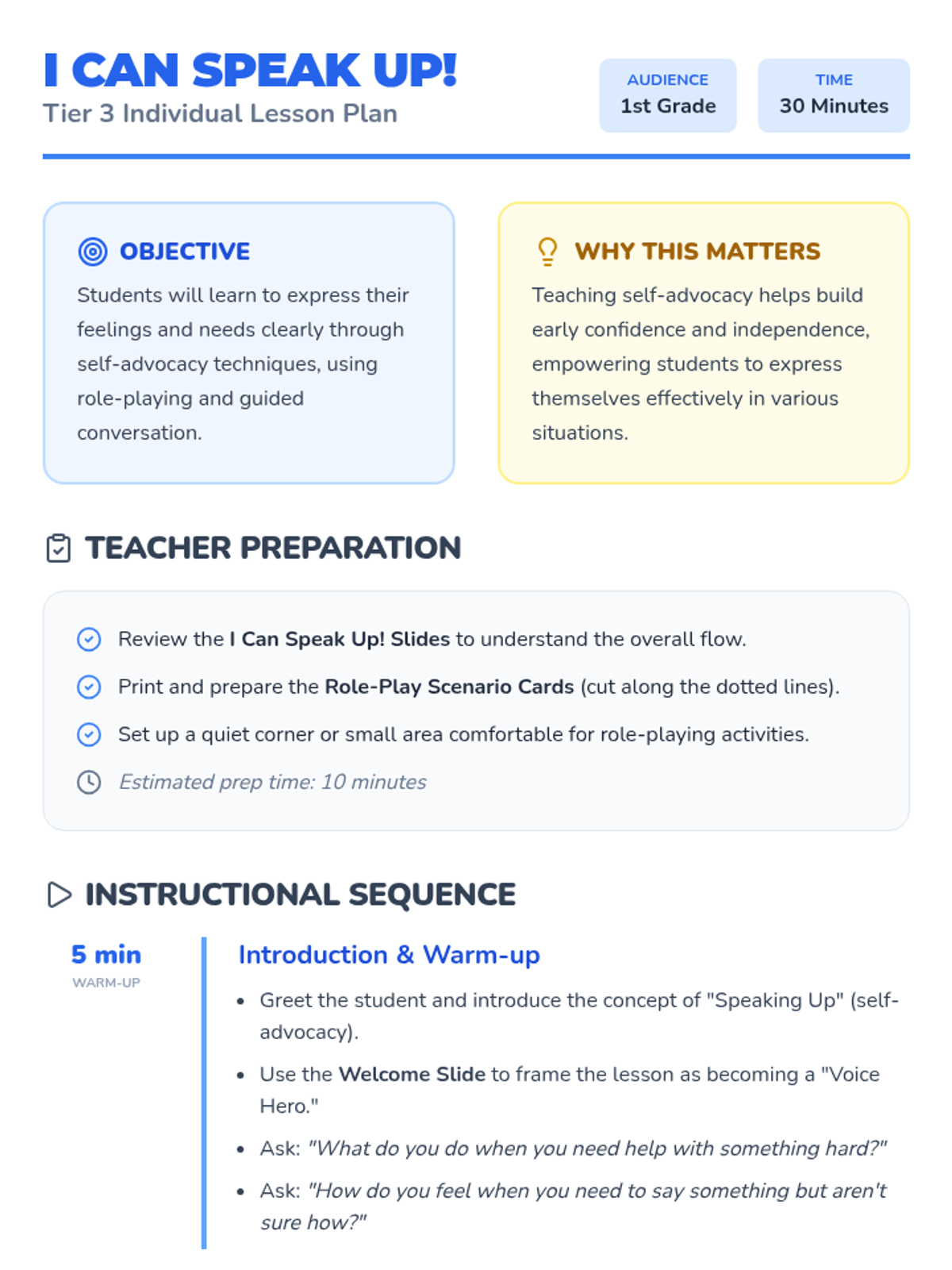 A Tier 3 individual support lesson for 1st graders focusing on self-advocacy skills, empowering students to express their needs and feelings through role-play.