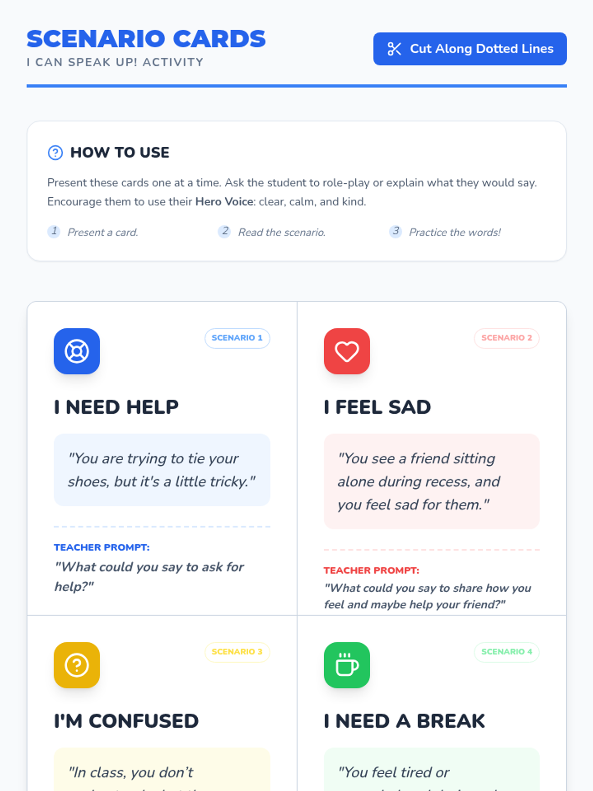 A lesson designed to help students distinguish between Small and Big Problems and choose safe regulation strategies instead of physical reactions. It includes a social story, practice worksheet, and strategy reference guide.