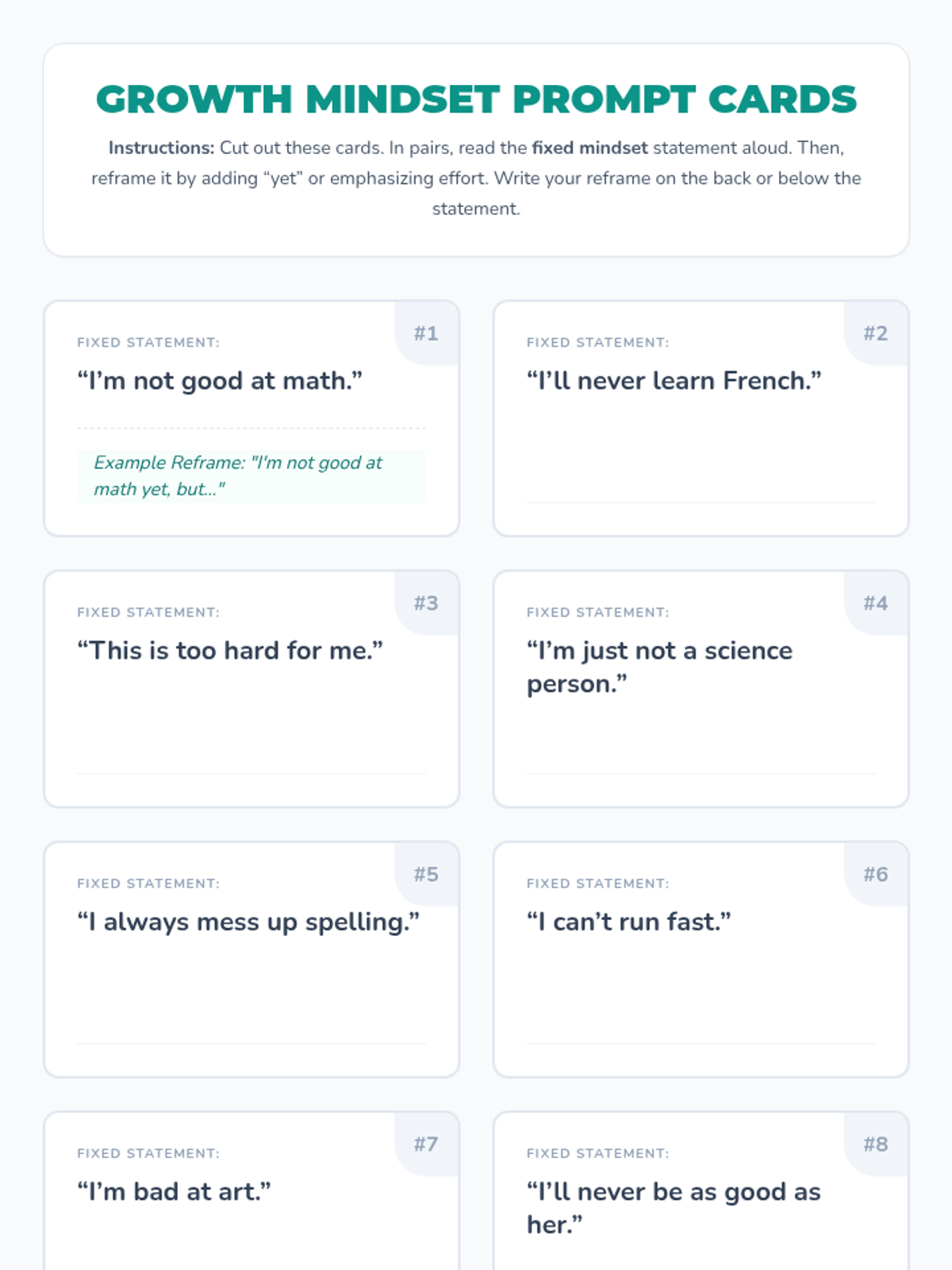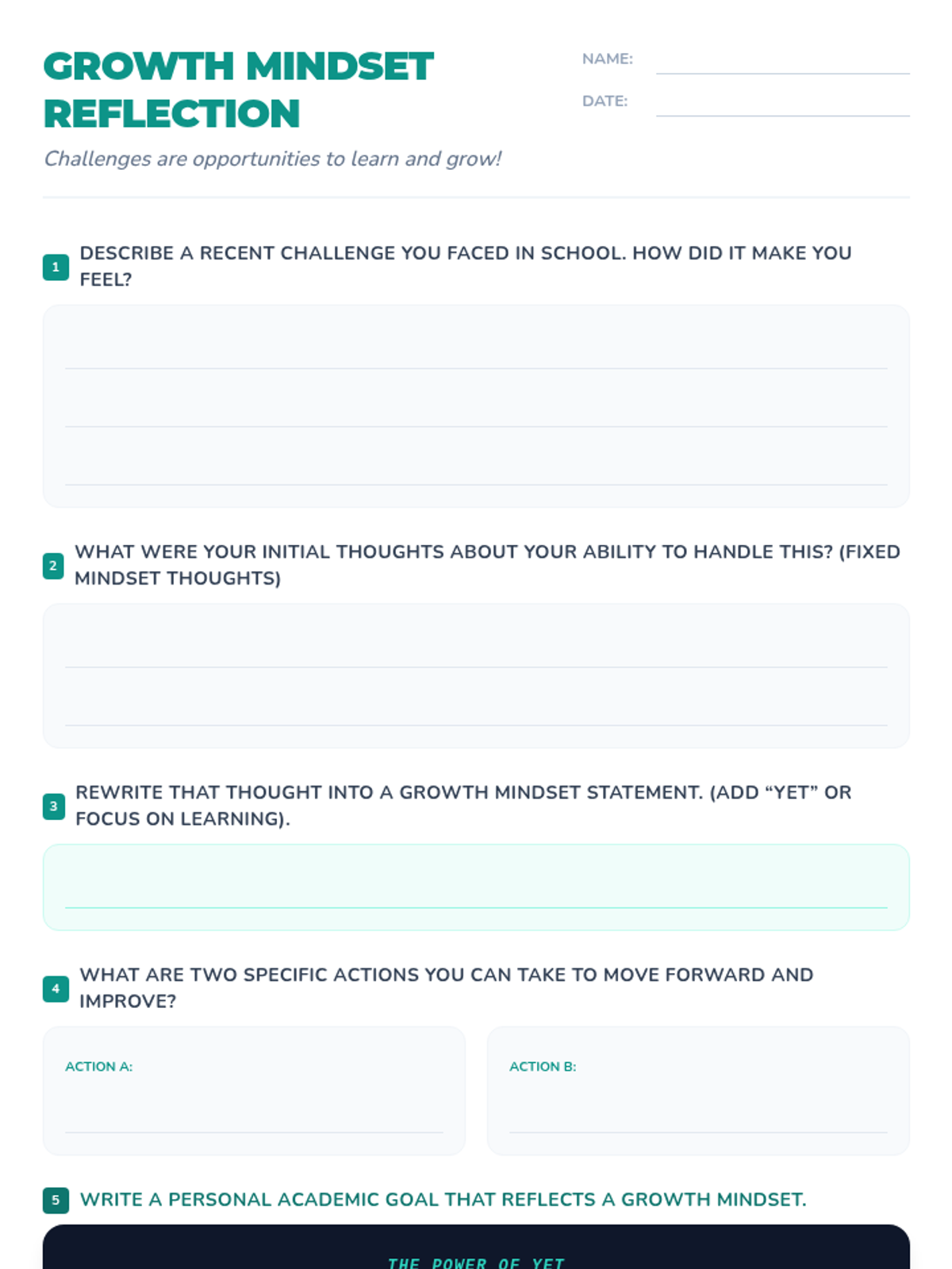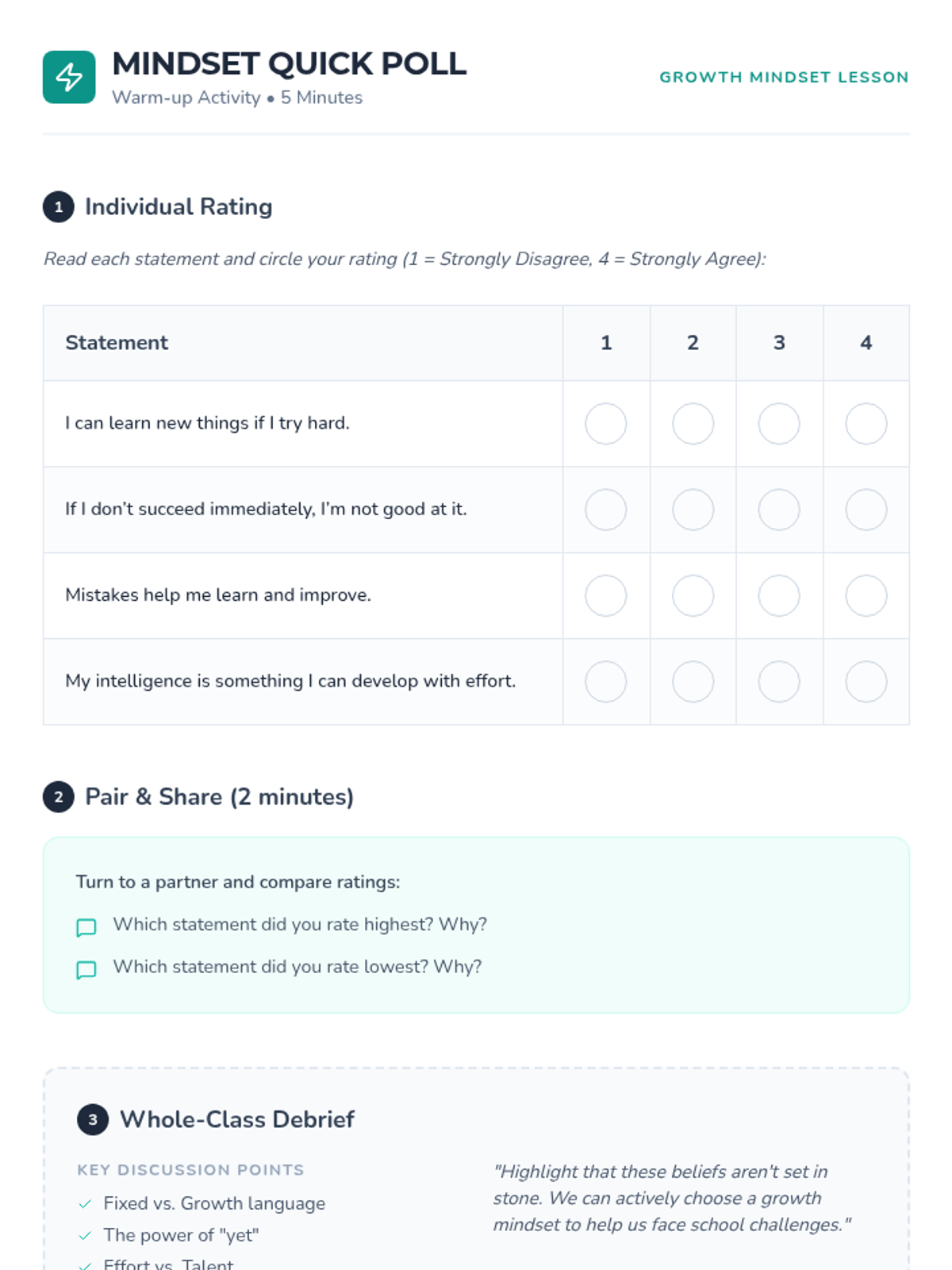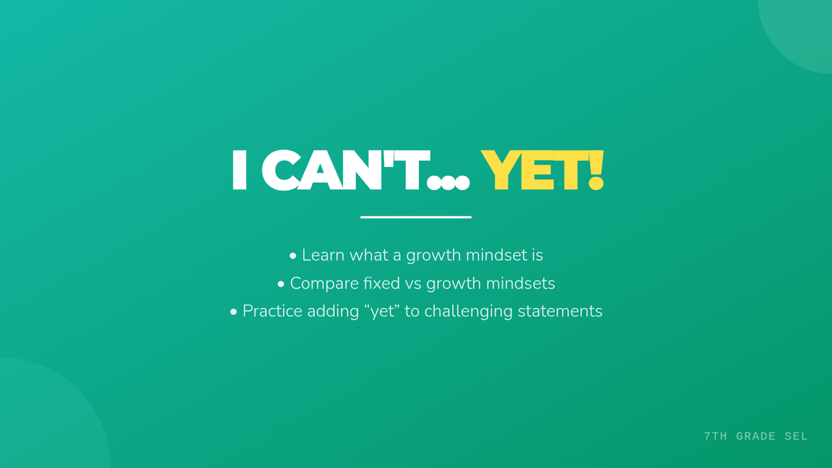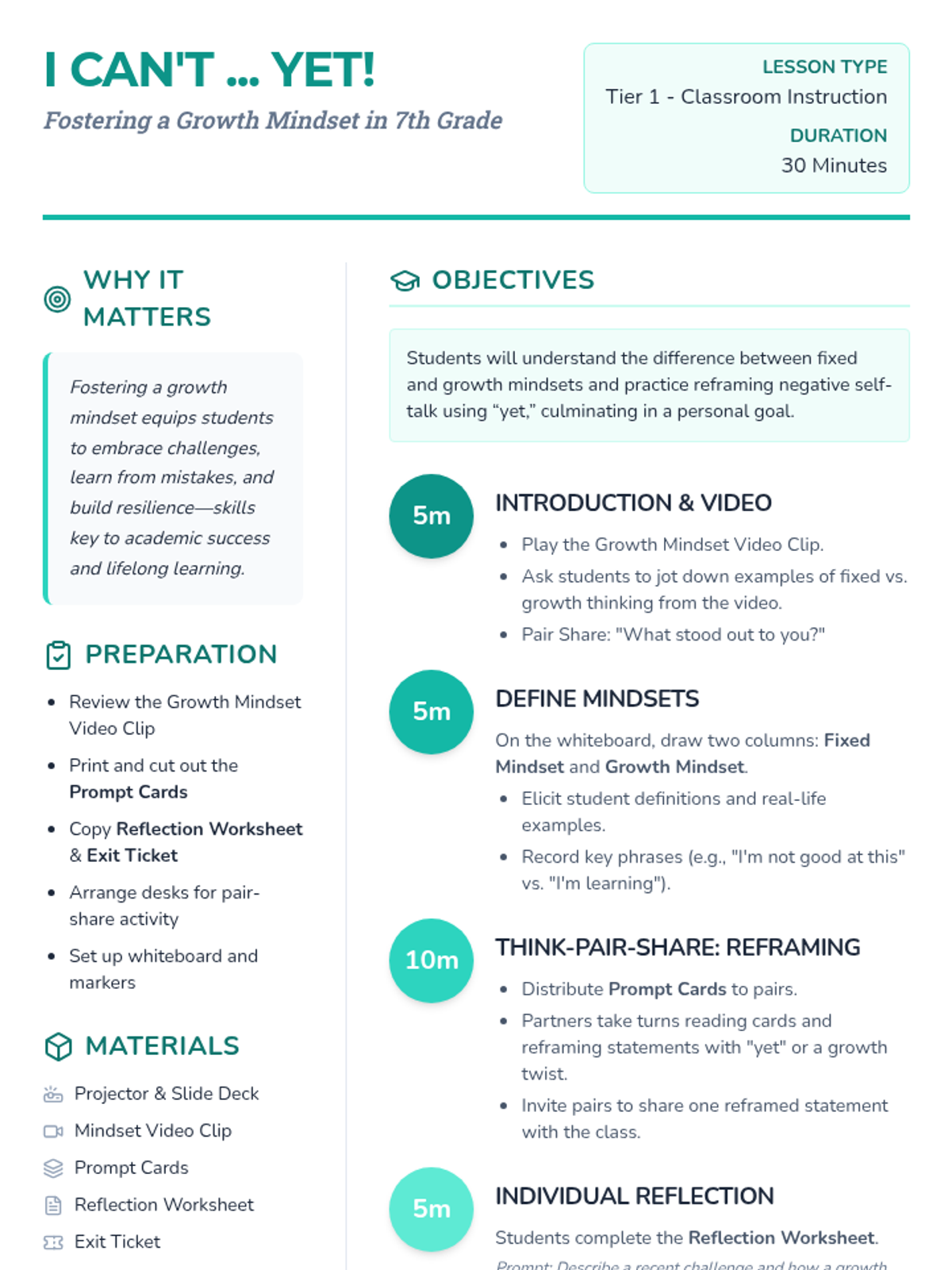 A 30-minute Tier 1 lesson for 7th graders to explore growth mindset, learn the power of 'yet', and practice reframing fixed-mindset thoughts into opportunities for growth.