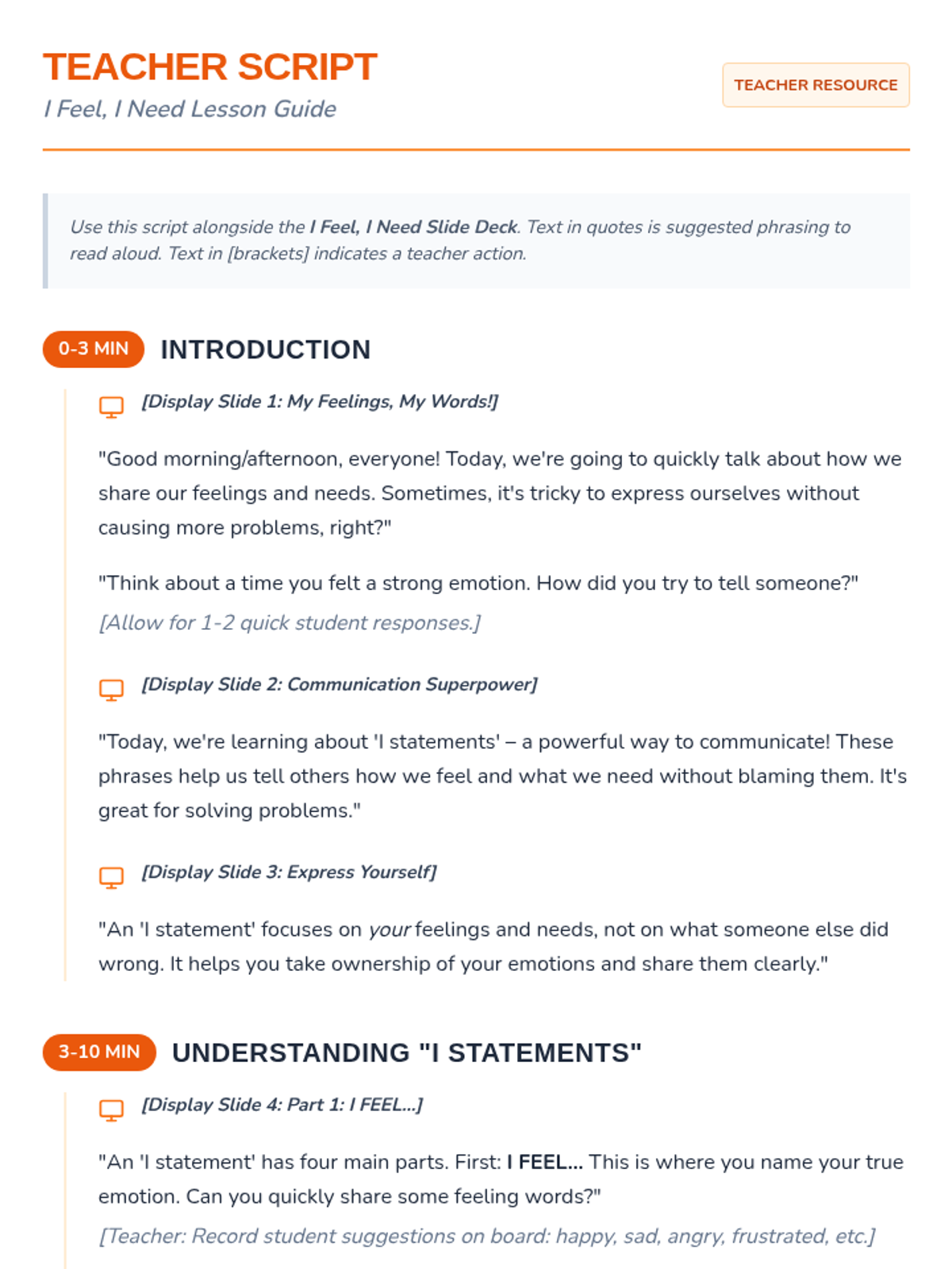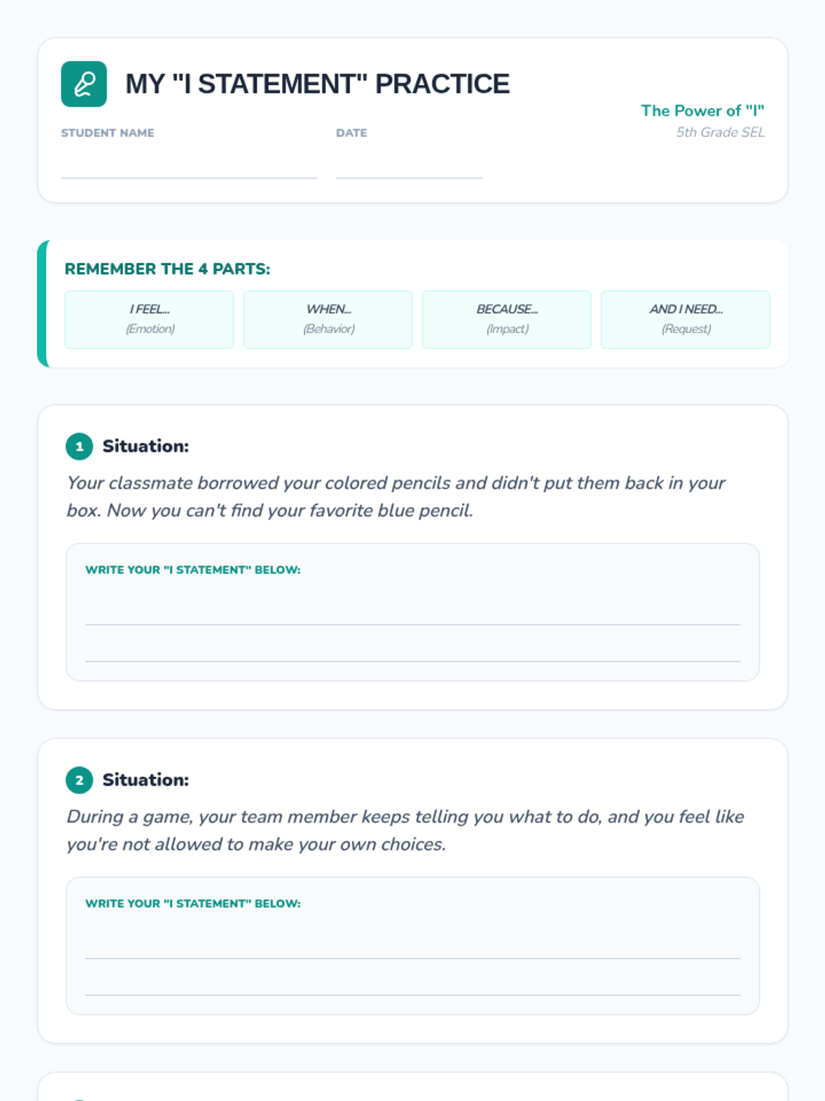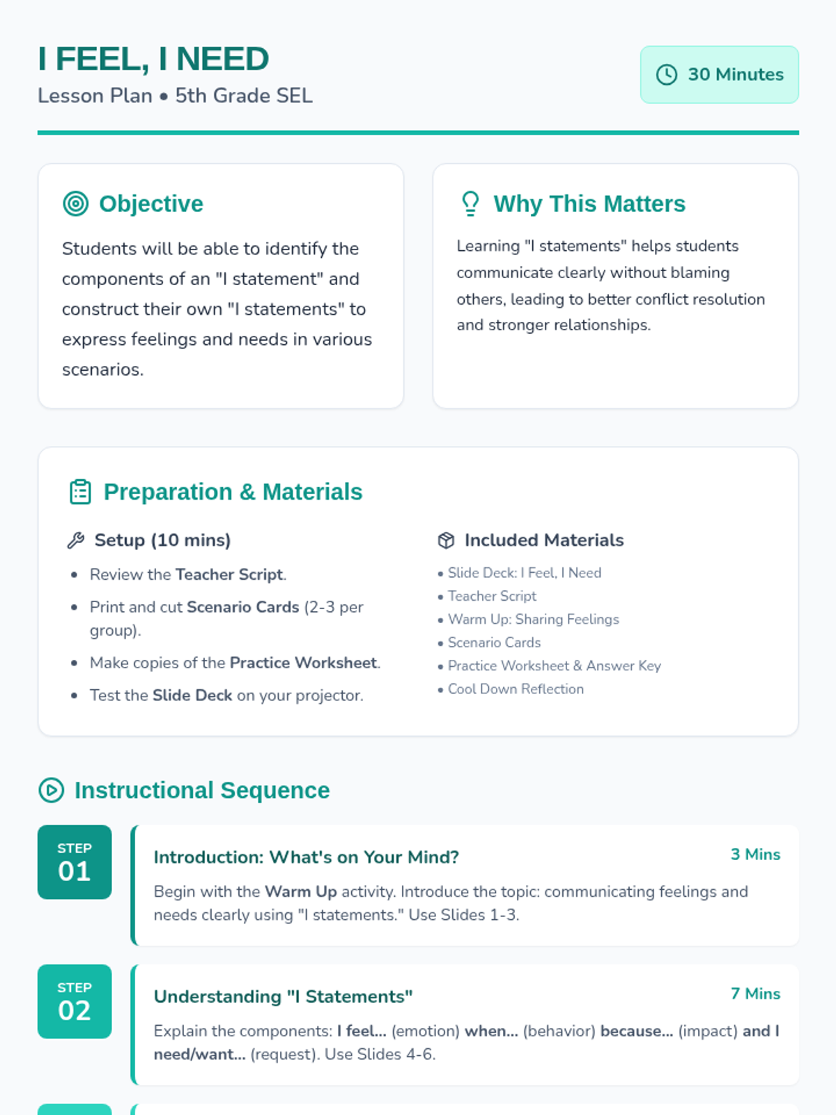 A 30-minute lesson for 5th-grade students on understanding and using 'I statements' to express feelings and needs constructively. This lesson empowers students to communicate more effectively and resolve conflicts peacefully.