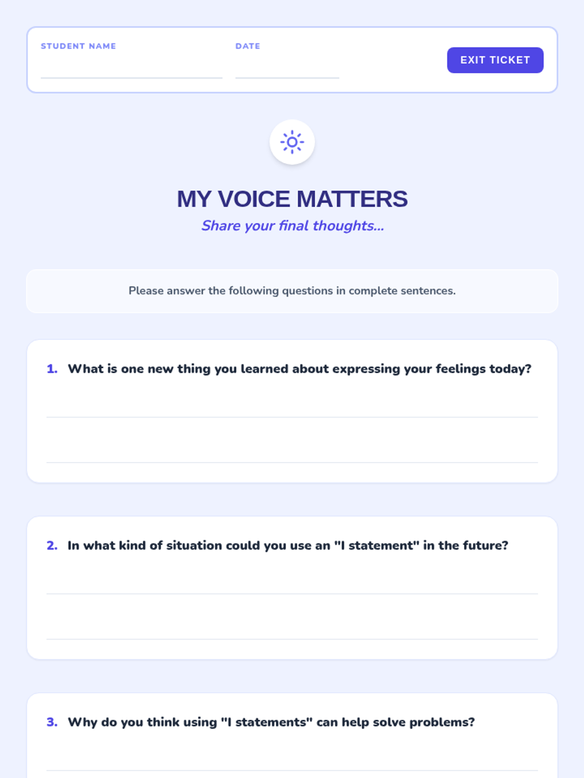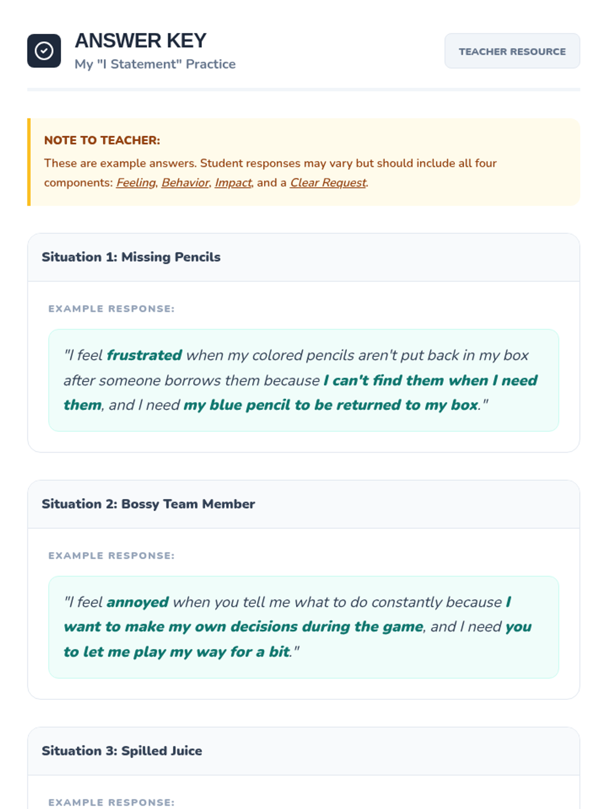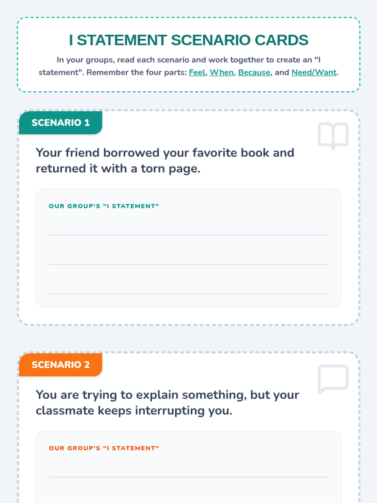 A 30-minute lesson for 5th-grade students on understanding and using 'I statements' to express feelings and needs constructively. This lesson empowers students to communicate more effectively and resolve conflicts peacefully.