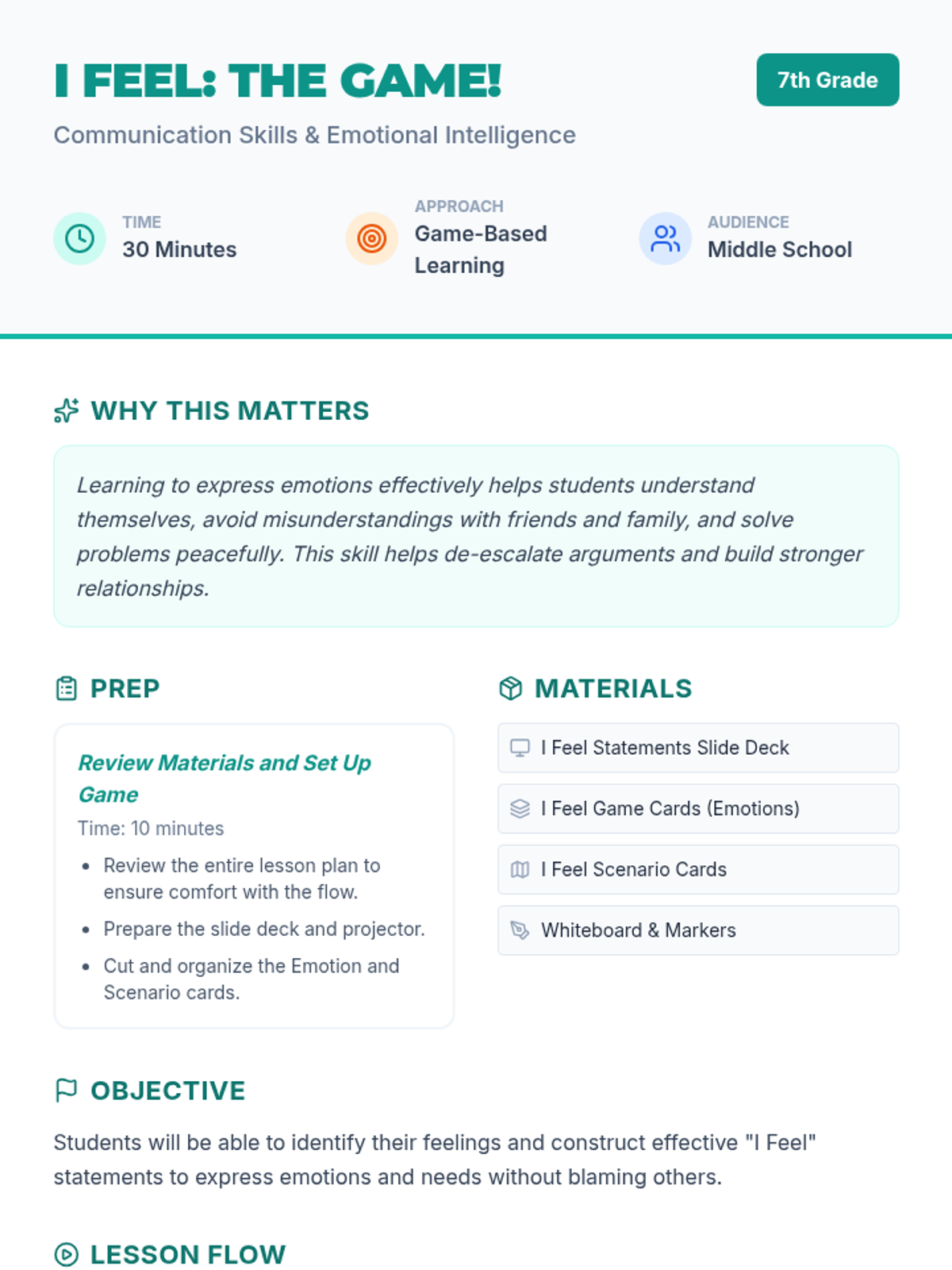 A 30-minute interactive lesson for 7th graders focused on identifying emotions and using the 'I feel' statement formula to communicate effectively and de-escalate conflict.