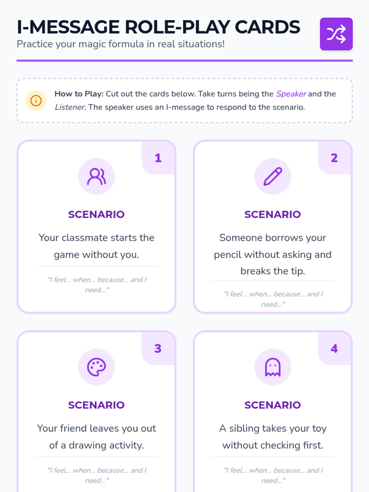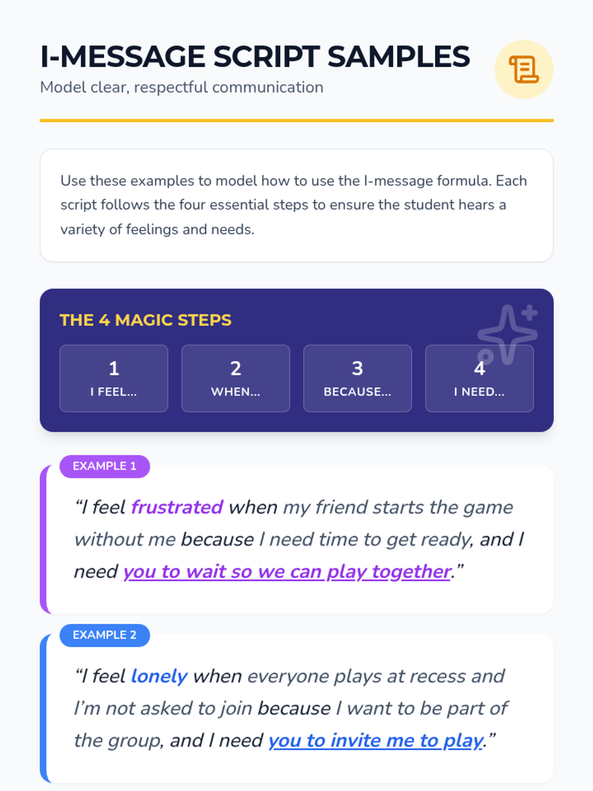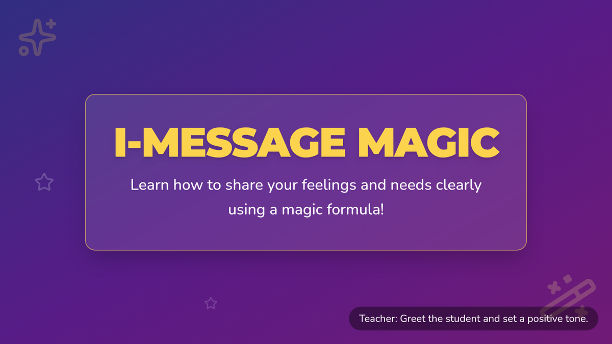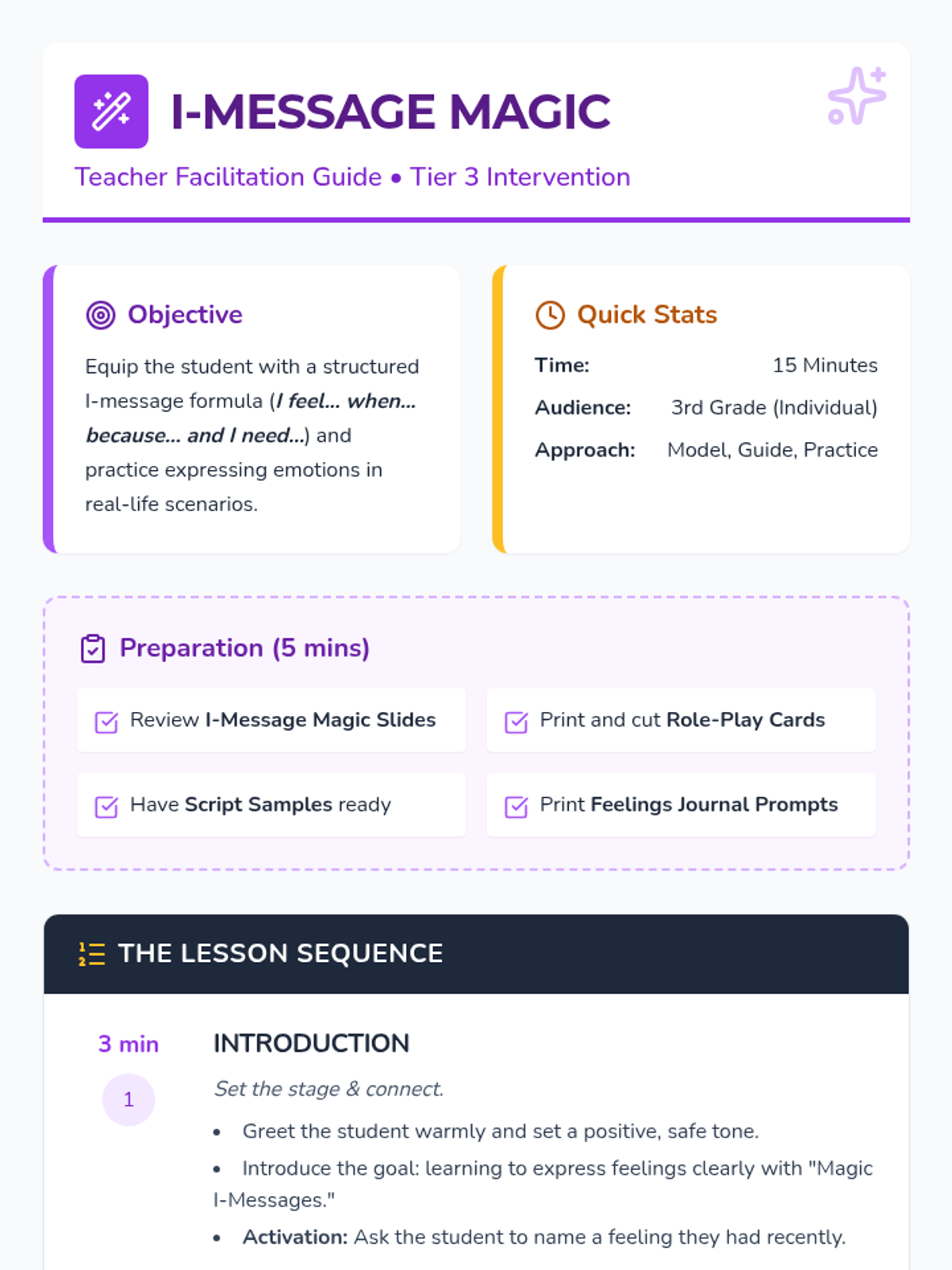 A focused 15-minute Tier 3 lesson for 3rd grade students to learn and practice I-messages. This session uses a 'magic' theme to help students transform frustration into clear communication using a structured formula.