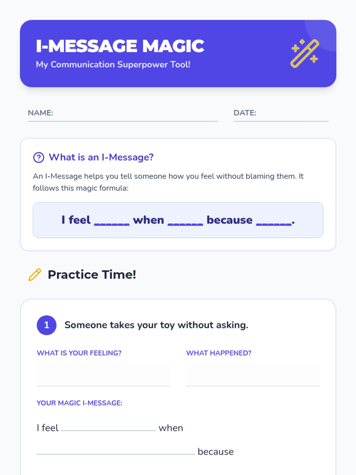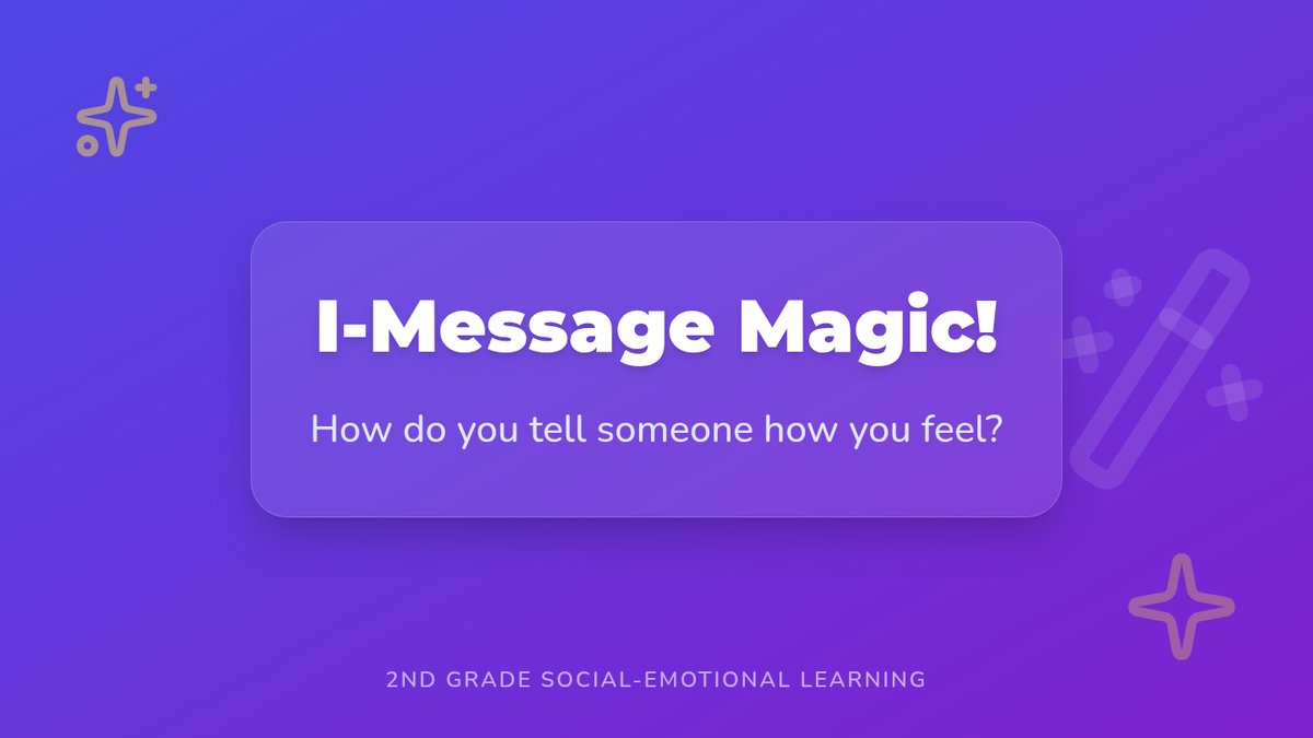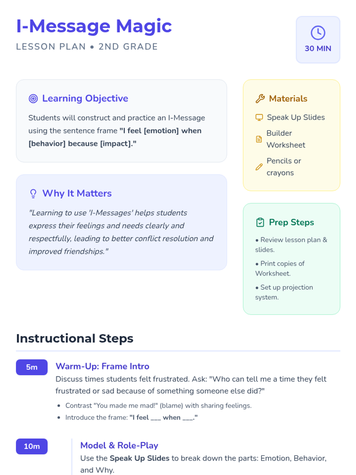 A 30-minute lesson for 2nd graders that teaches the 'I-Message' formula to express feelings and needs assertively. Students will practice through modeling, role-play, and a builder worksheet.