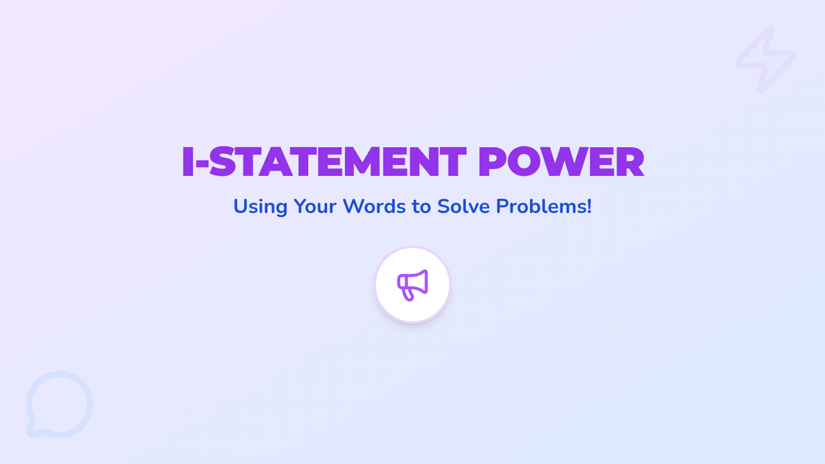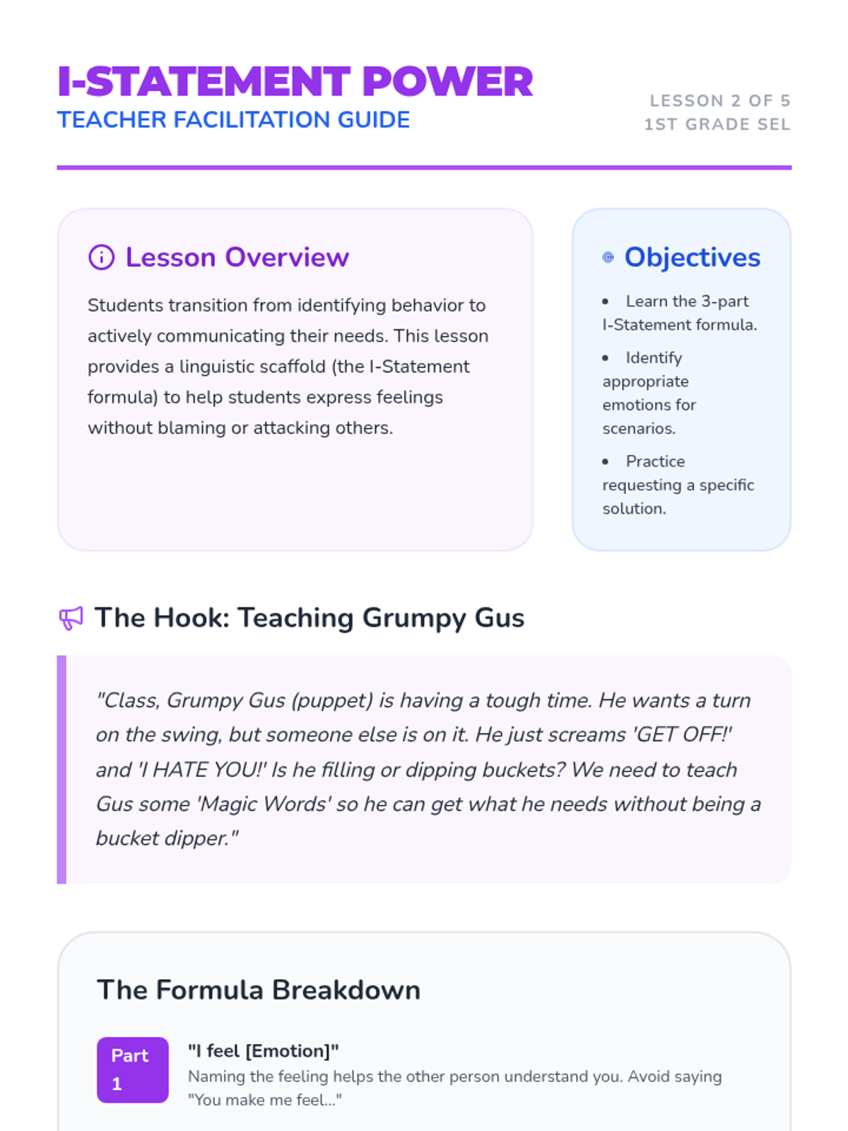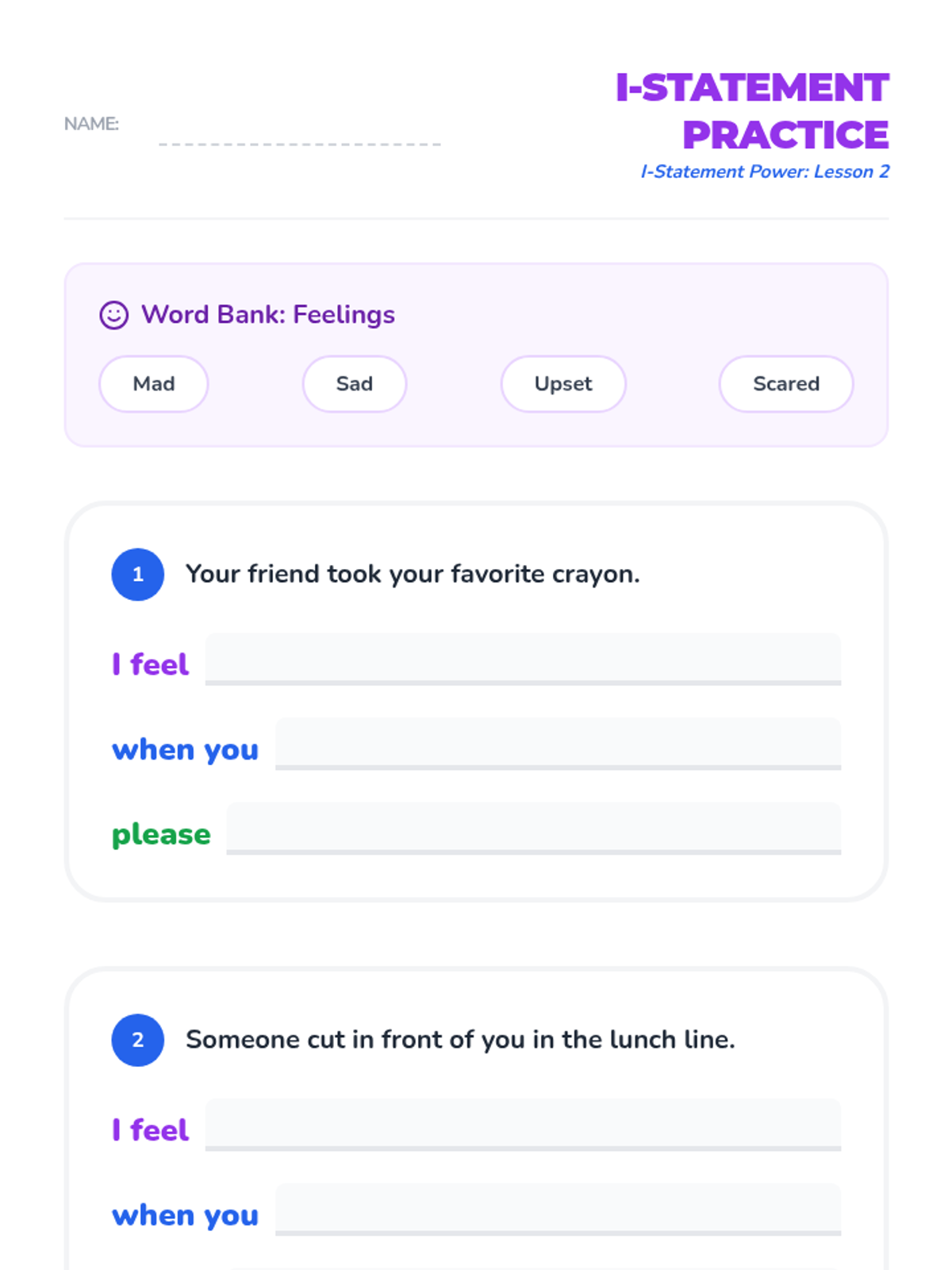 Students learn the formula 'I feel [emotion] when you [action], please [solution].' They practice filling in the blanks for common playground conflicts like cutting in line or taking a toy.