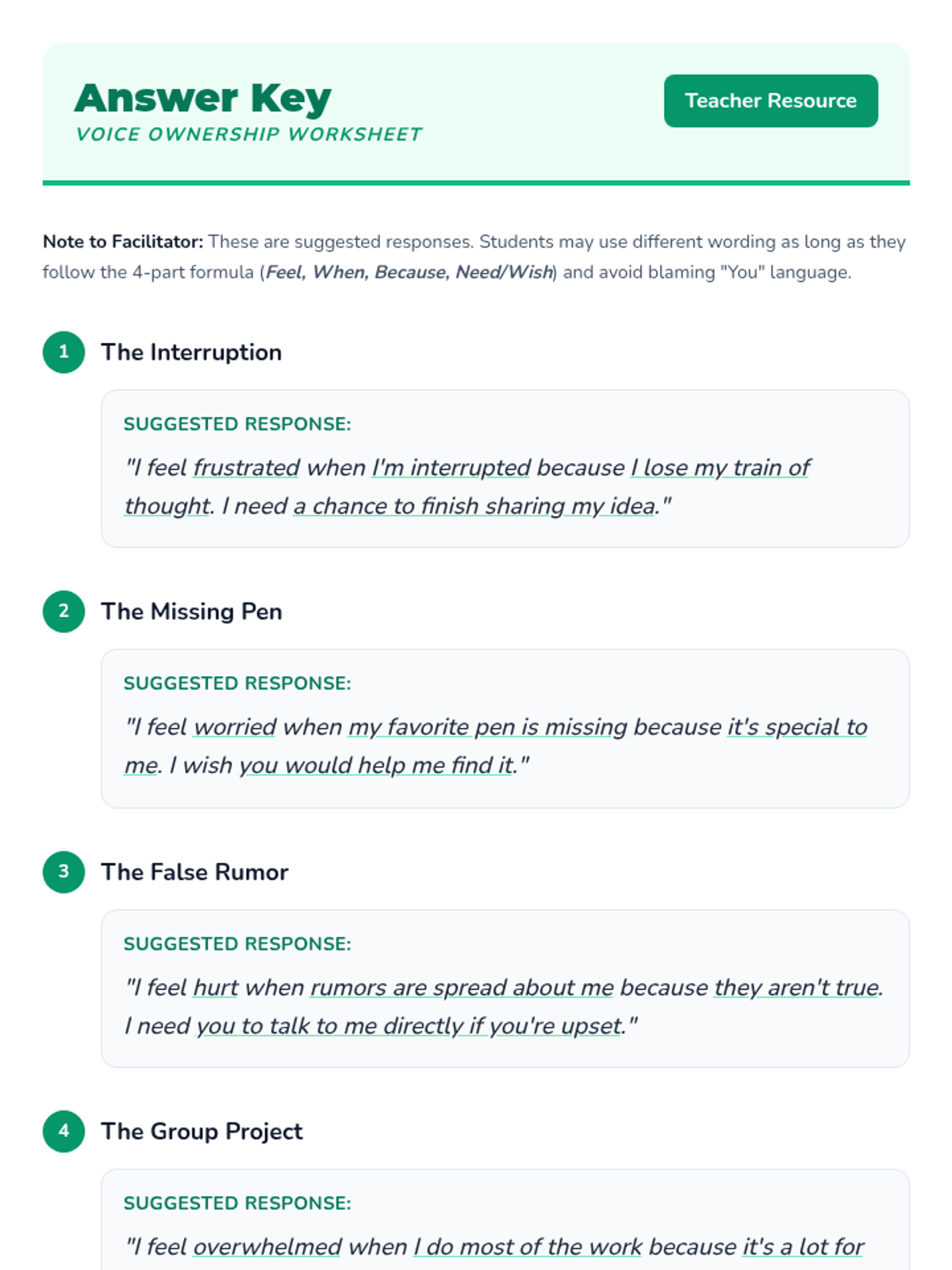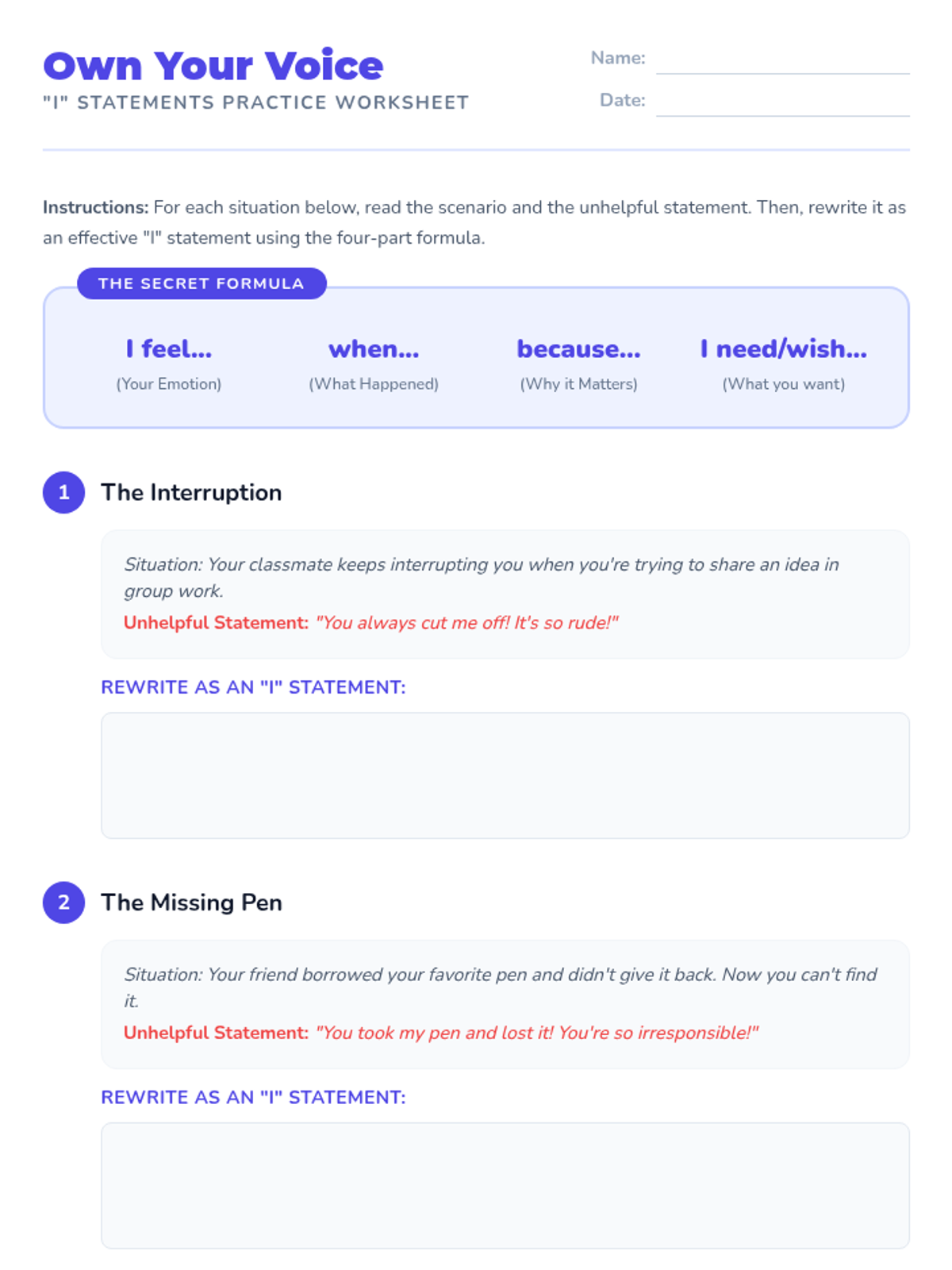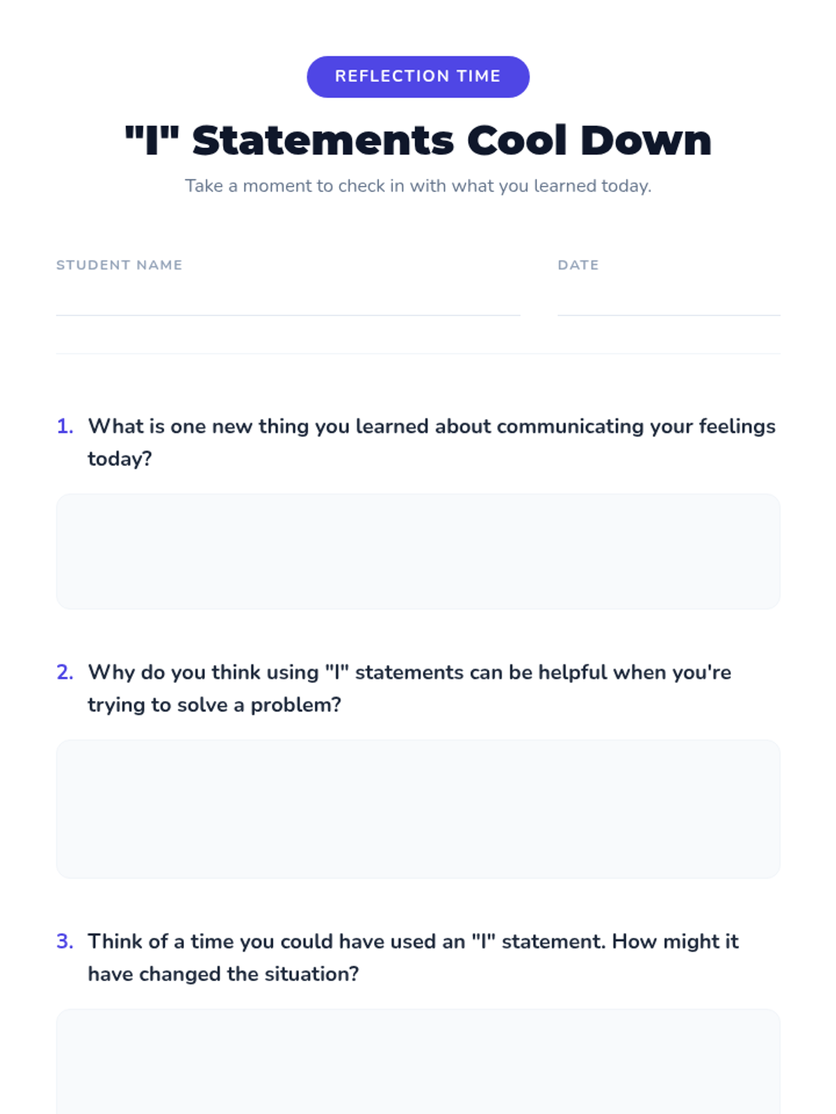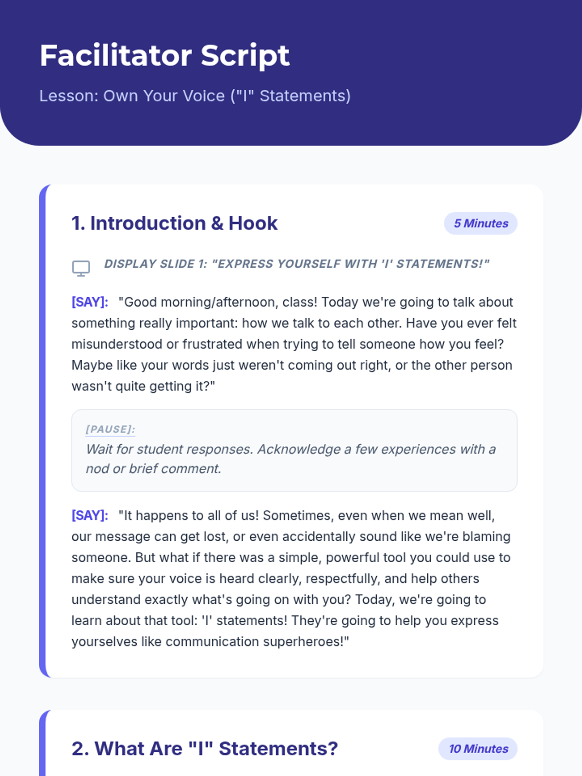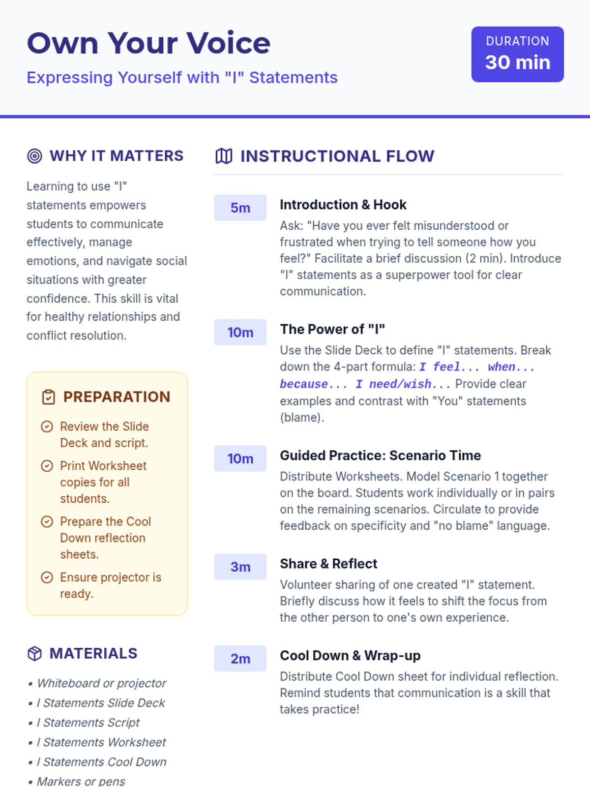 A 30-minute introductory lesson on using 'I' statements to communicate feelings and needs effectively, featuring direct instruction, guided practice, and personal reflection.