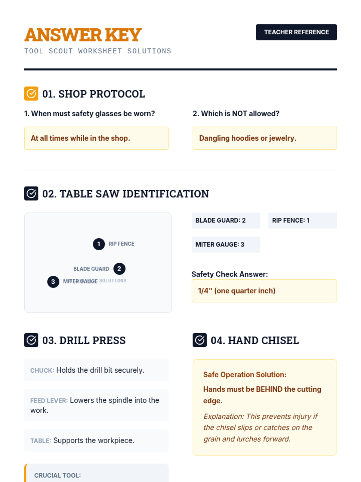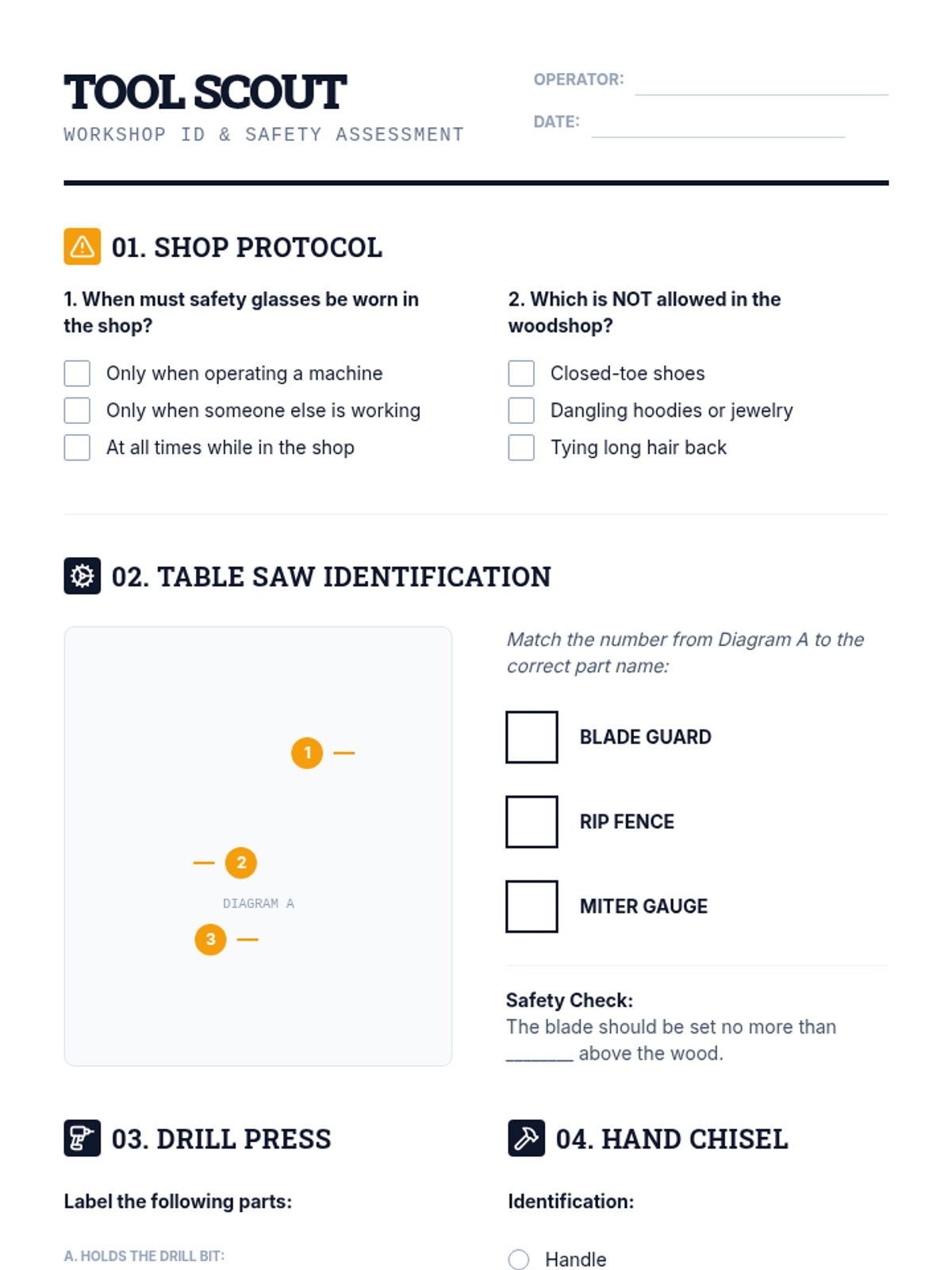 A comprehensive introduction to workshop safety and tool identification, focusing on the table saw, drill press, and hand chisels. Students learn critical safety protocols and part names for essential woodworking machinery.