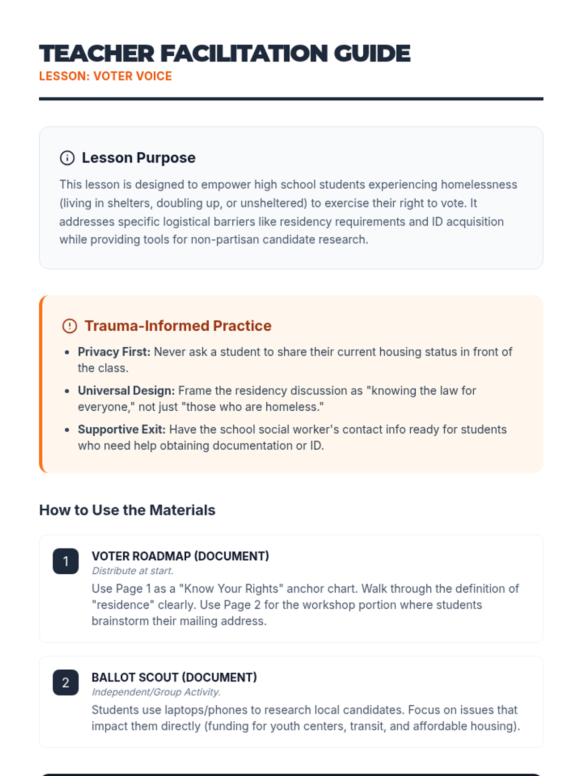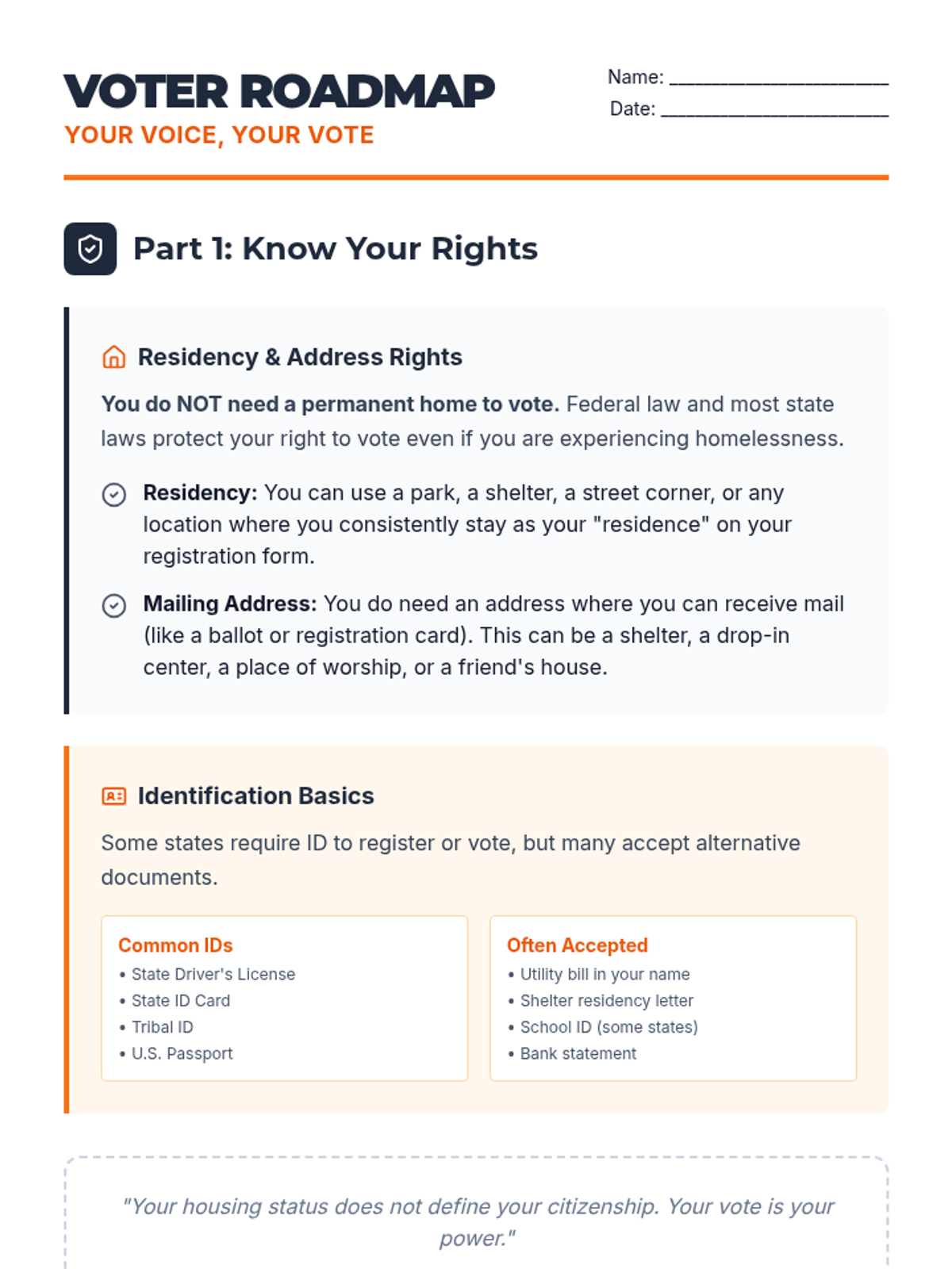 A comprehensive guide for students experiencing homelessness to navigate voter registration, understand their residency rights, and practice informed voting through research and mock ballots.