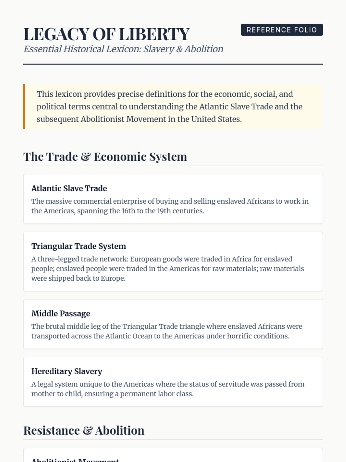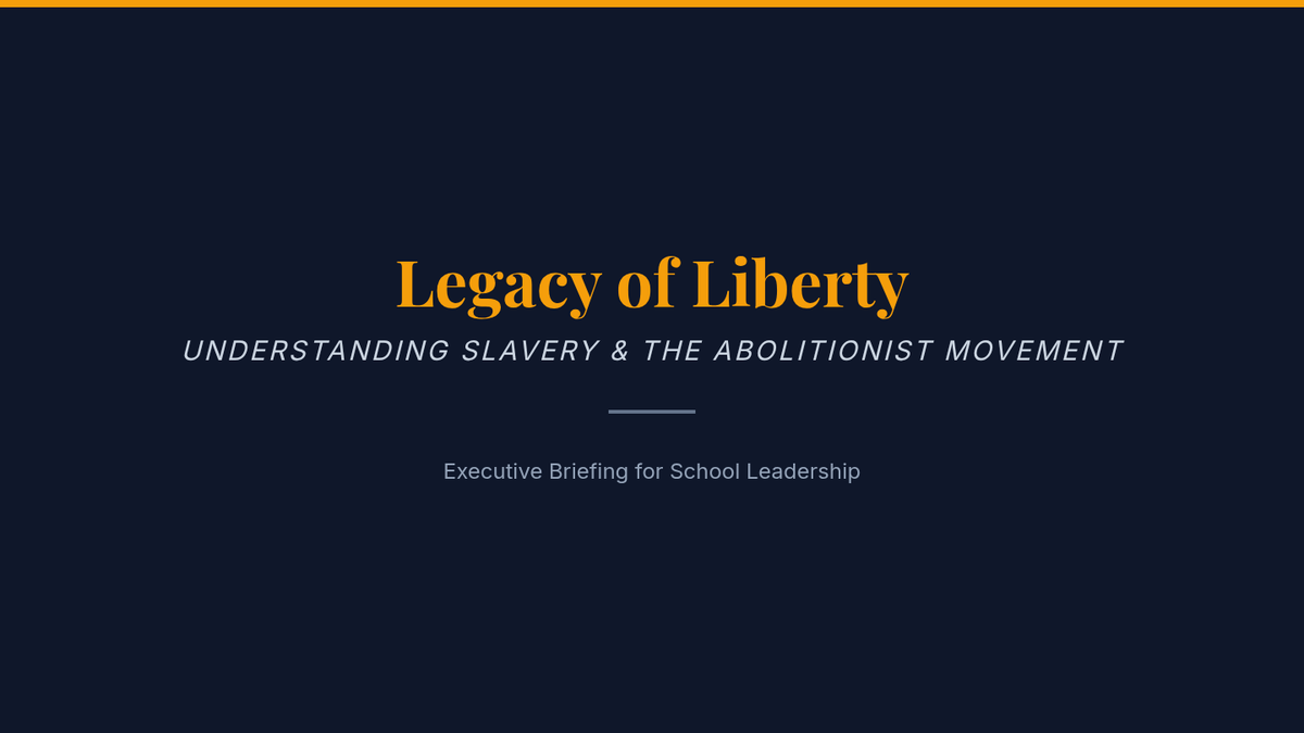 A comprehensive resource bundle for school leaders covering the history of the Atlantic Slave Trade and the Abolitionist Movement, featuring a detailed reference guide and a visual infographic.