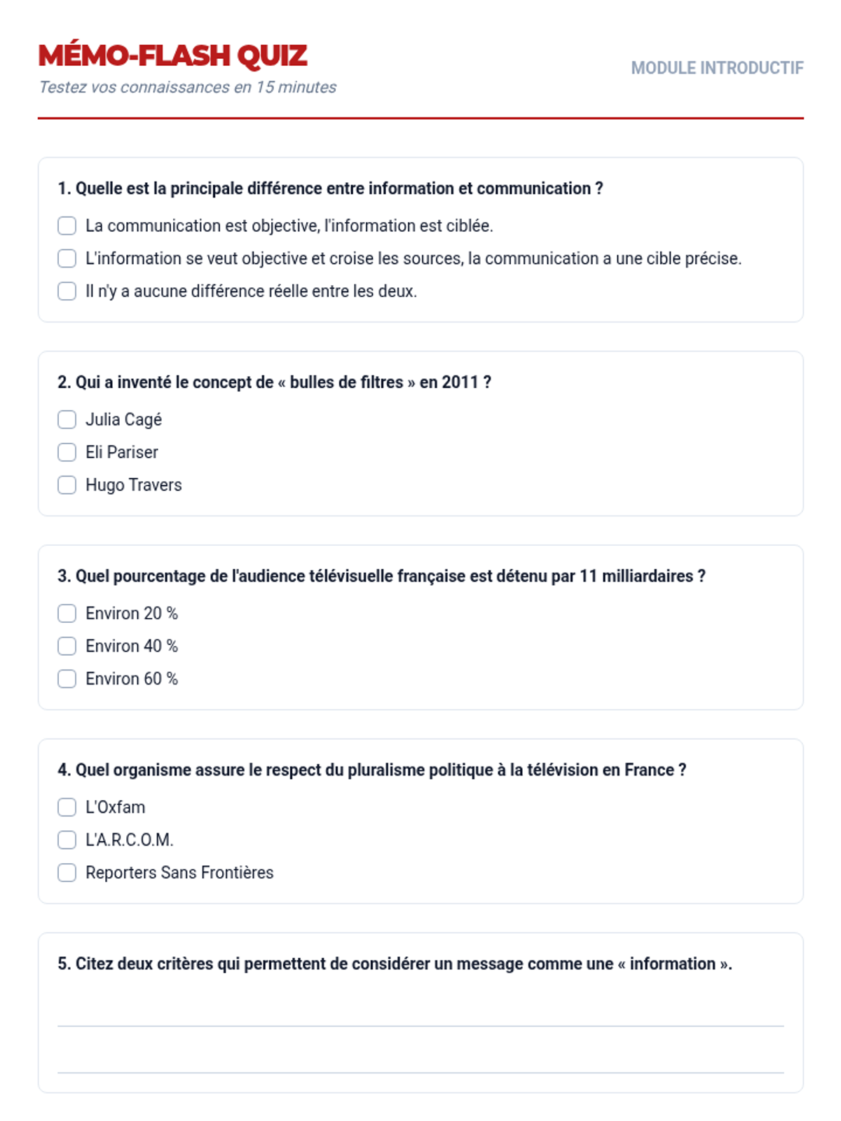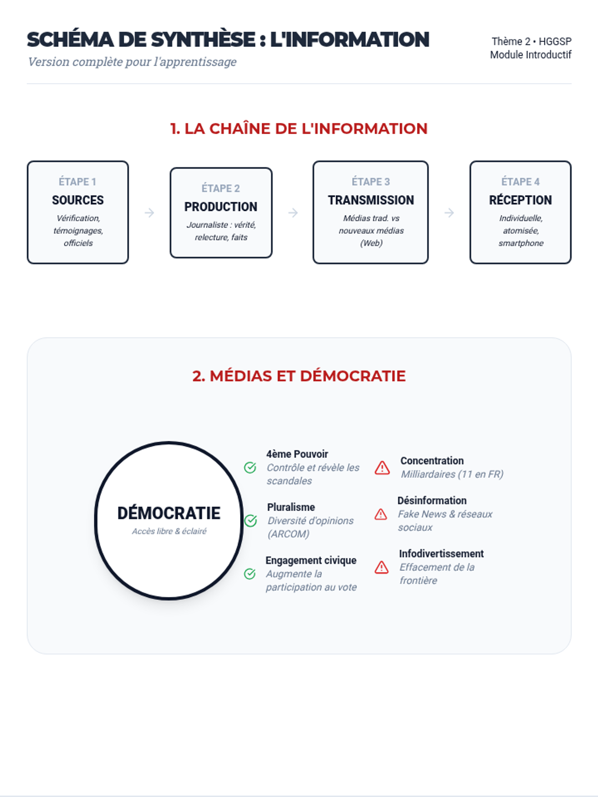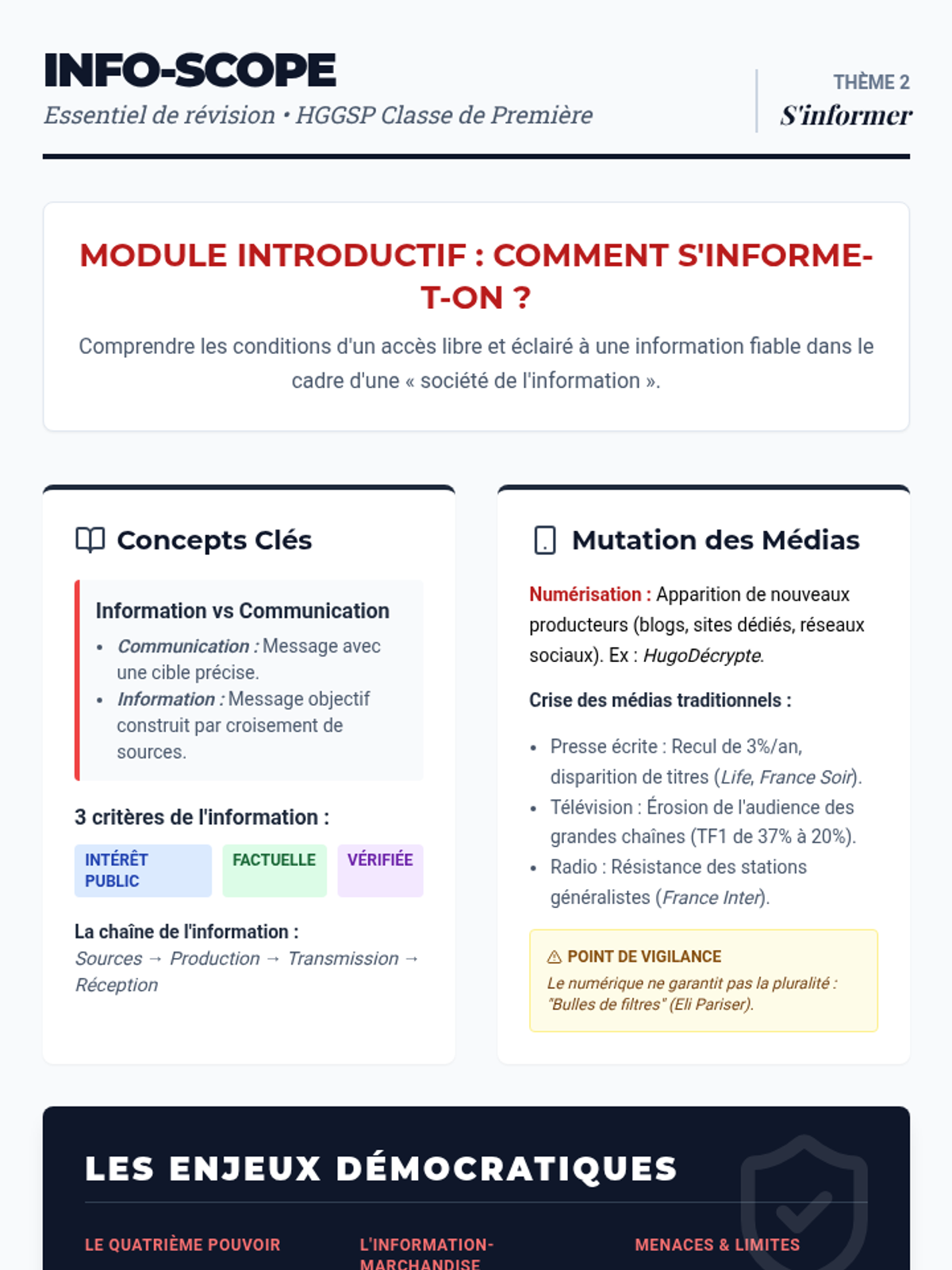 Ce module introductif permet d'appréhender les notions fondamentales de l'information, de comprendre l'évolution des médias et d'analyser les enjeux démocratiques liés à l'accès et à la consommation de l'information.