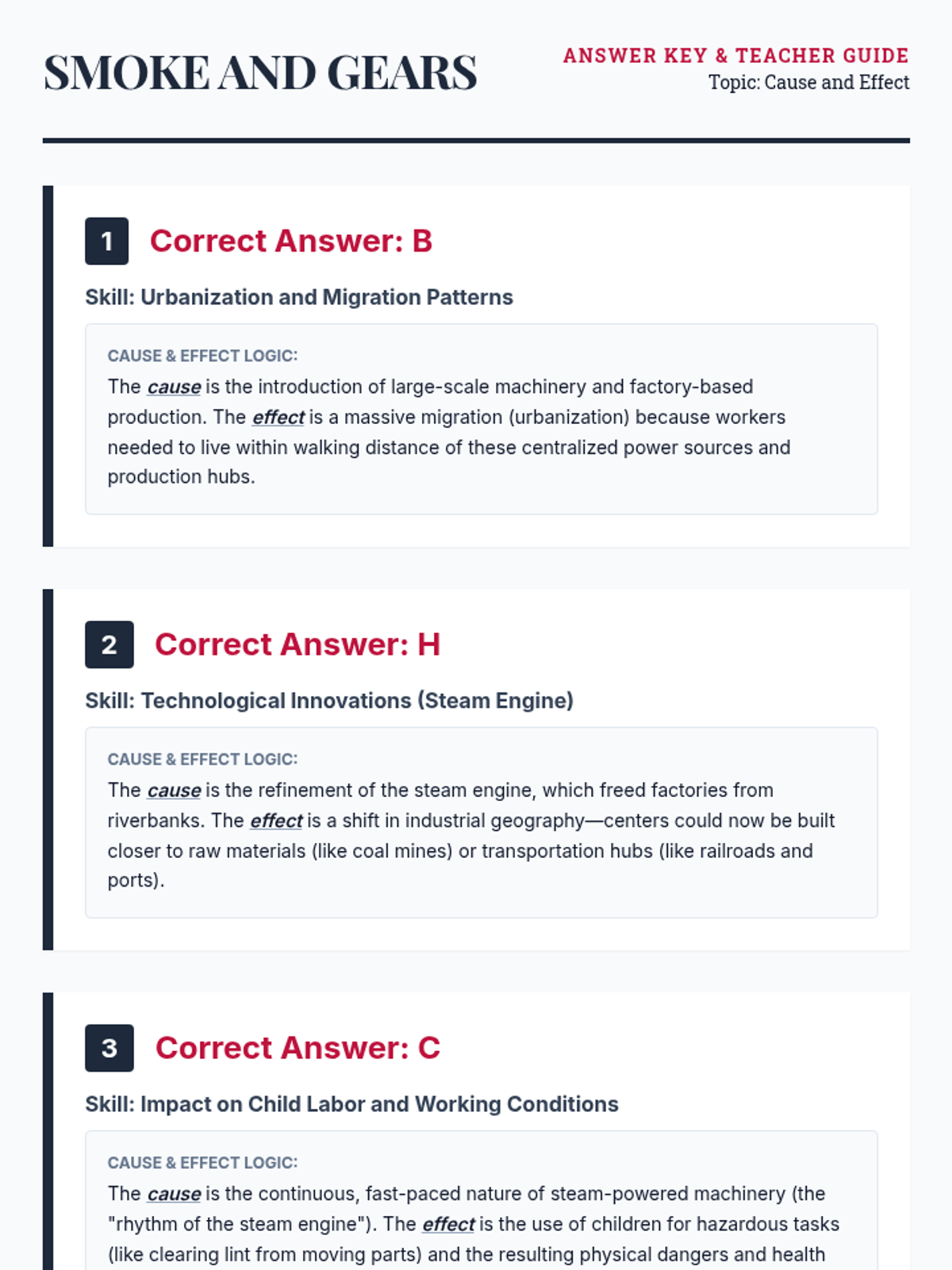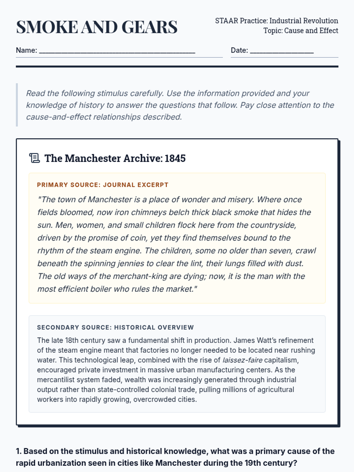A focused practice session on the Industrial Revolution, targeting STAAR-aligned cause-and-effect skills regarding urbanization, technology, labor, and economic shifts.