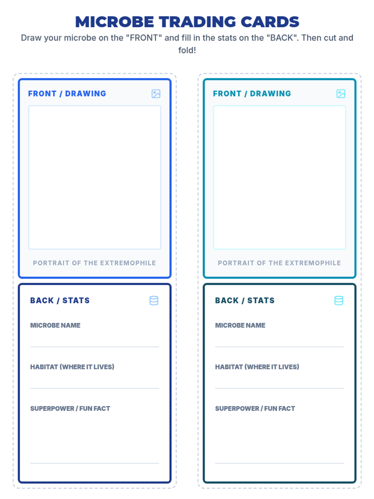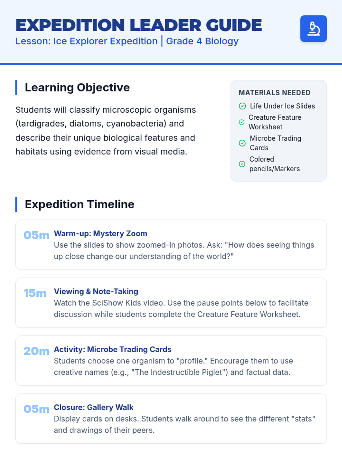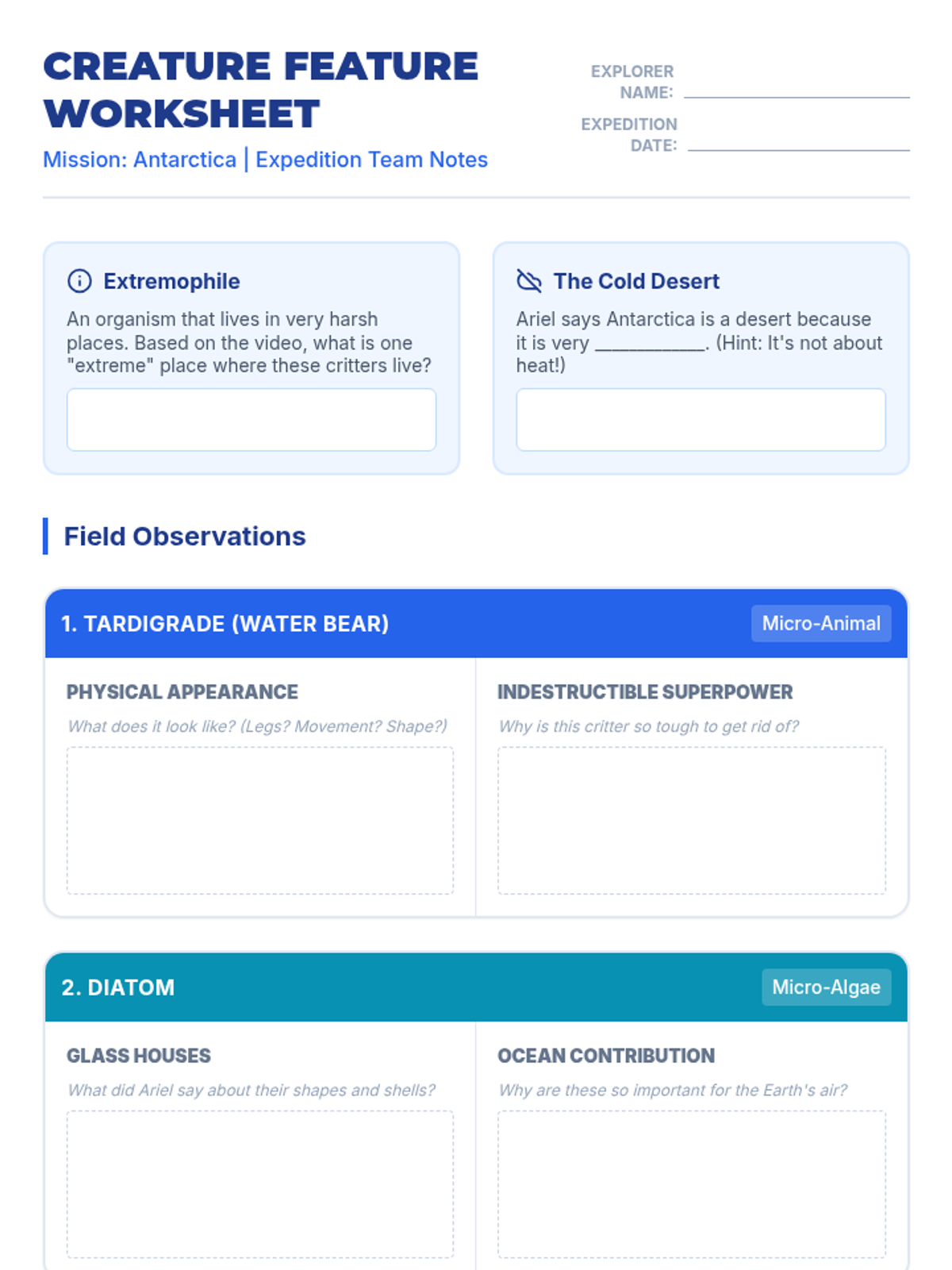 A 4th-grade biology lesson exploring extremophiles in Antarctica through a SciShow Kids video and creative trading card activity. Students will classify tardigrades, diatoms, and cyanobacteria while learning about their unique adaptations.