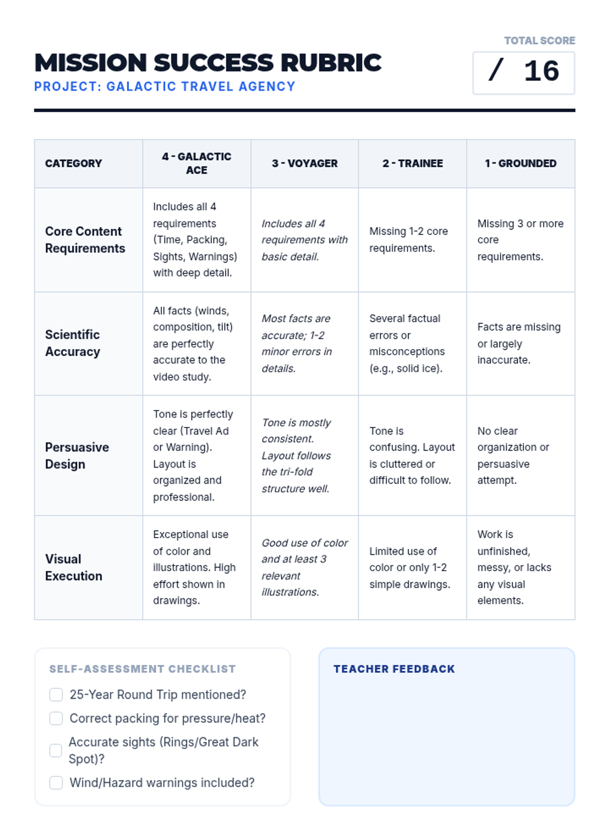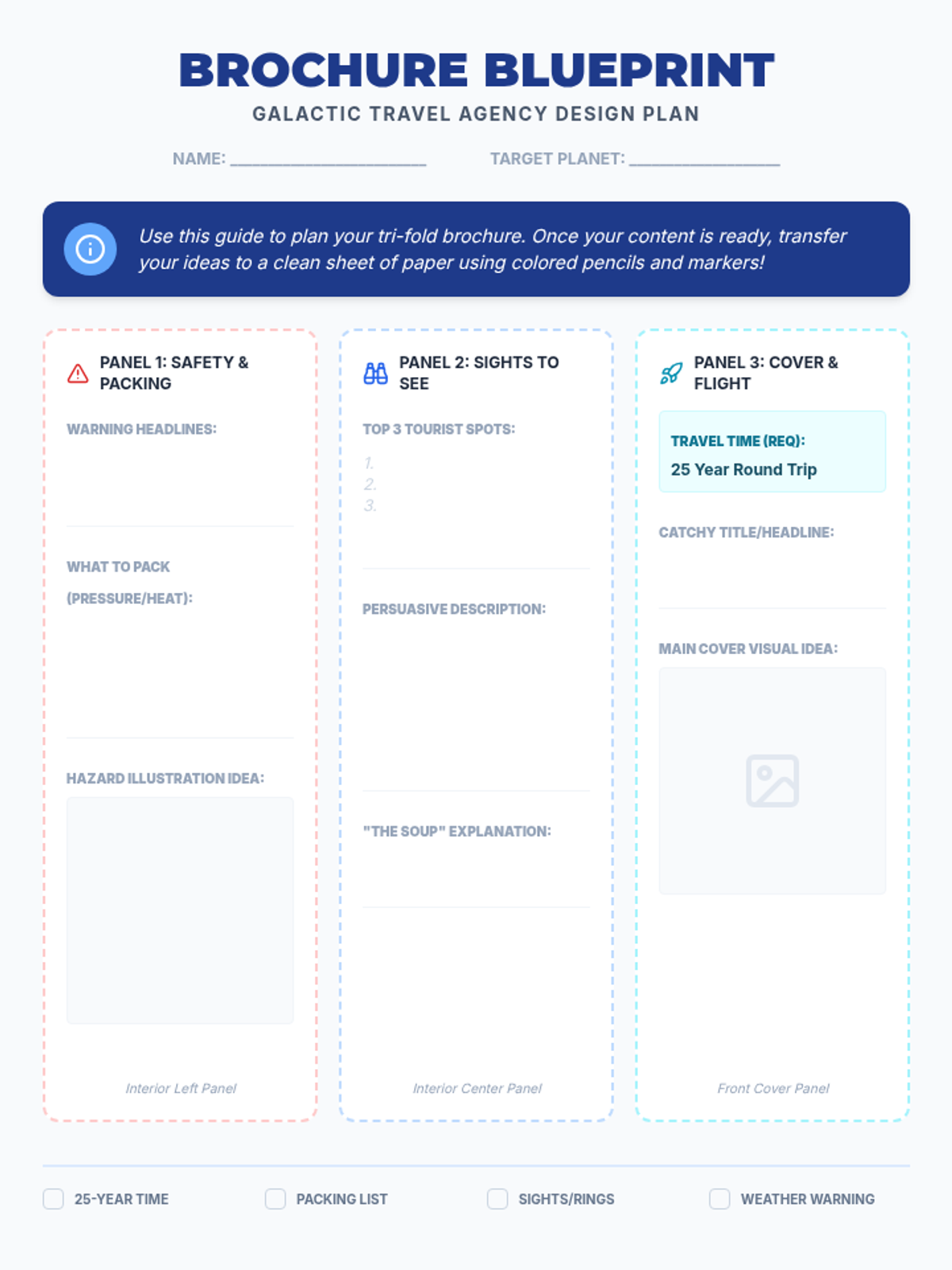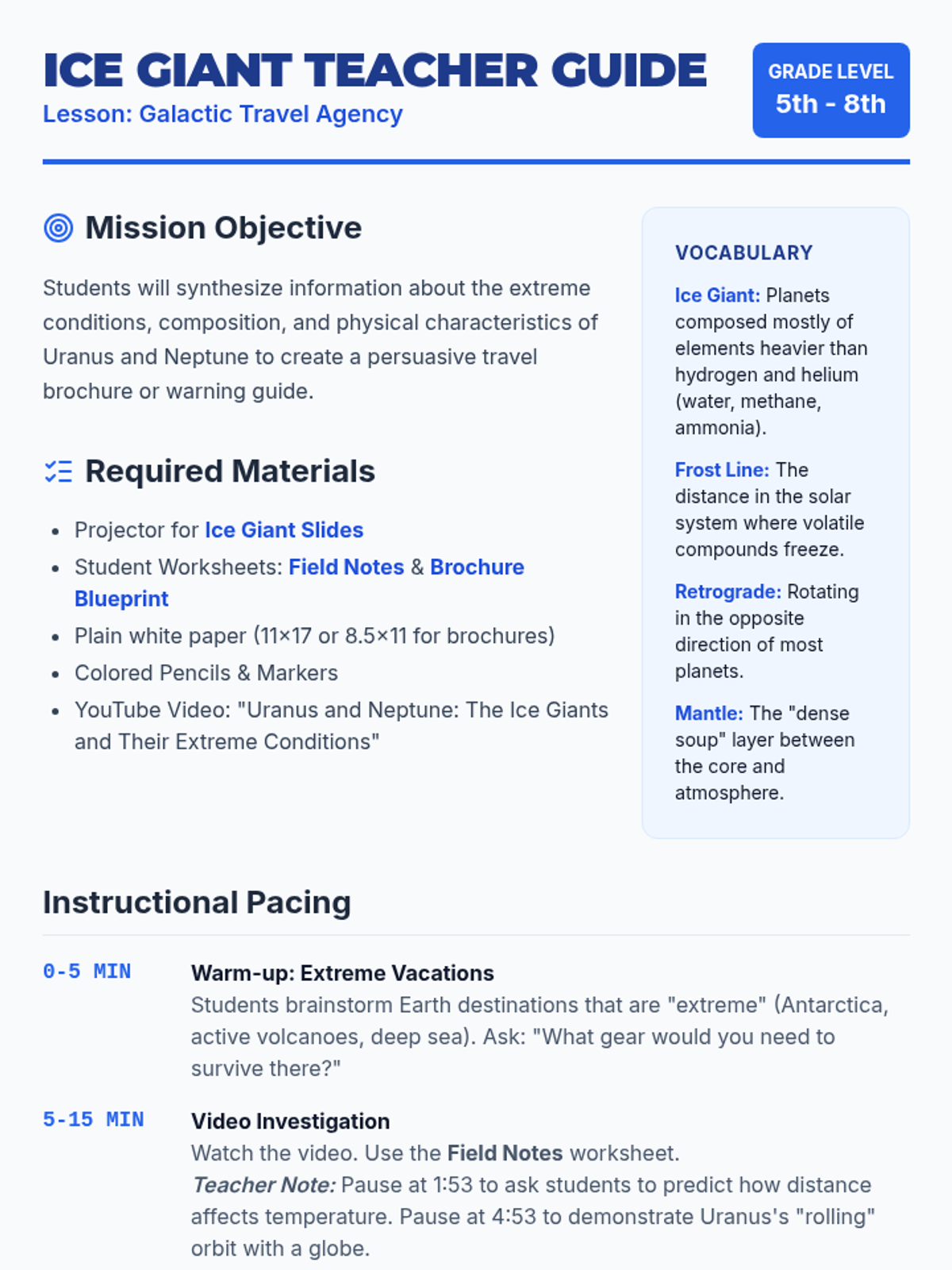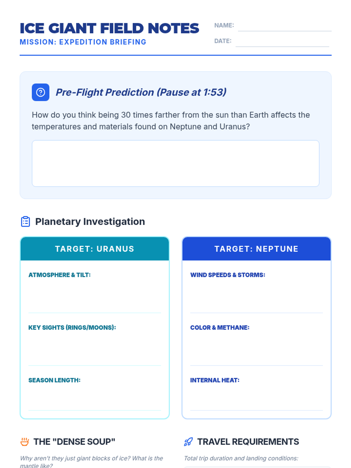 Students will explore the extreme conditions of Uranus and Neptune, the solar system's 'Ice Giants.' Through a video study and a creative design project, they will synthesize scientific facts about distance, composition, and weather to create a persuasive travel brochure or warning guide for future space travelers.