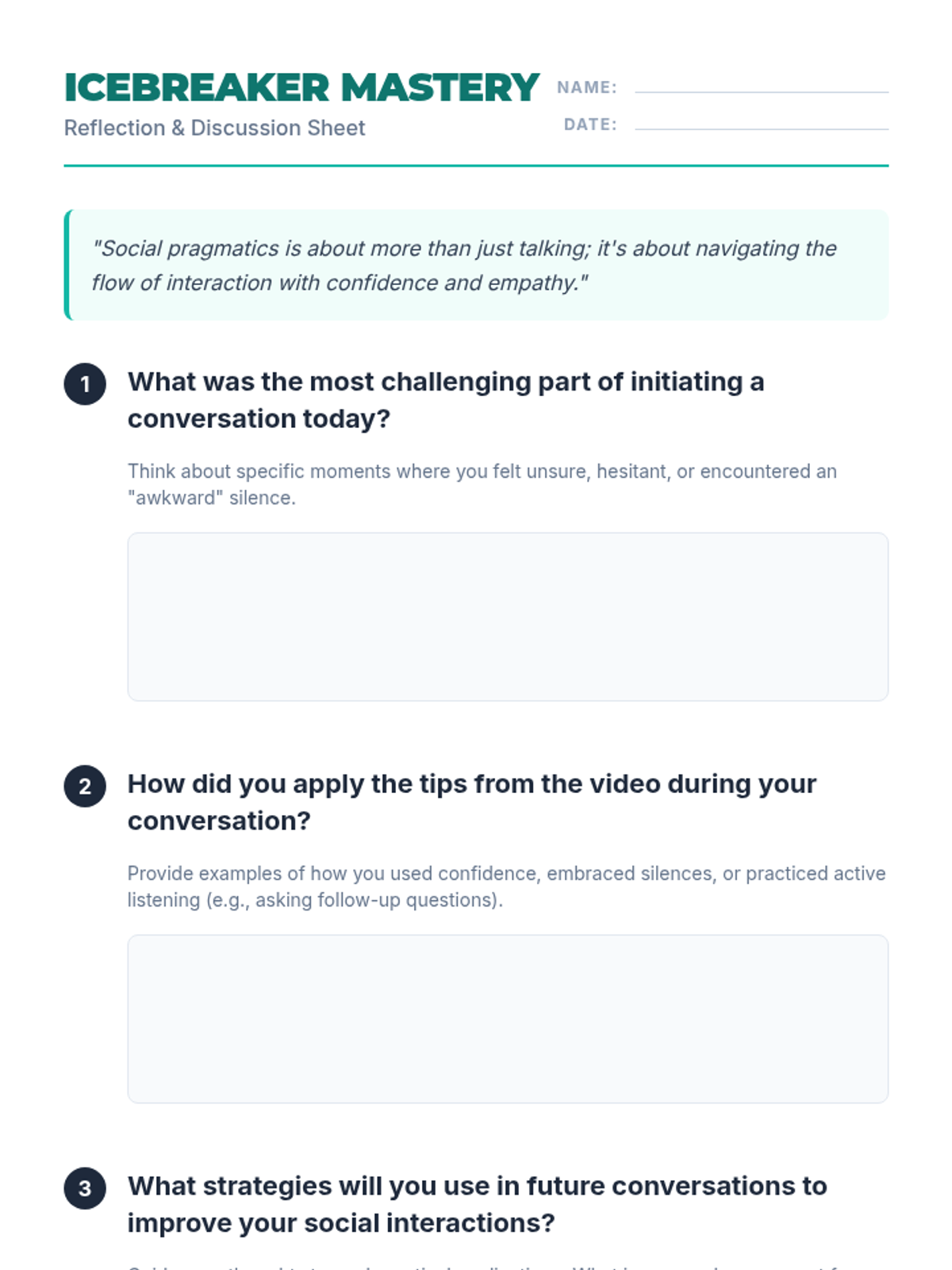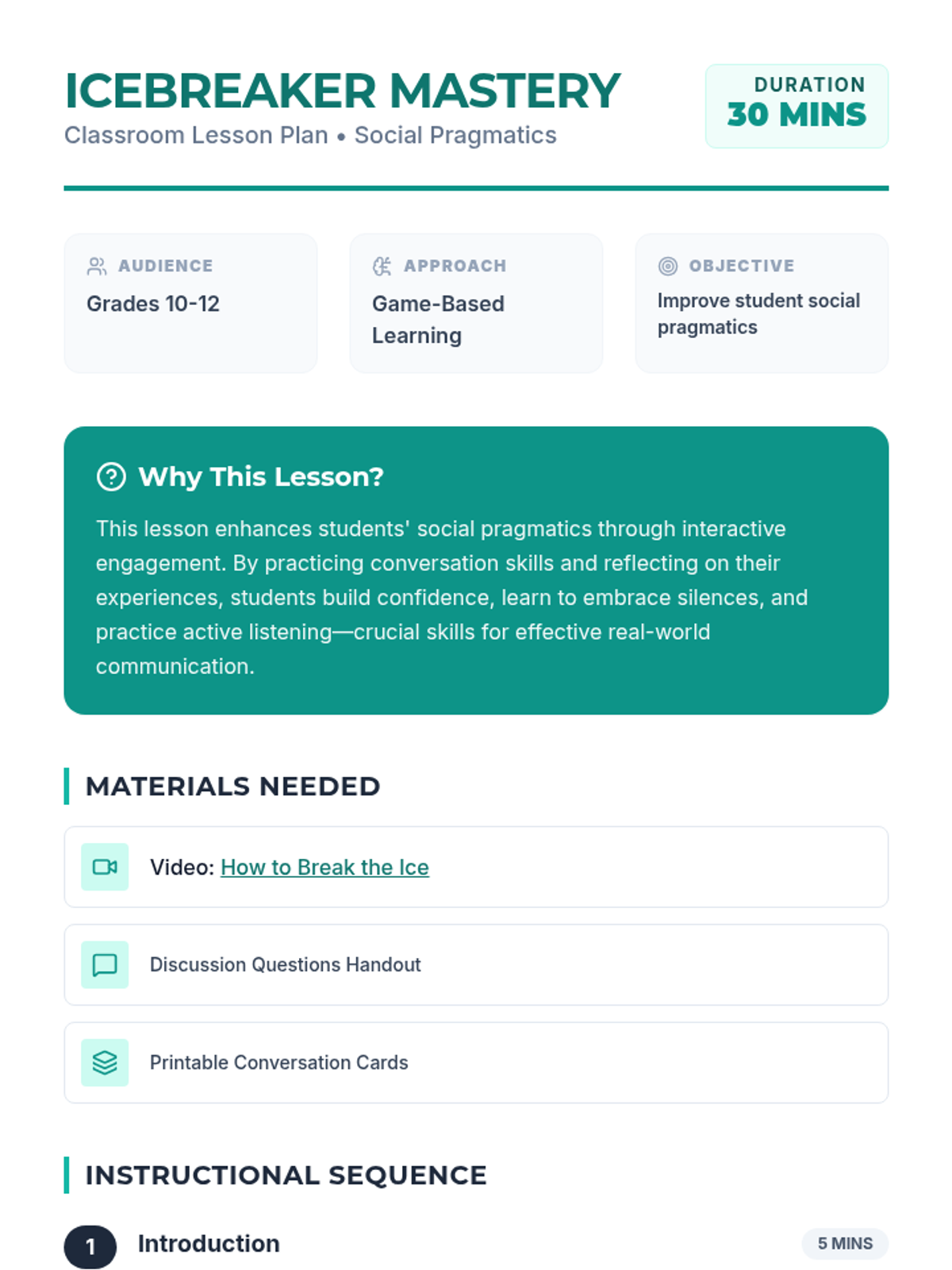 A game-based social pragmatics lesson for grades 10-12 designed to improve conversation skills, active listening, and confidence through interactive activities and reflection.