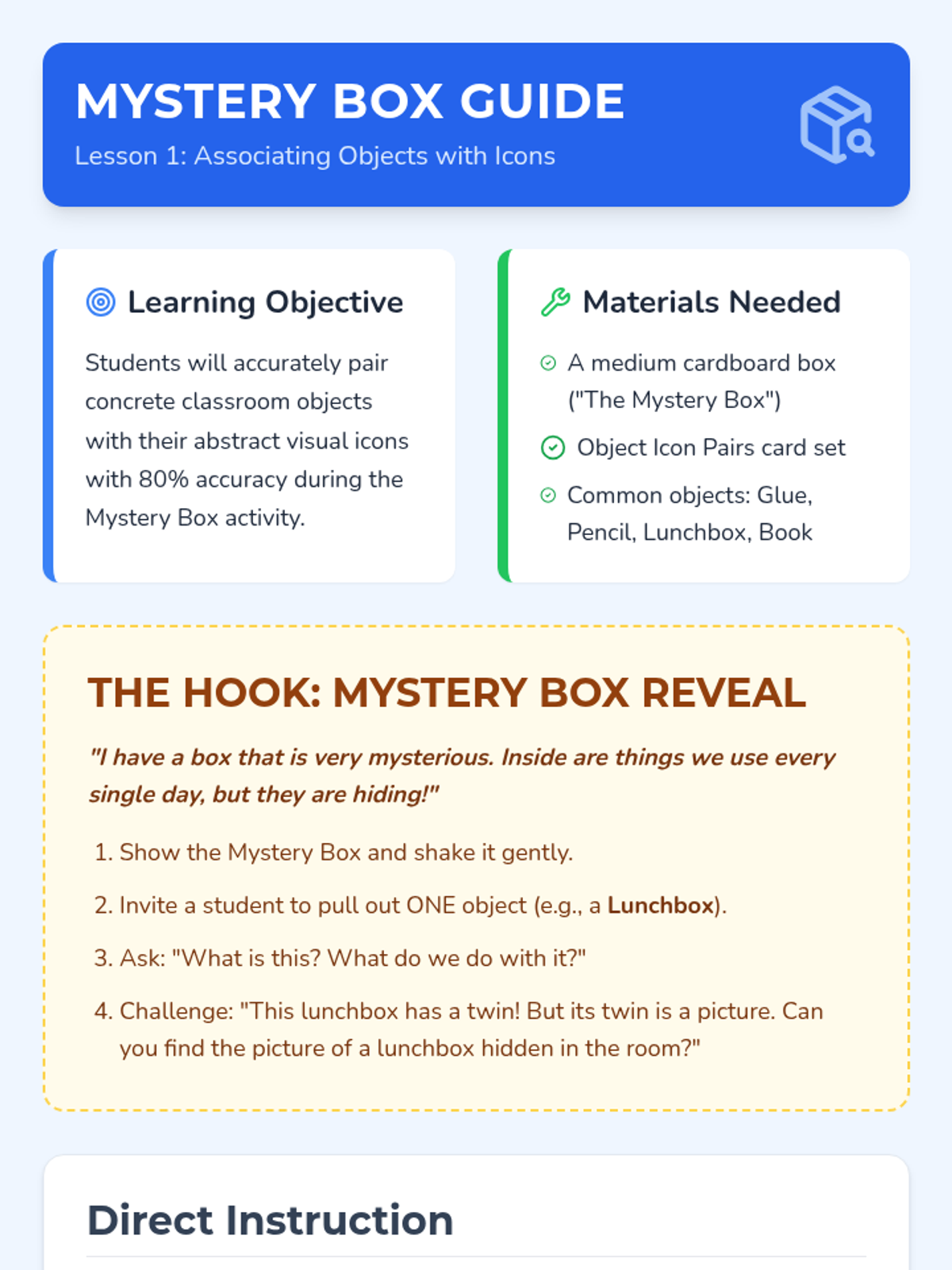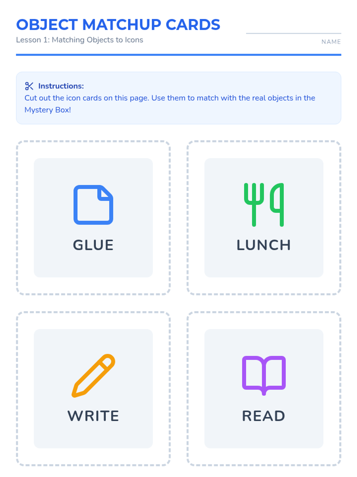 Students bridge the gap between physical objects and abstract visual representations by matching classroom items to their corresponding icons.