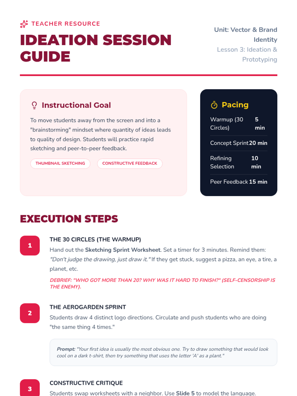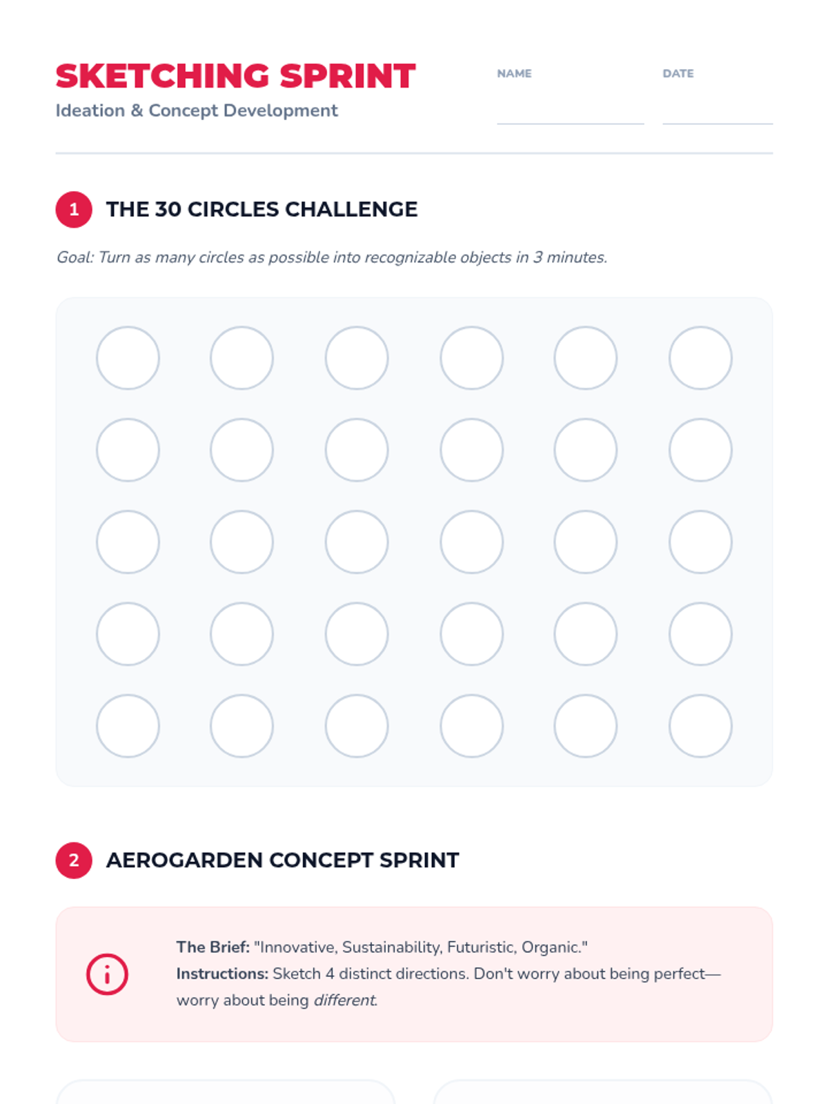 A workshop focused on rapid ideation and sketching, moving from the '30 Circles Challenge' to refined logo concepts and peer feedback.