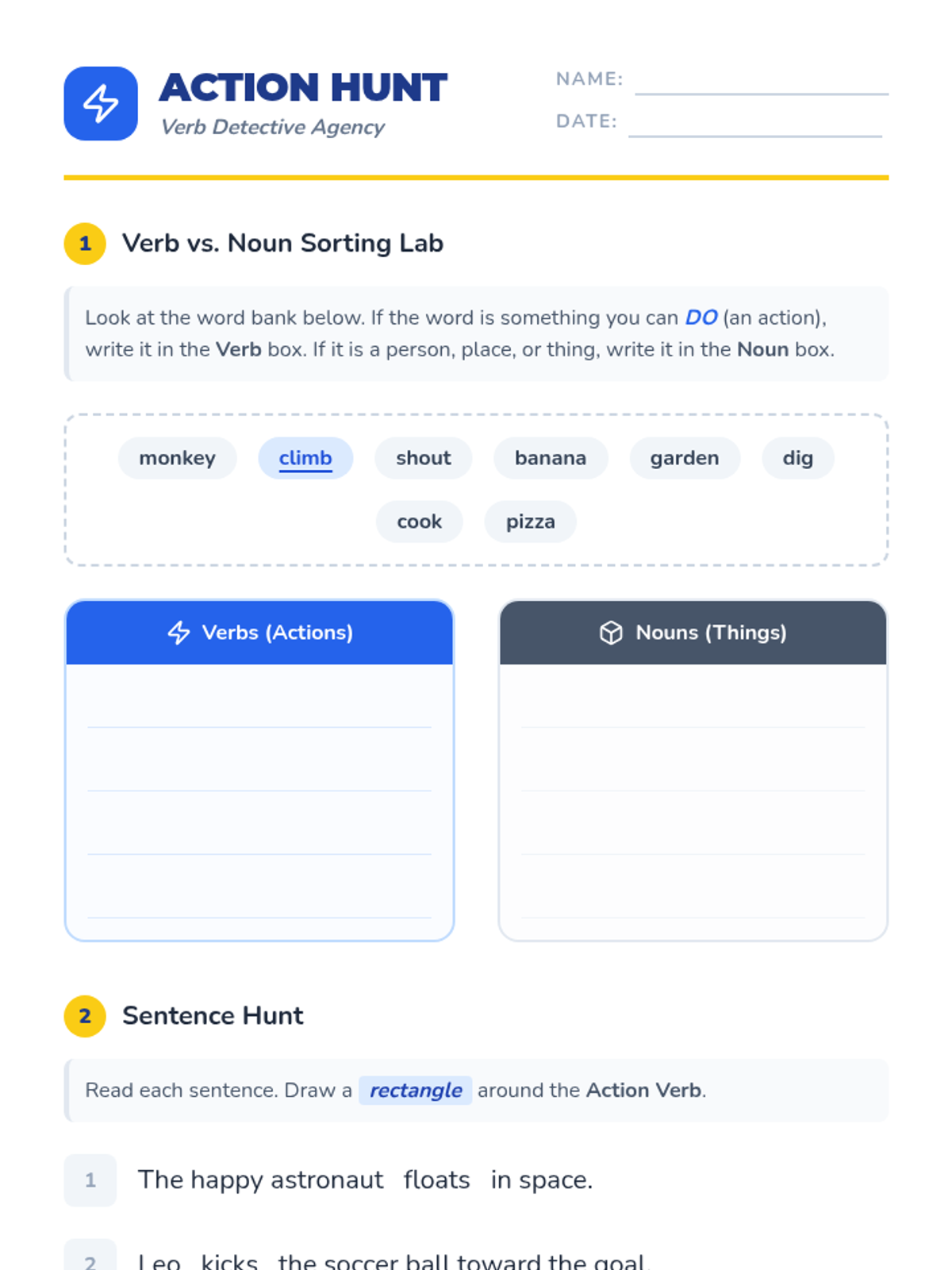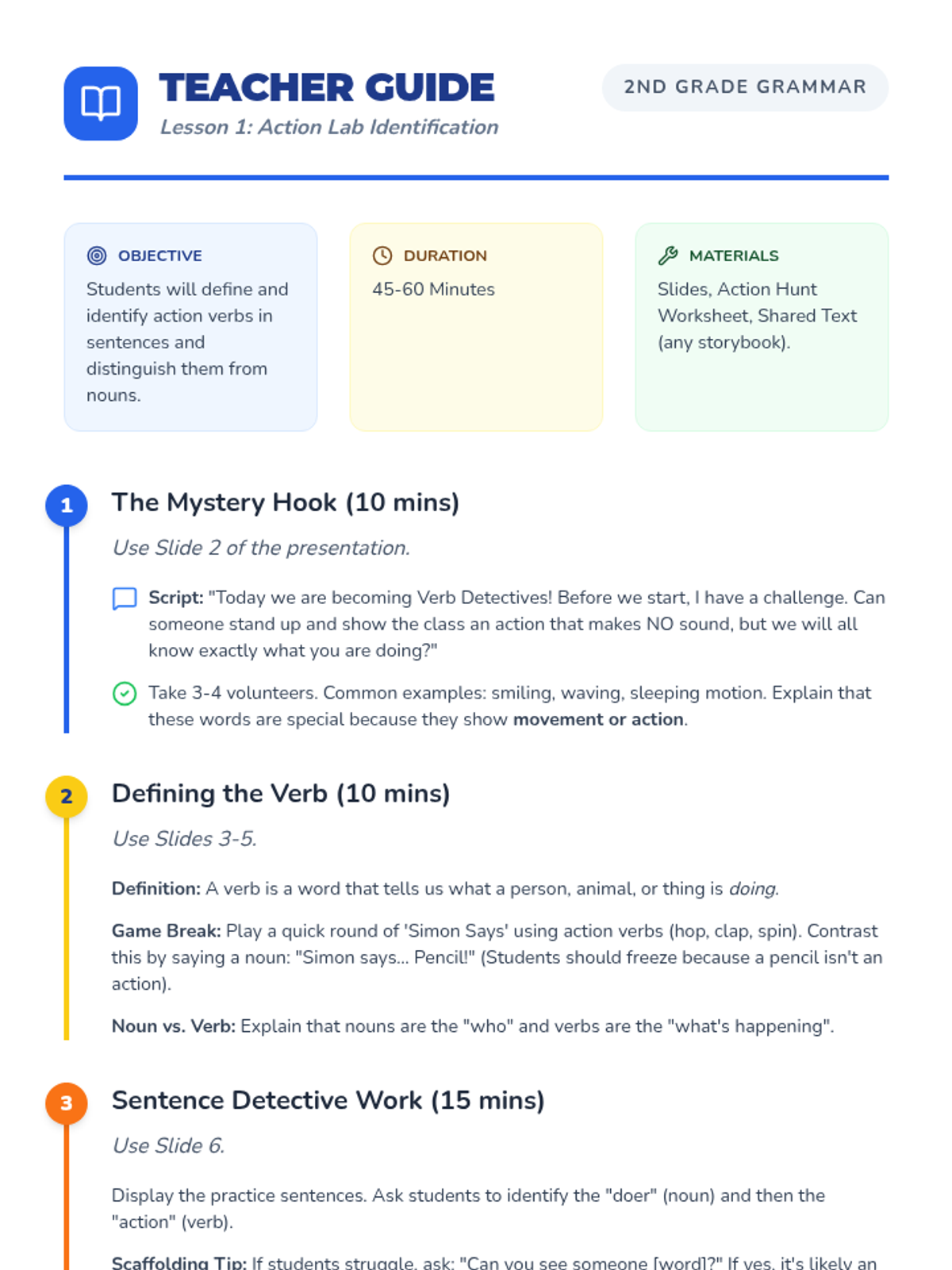 Students identify physical actions through a 'Simon Says' variation and hunt for action words in texts, distinguishing them from nouns.