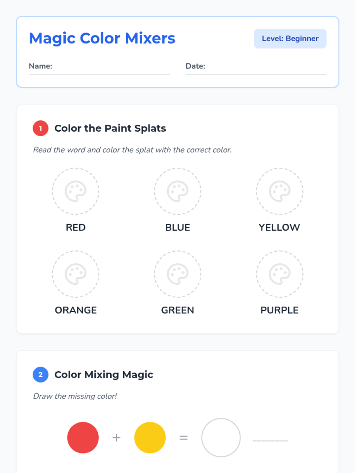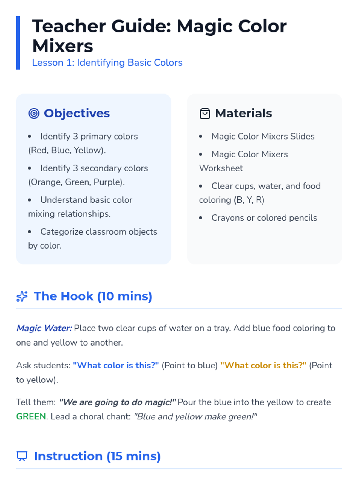 Students learn primary and secondary colors through sorting activities and visual media. They practice grouping objects by color and saying the color names aloud.