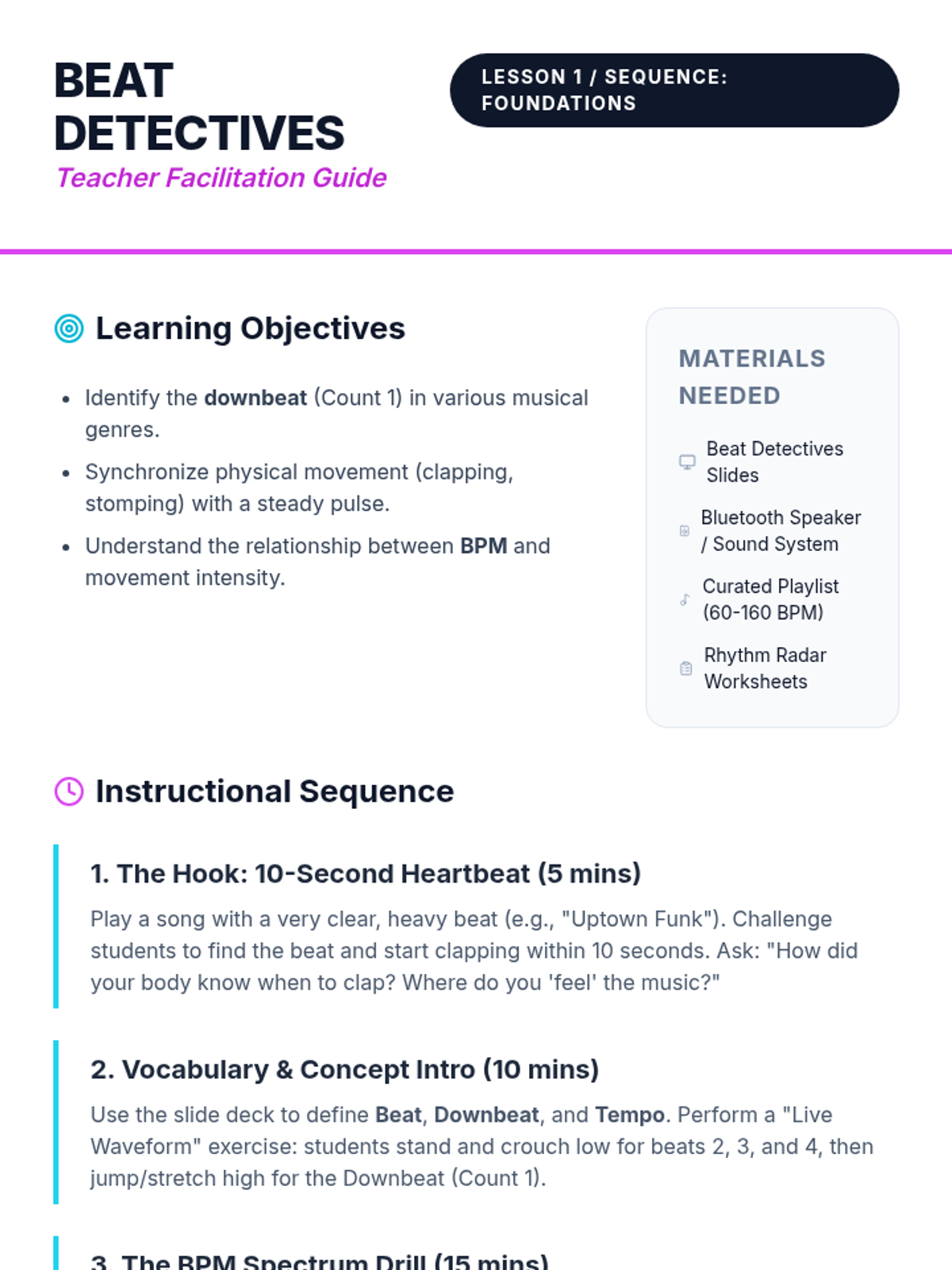 Students explore the concept of the 'downbeat' and BPM through active listening and rhythmic synchronization exercises.