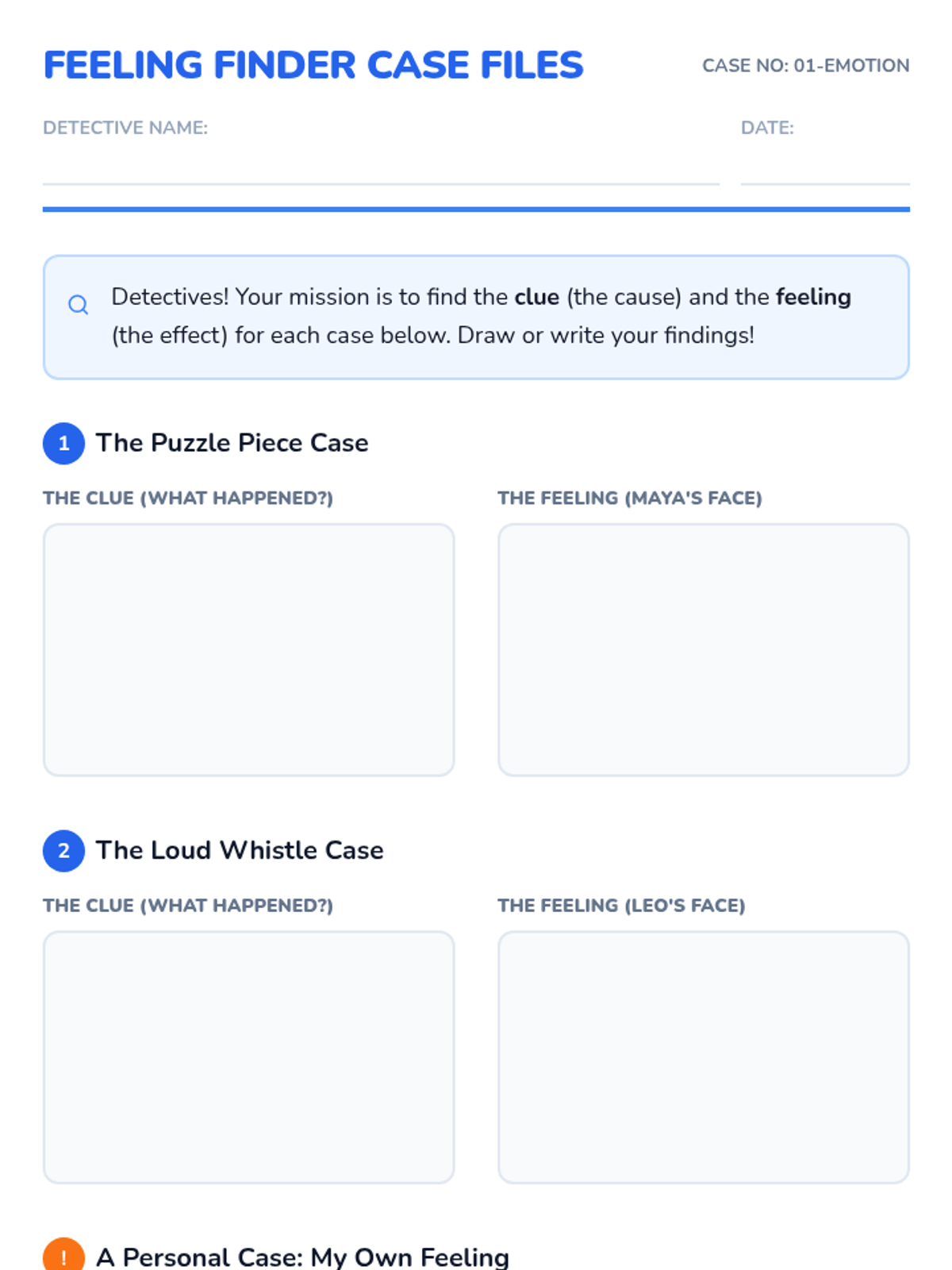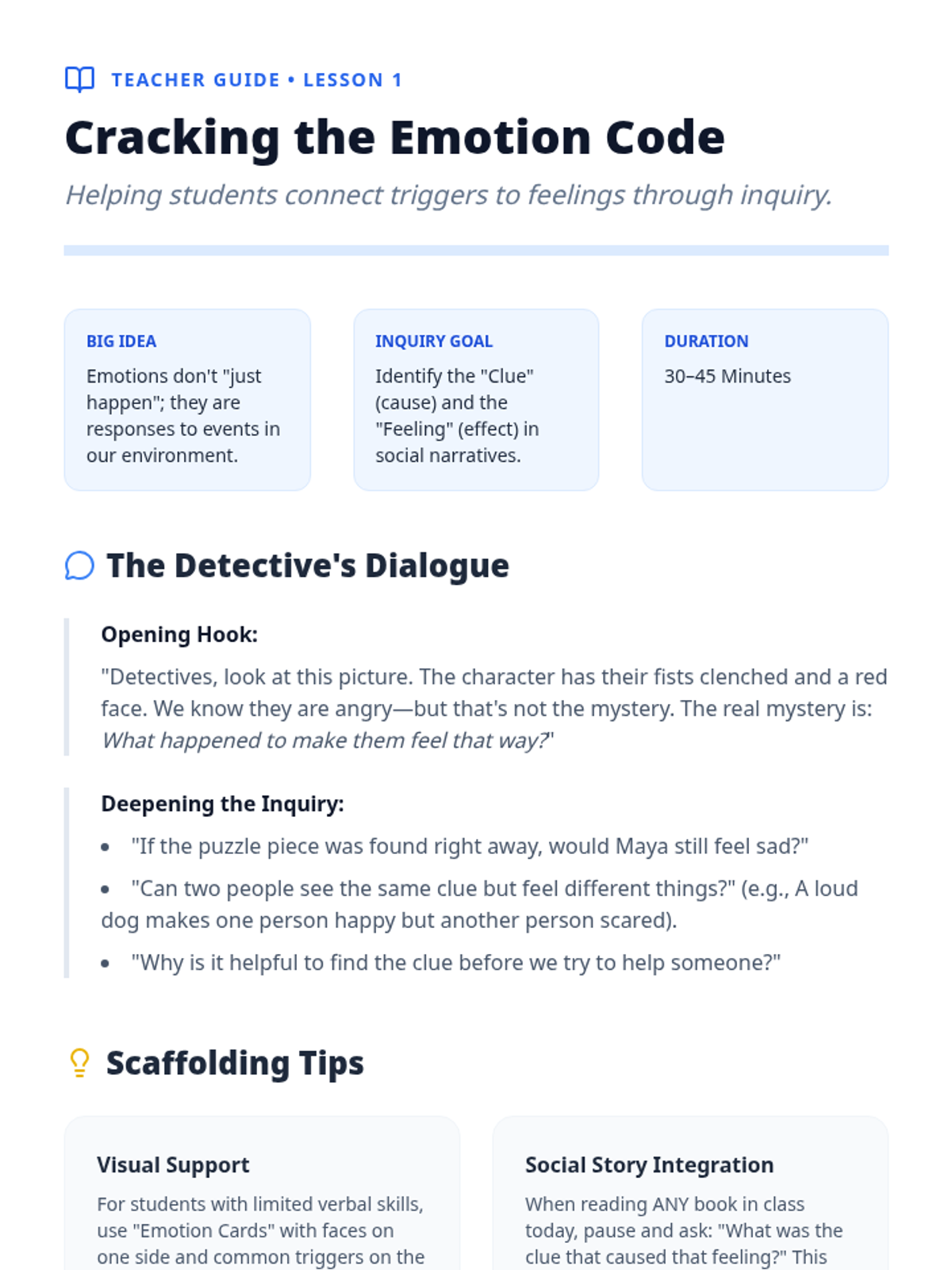 Students explore picture books and social scenarios to identify the root causes of emotions like happiness, sadness, and anger, mapping cause and effect for each feeling.