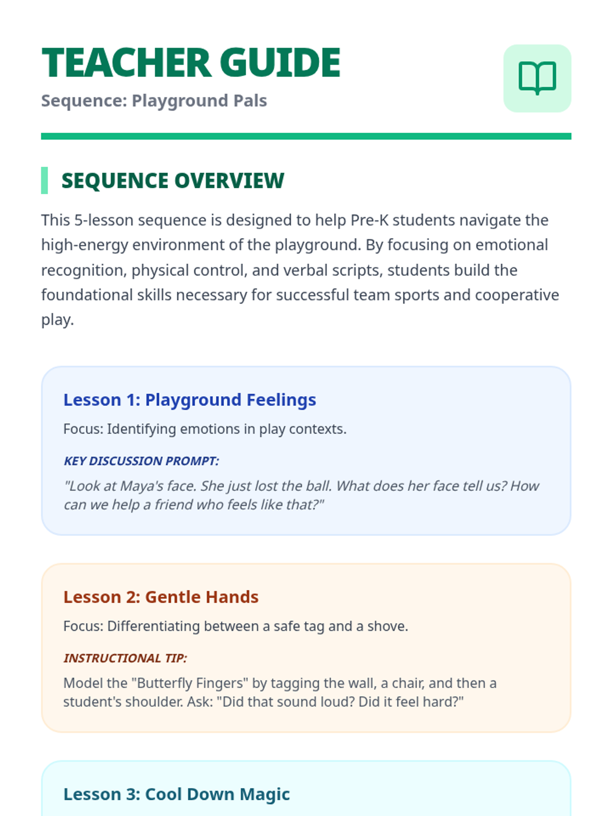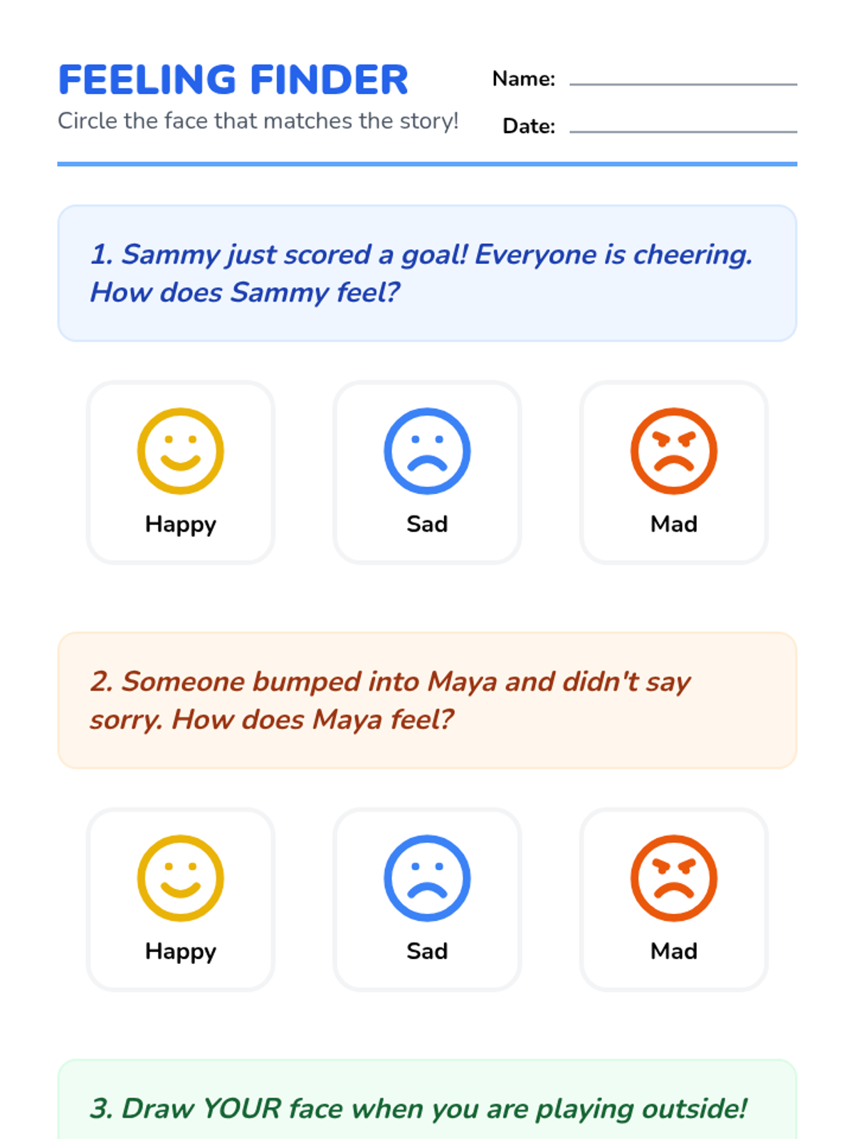 Students look at pictures of children playing sports with different facial expressions (happy, angry, sad) and discuss what might have happened. They practice making these faces to build emotional vocabulary related to play.