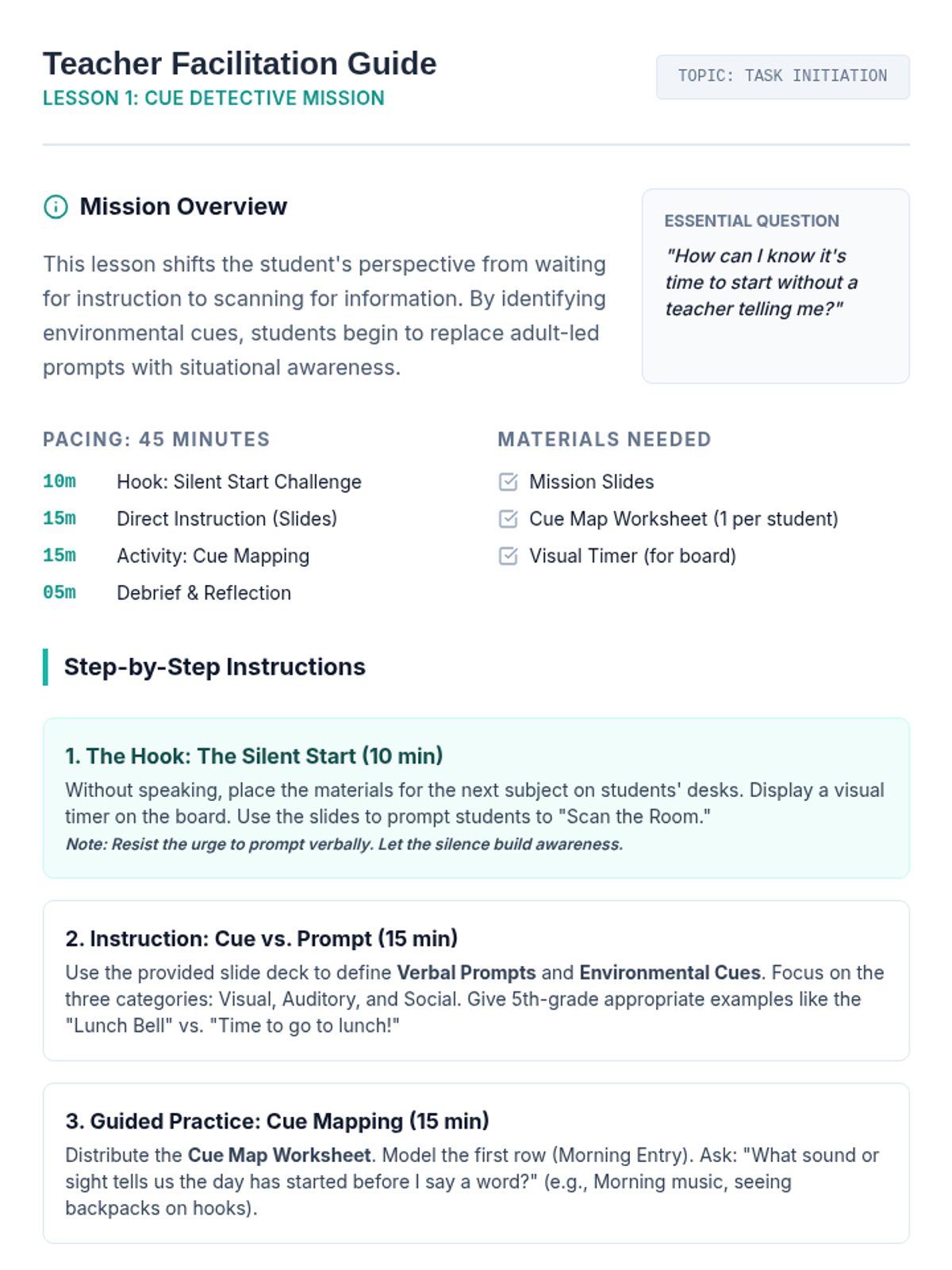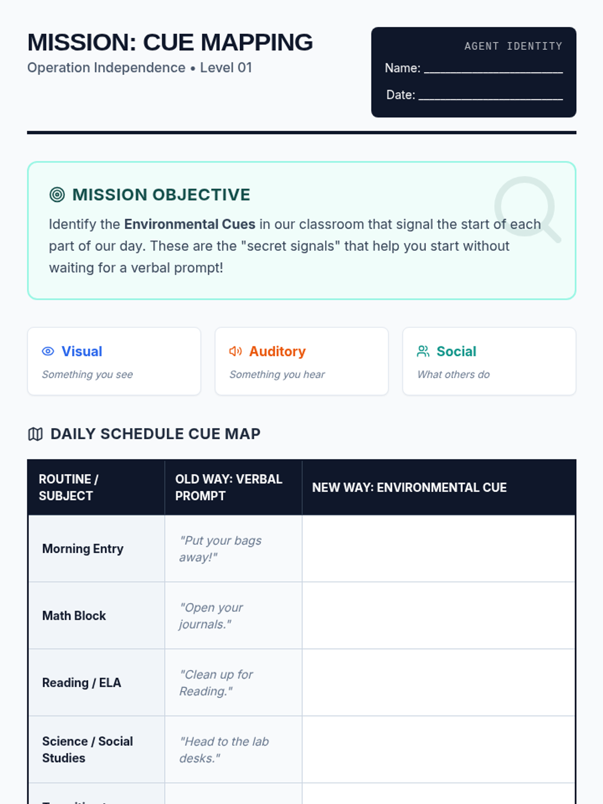 Students identify non-verbal classroom signals that indicate work time has begun and create a map of these cues across their daily schedule.
