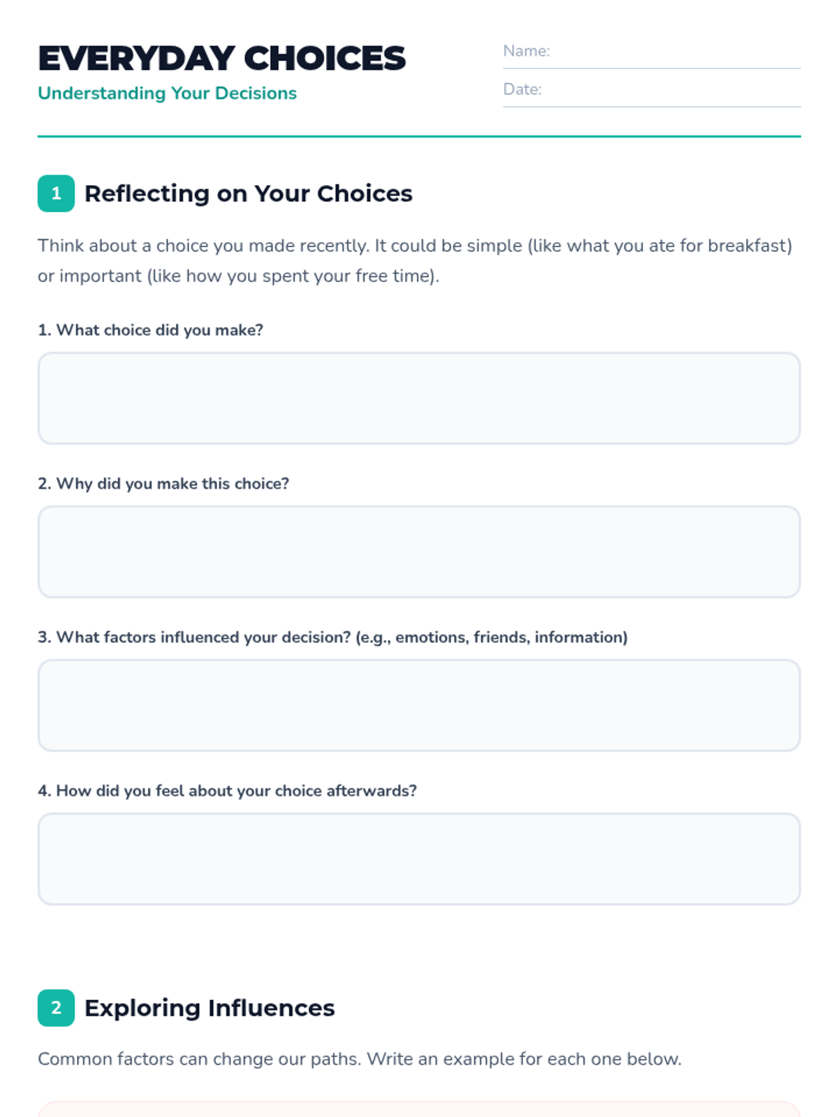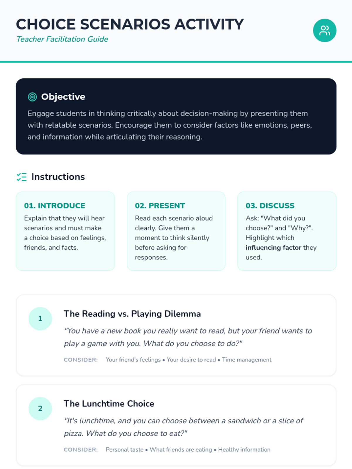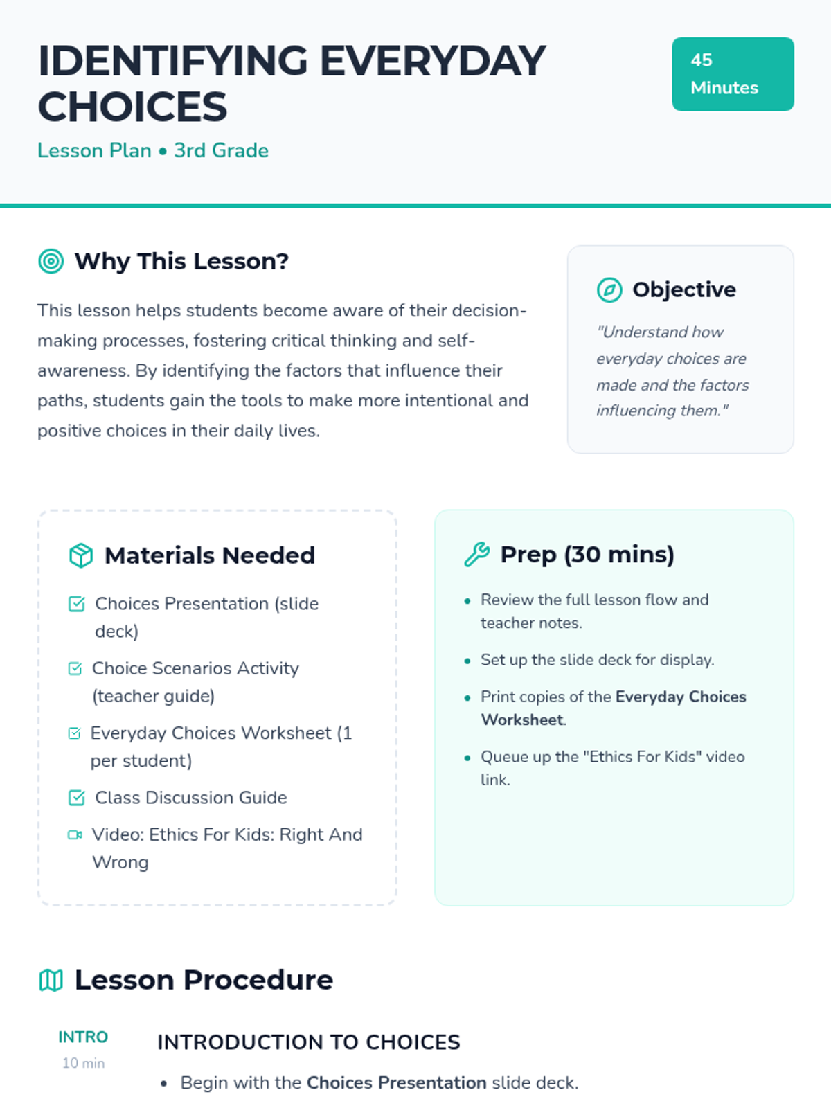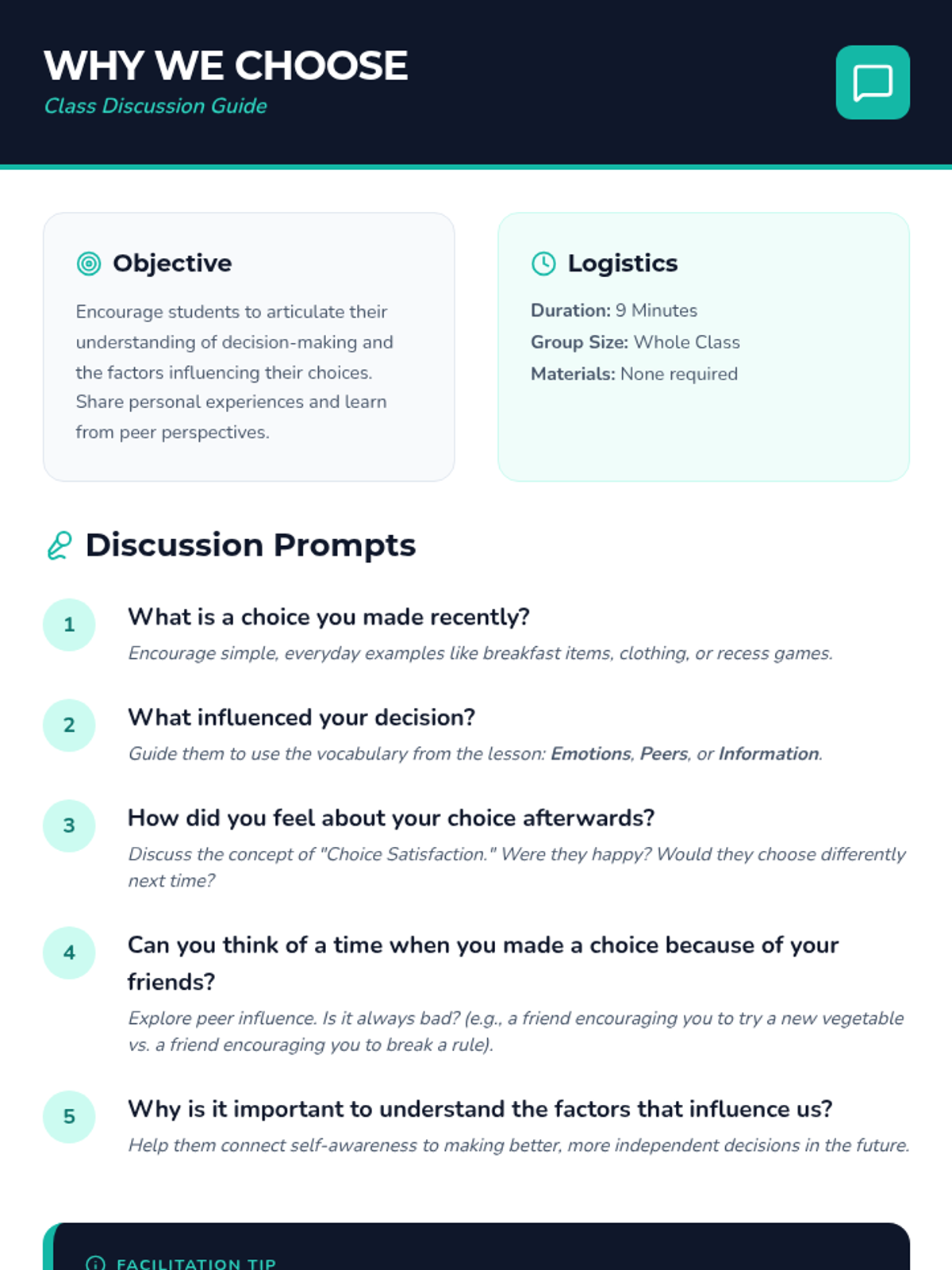 A lesson to help students recognize everyday choices they make and the factors influencing those decisions. Students explore emotions, peer pressure, and information as key influences on their path.