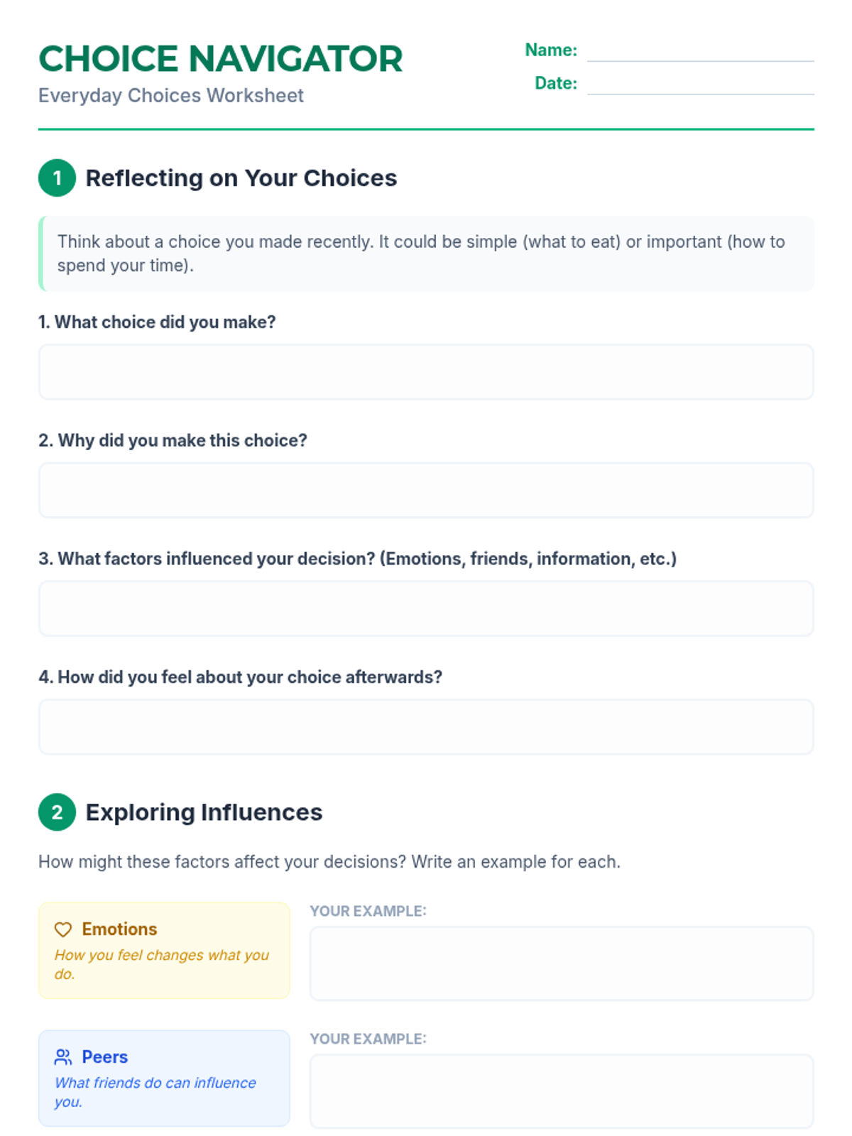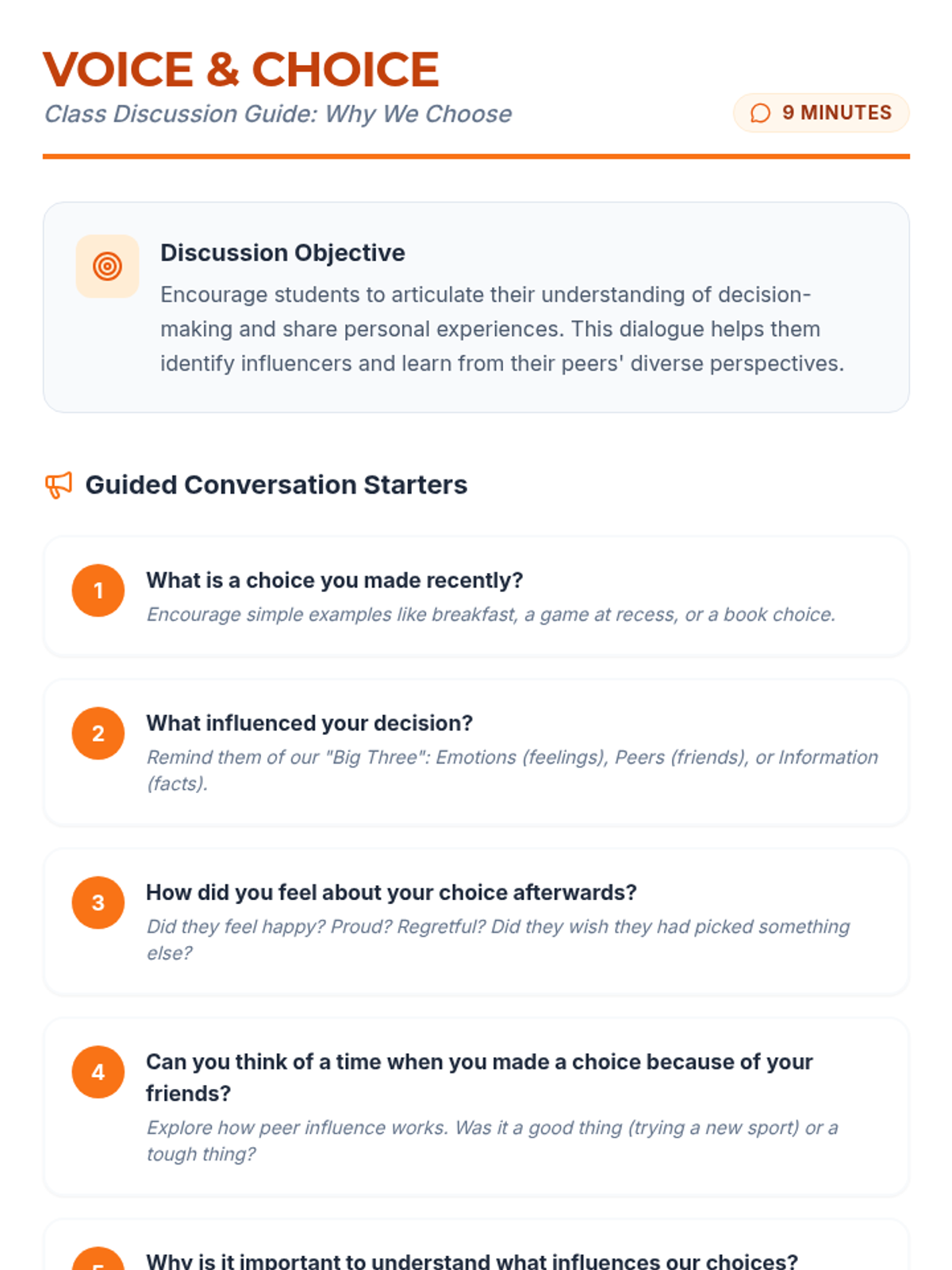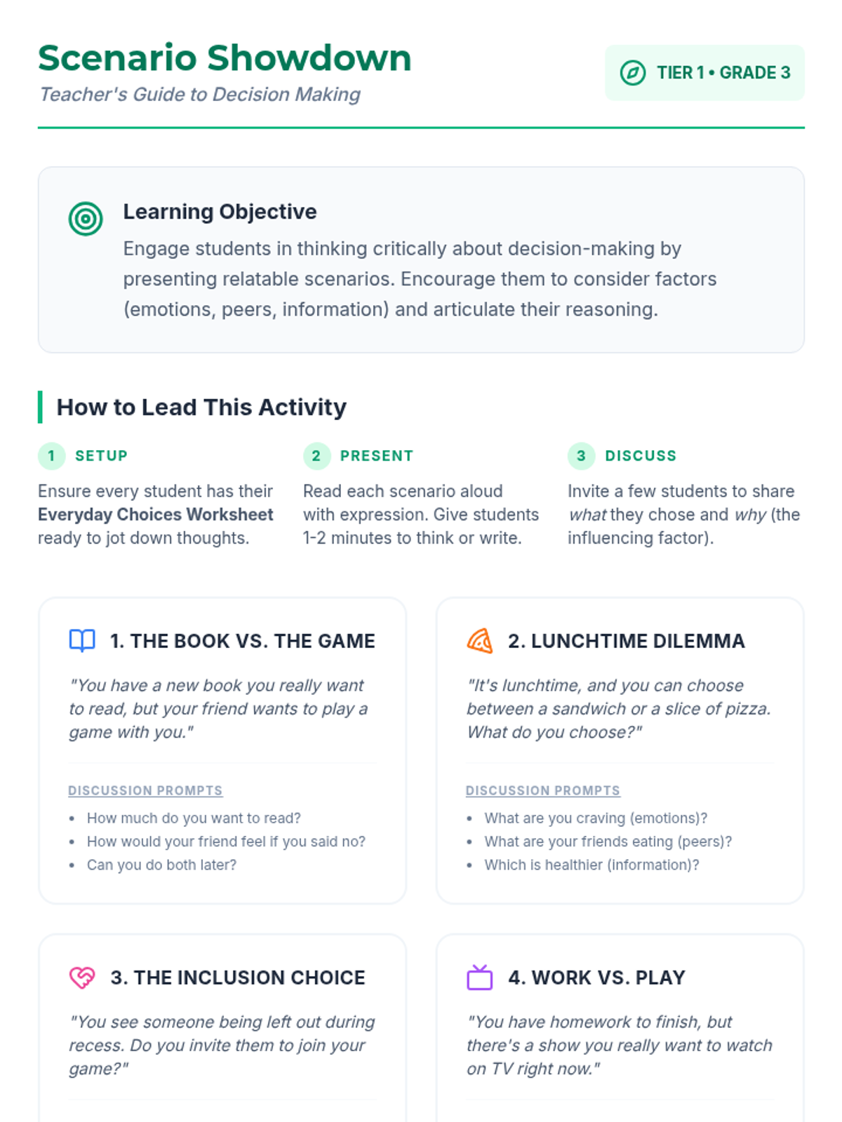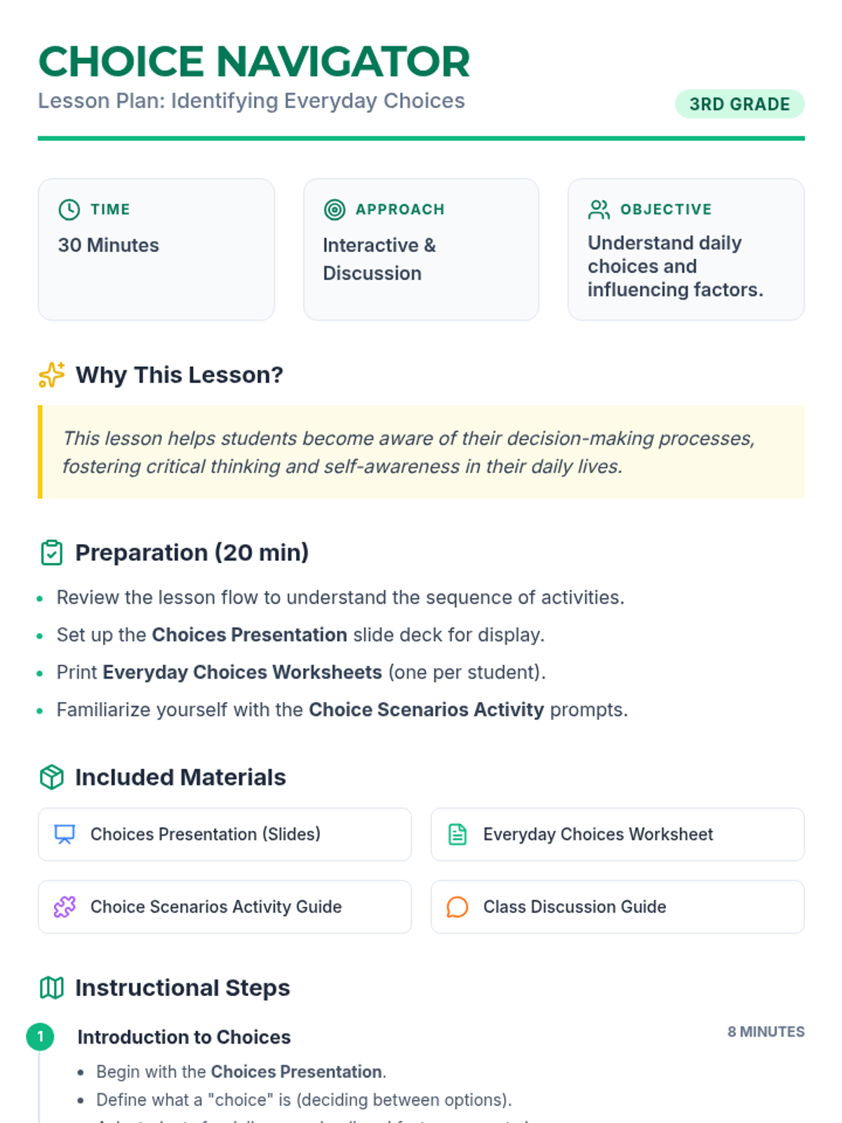 An introductory lesson for 3rd-grade students focused on identifying daily choices and the factors like emotions, peers, and information that influence them.