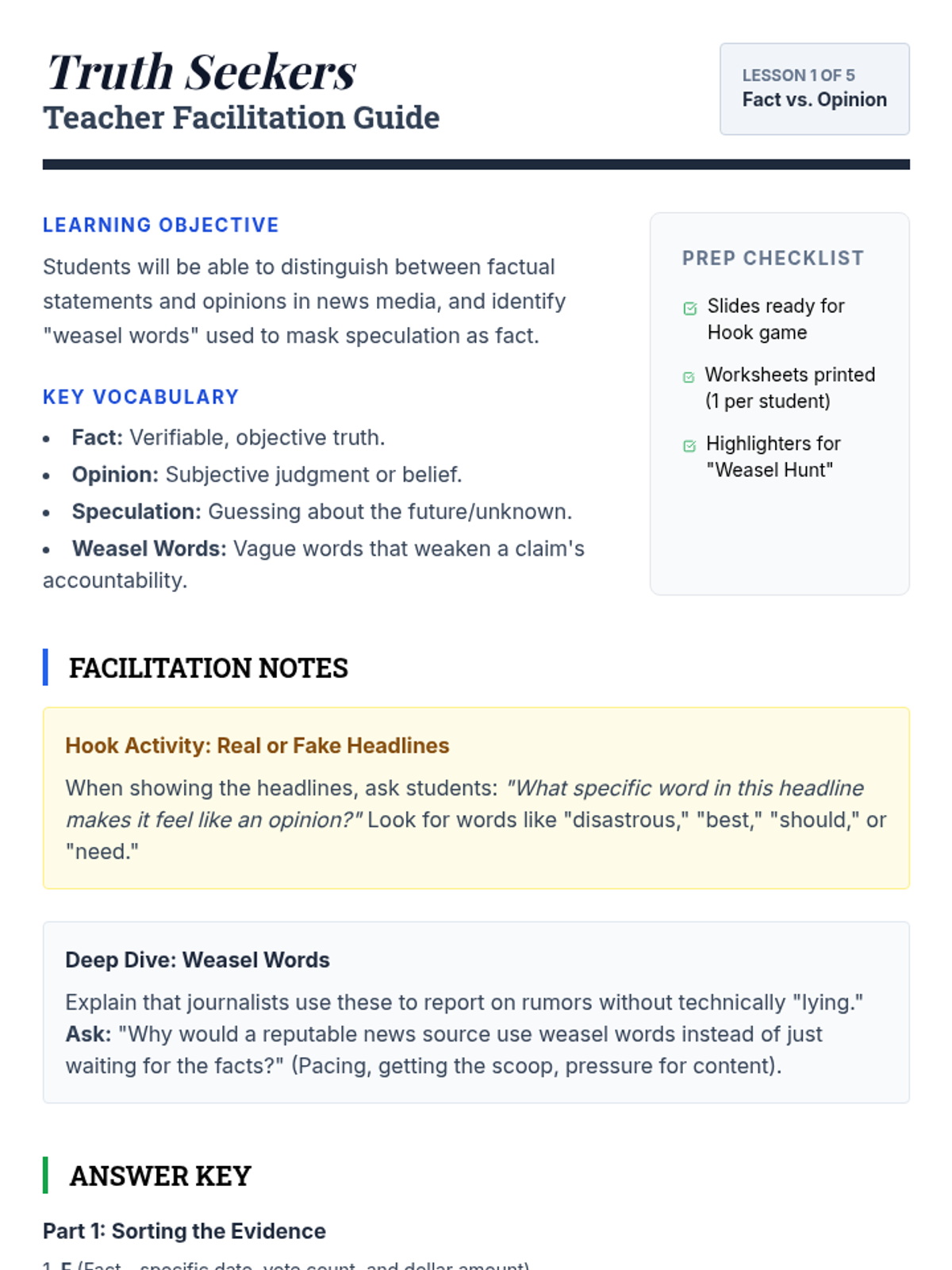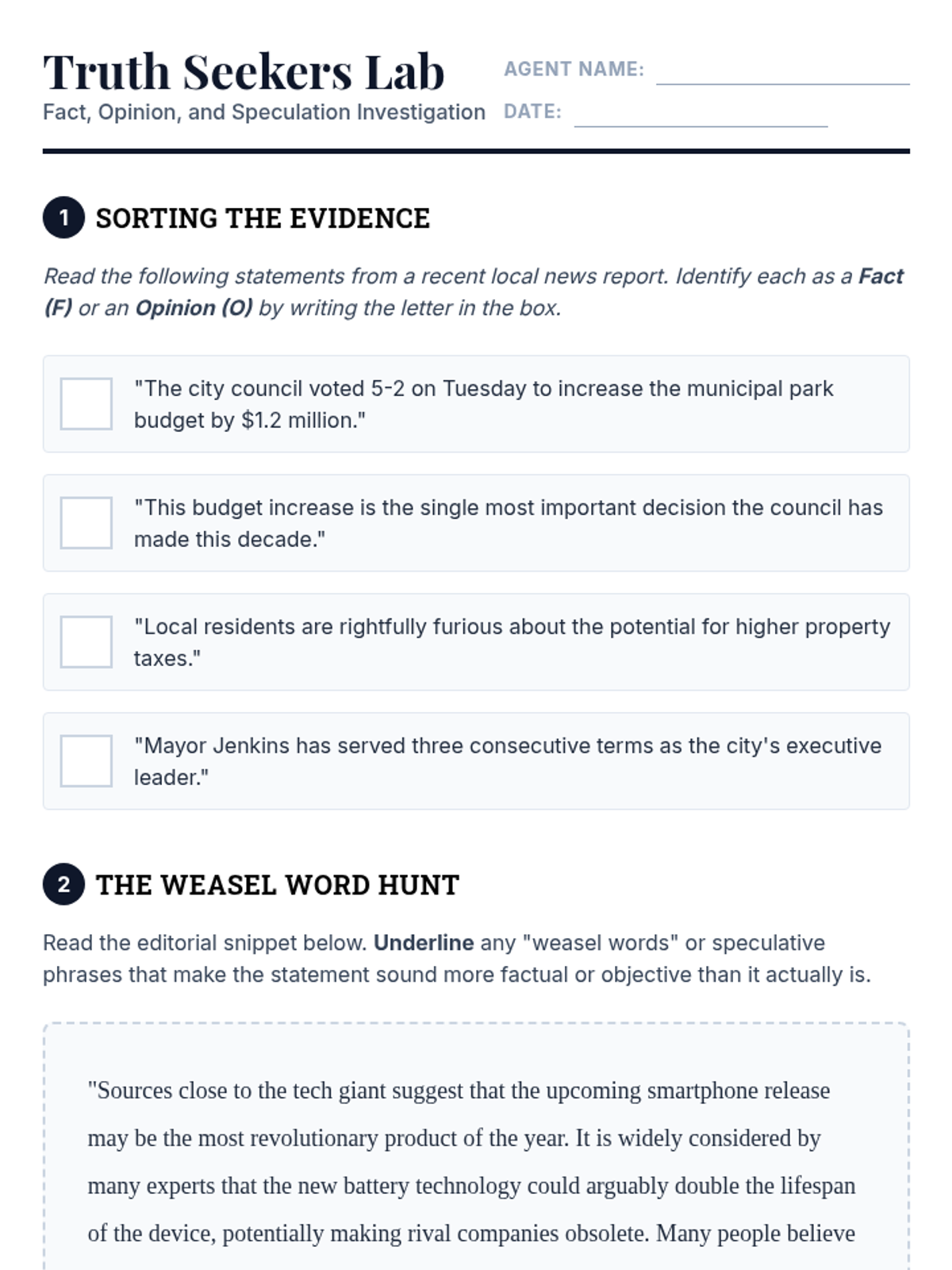 Students practice categorizing statements in news articles and learn to identify 'weasel words' that turn speculation into apparent fact.