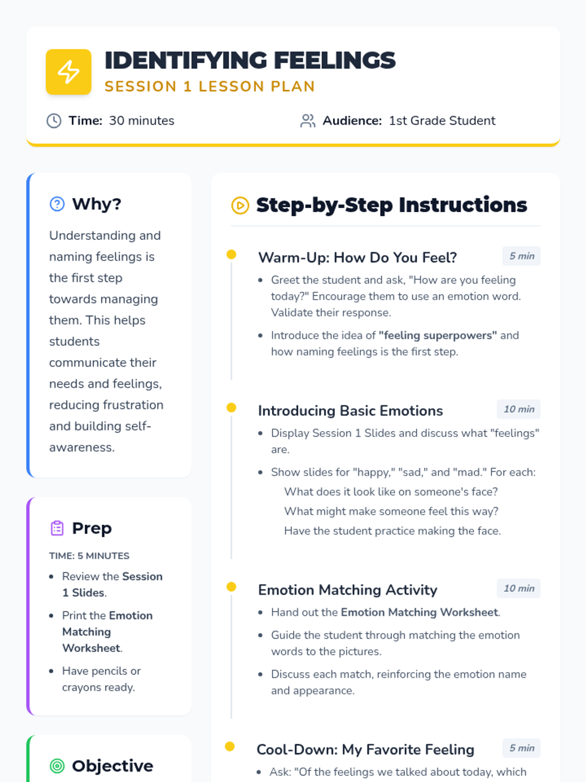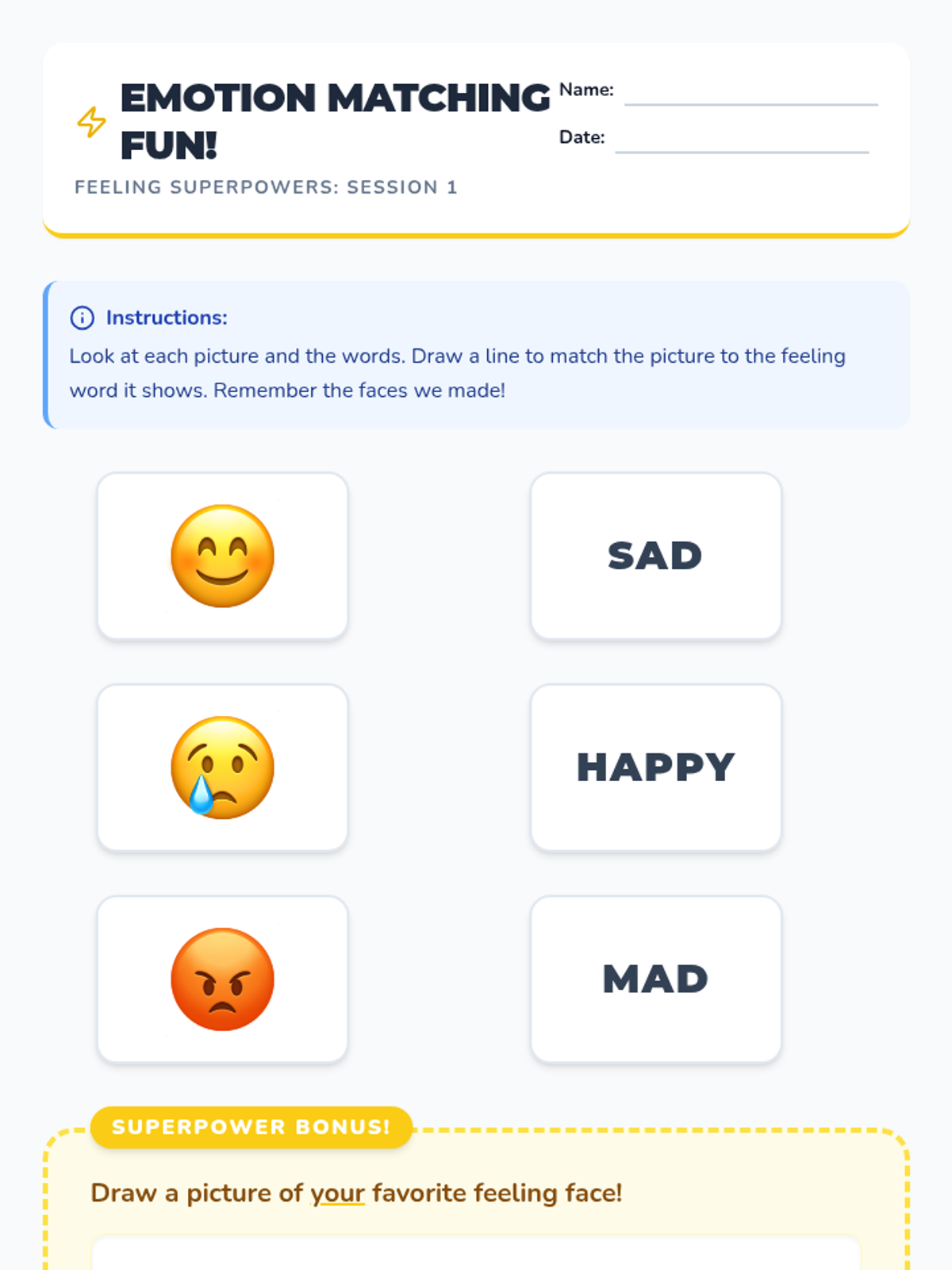 Students learn to identify and name basic emotions (happy, sad, mad) using visual cues and facial expressions.