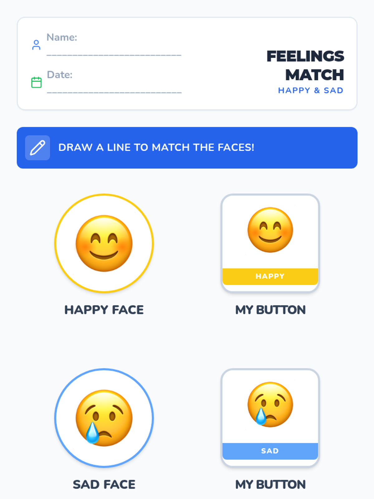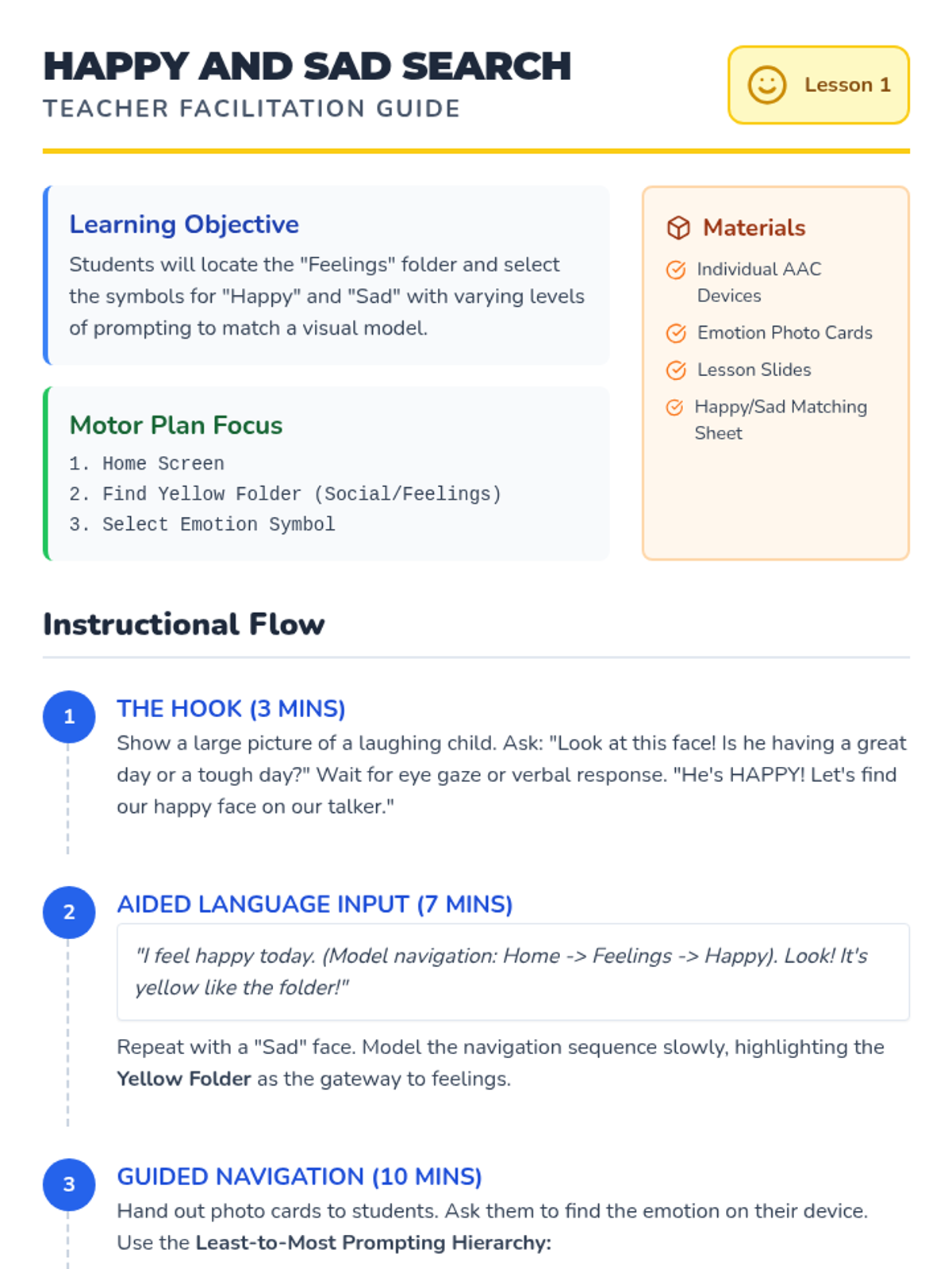 Students identify basic emotions (Happy, Sad) and learn the motor plan to navigate to the 'Feelings' page on their AAC device.