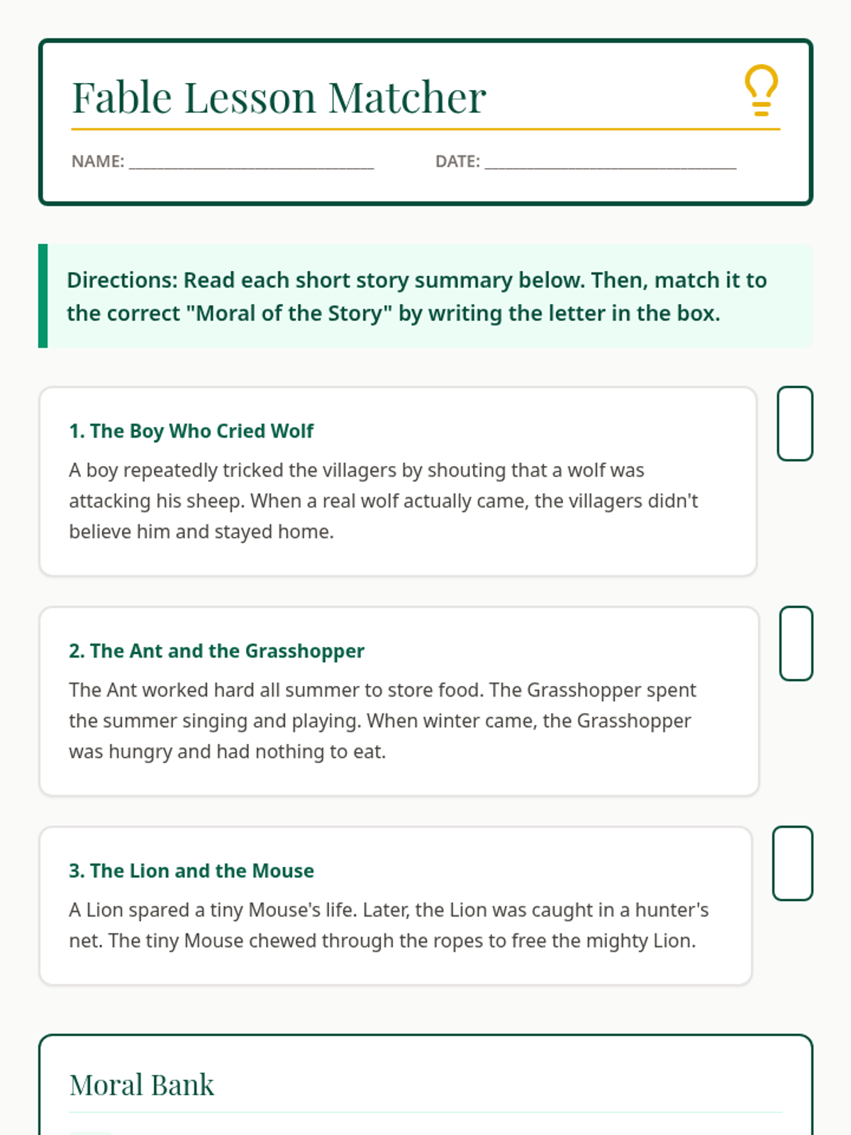 Exploring the central messages and morals of fables. Students learn to infer the 'lesson' of a story and connect traditional proverbs to narrative events.