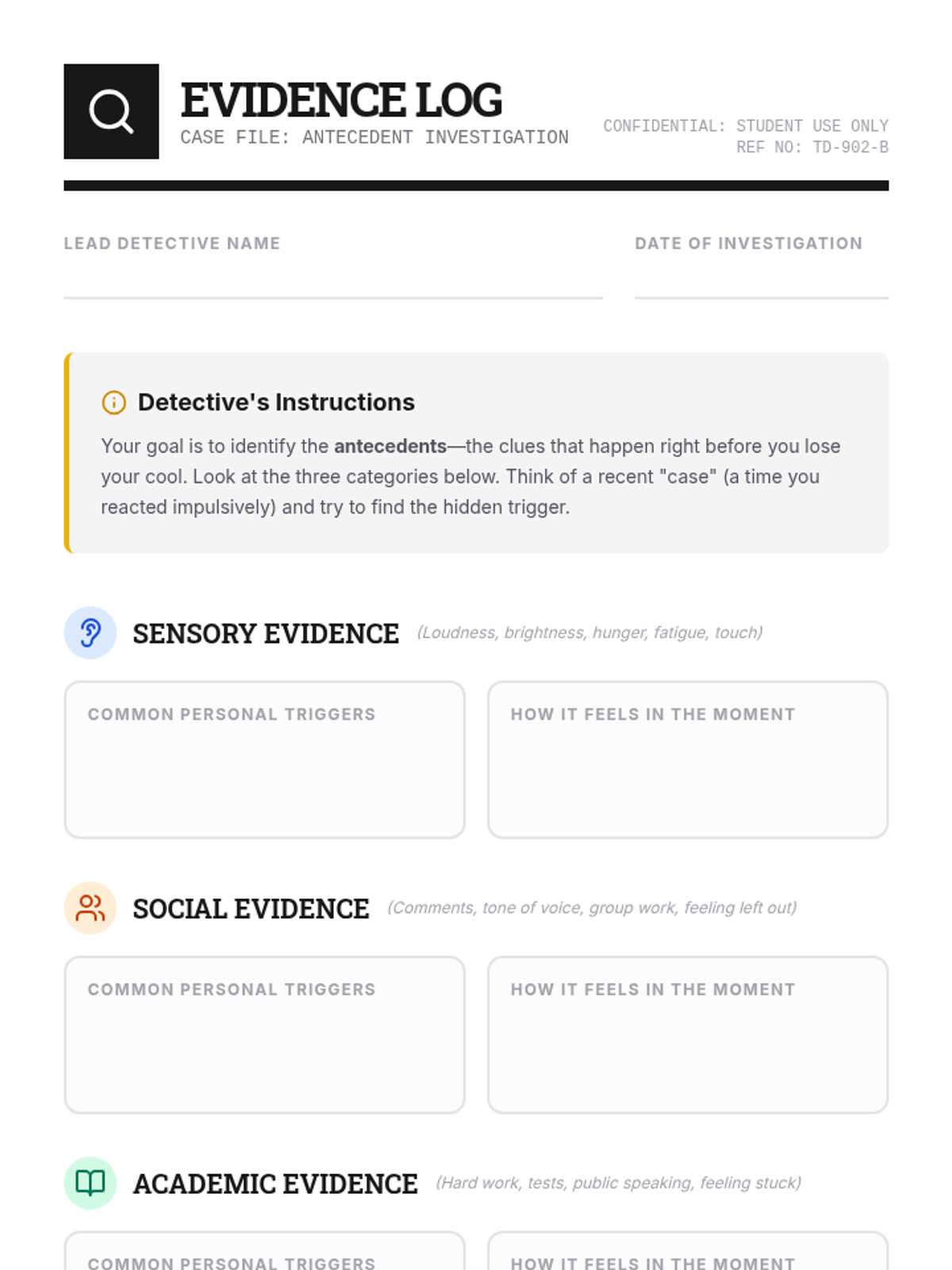 Using a detective framework, students analyze past events to identify 'antecedents'—the specific environmental or social factors that occurred immediately before a behavior. They categorize these into sensory, social, and academic triggers.