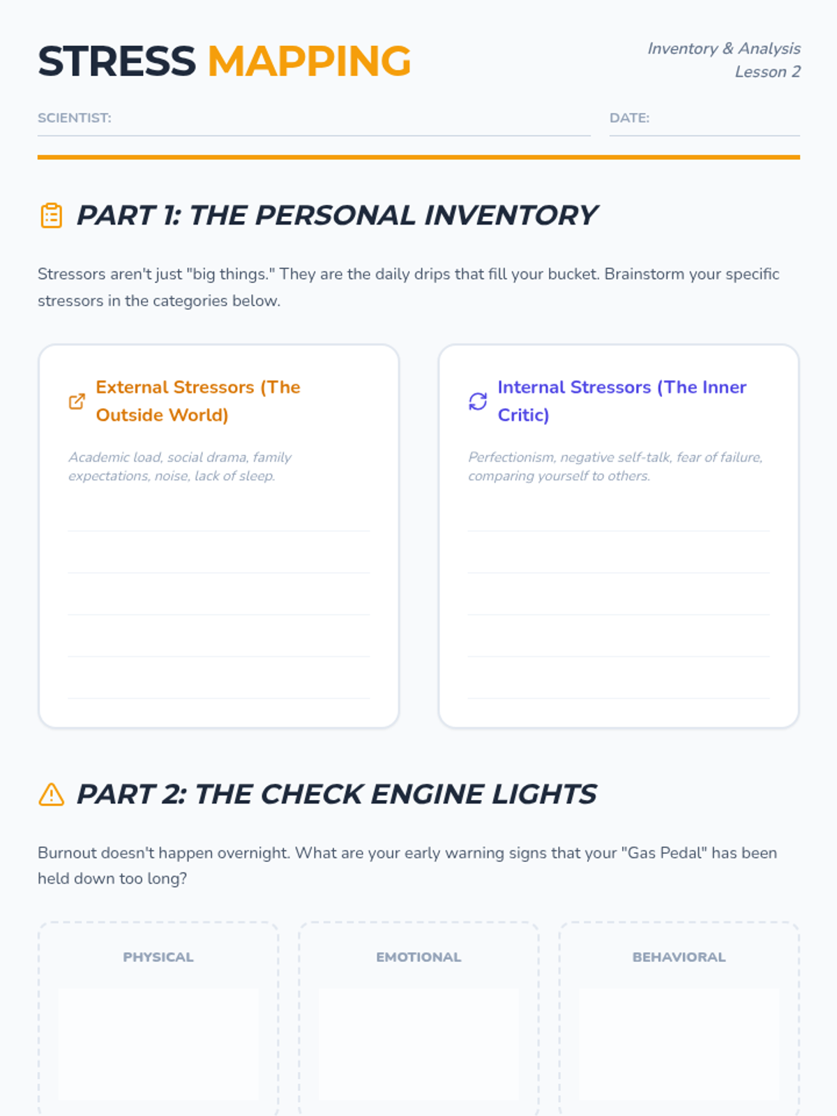 Identify personal internal and external stressors and create a 'stress map' to recognize early warning signs of burnout.