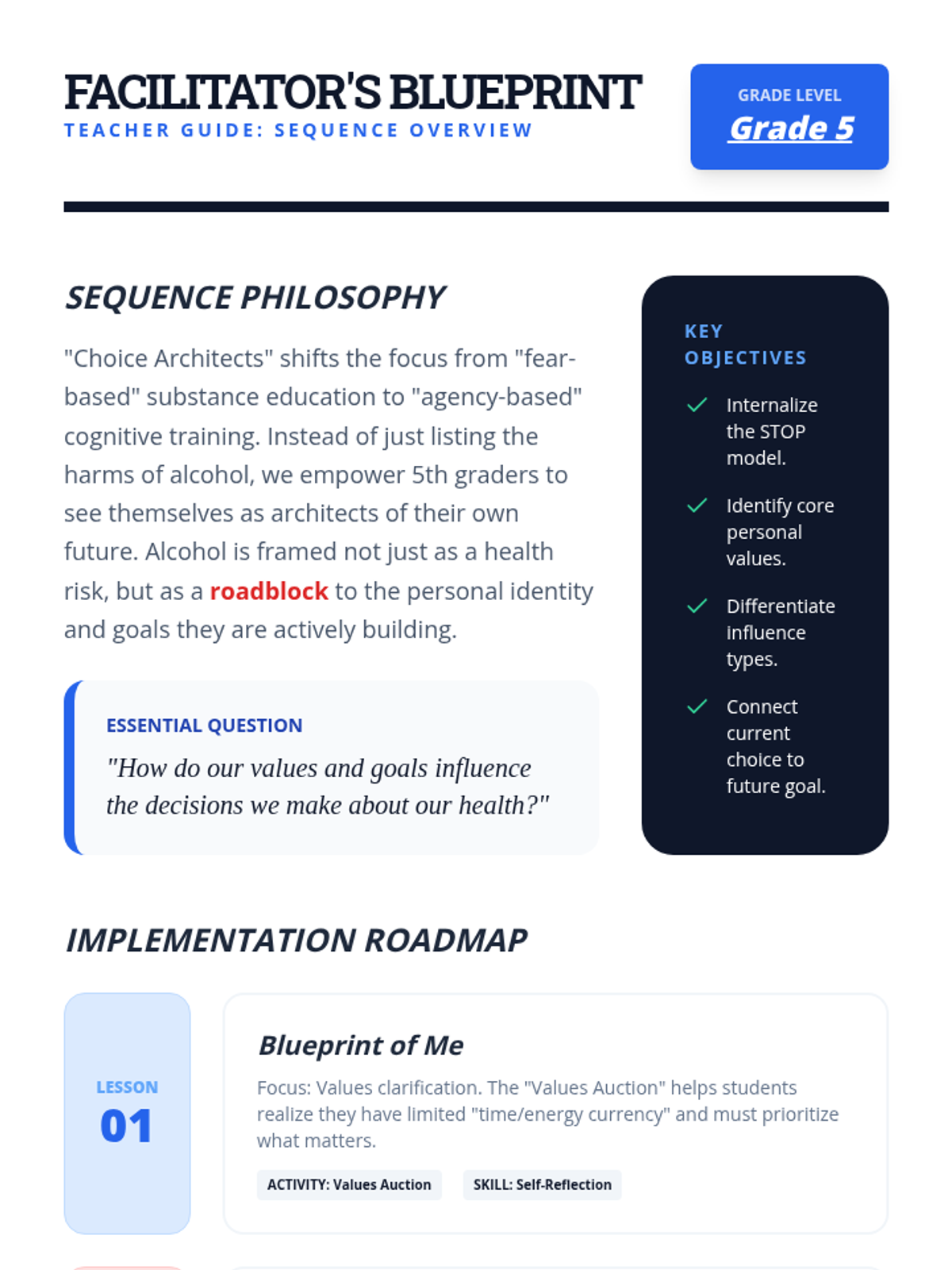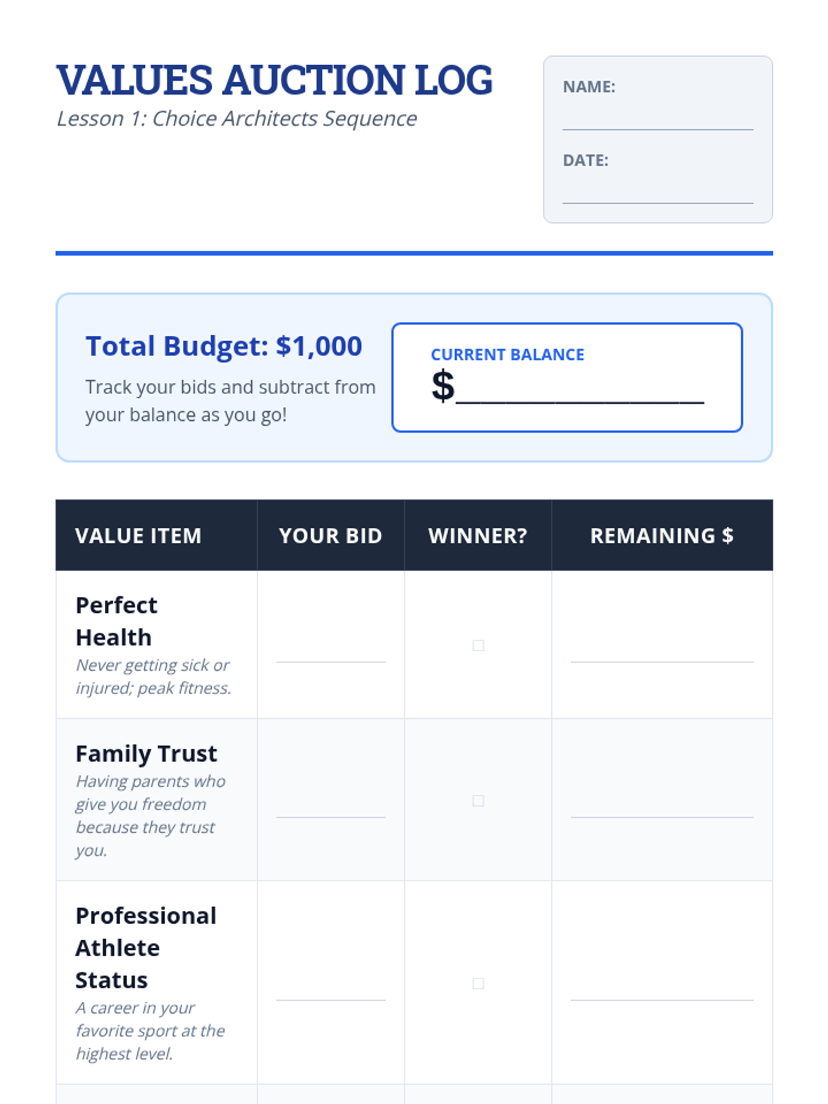 Students explore personal priorities through a values auction and sorting activity to understand how substance use can conflict with their most important goals.