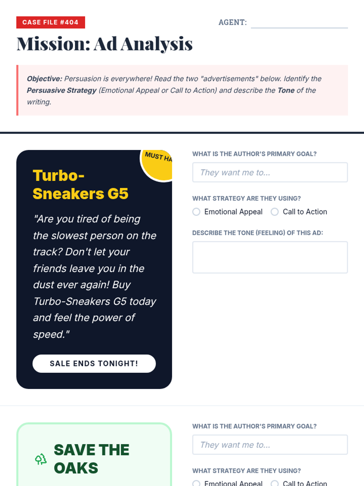 Dives into the mechanics of persuasion. Students identify emotional appeals and calls to action in advertisements and speeches, analyzing how tone supports the author's persuasive goal.