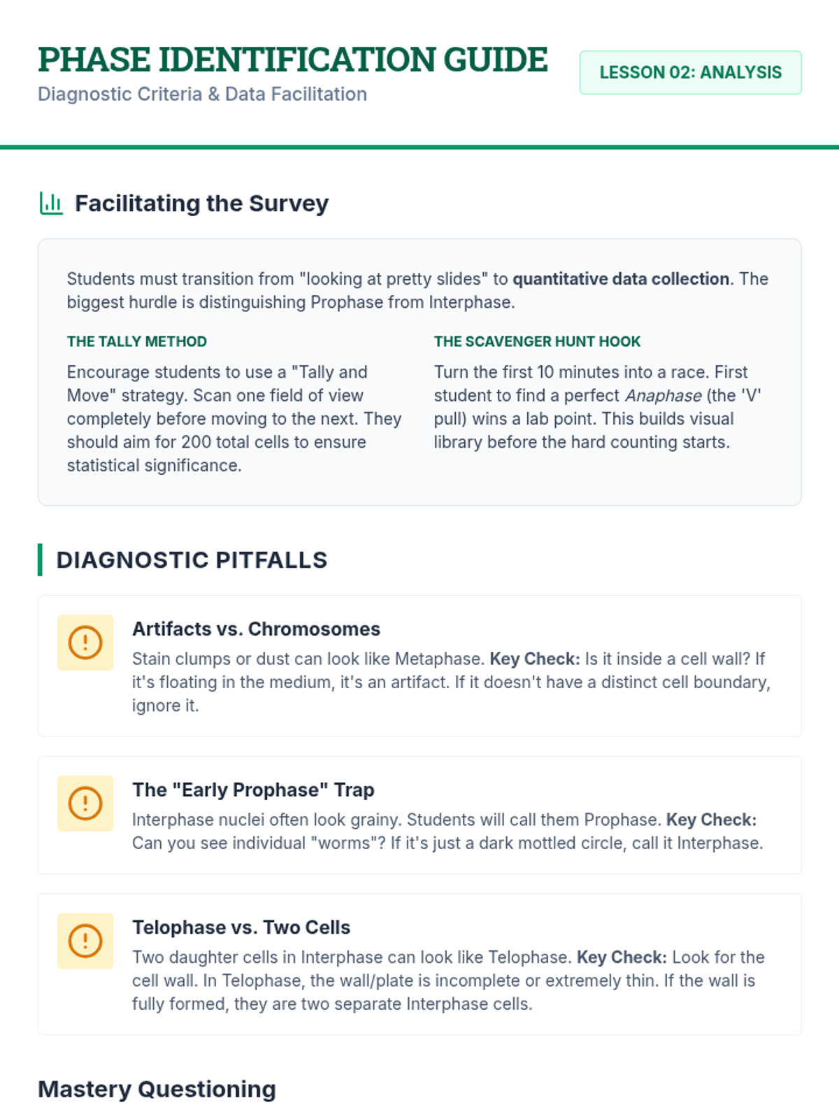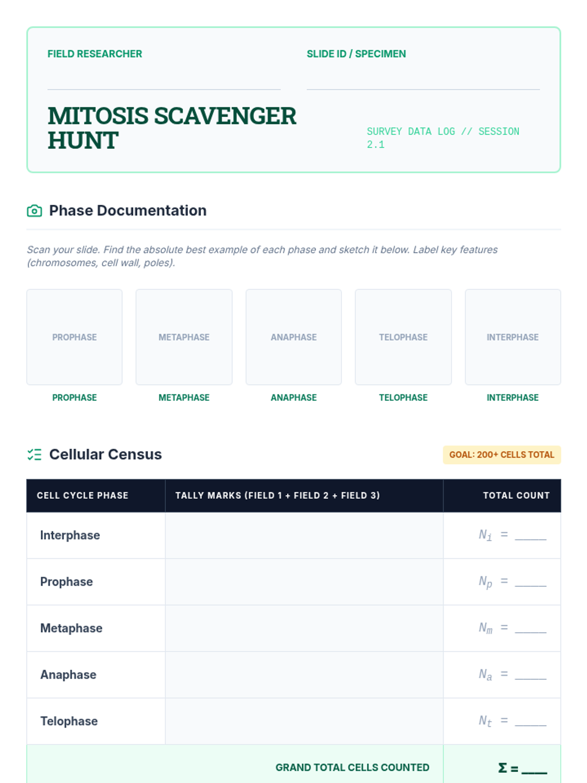 Students survey onion root tip slides to identify and categorize cells into various mitotic phases, learning to distinguish biological structures from artifacts.
