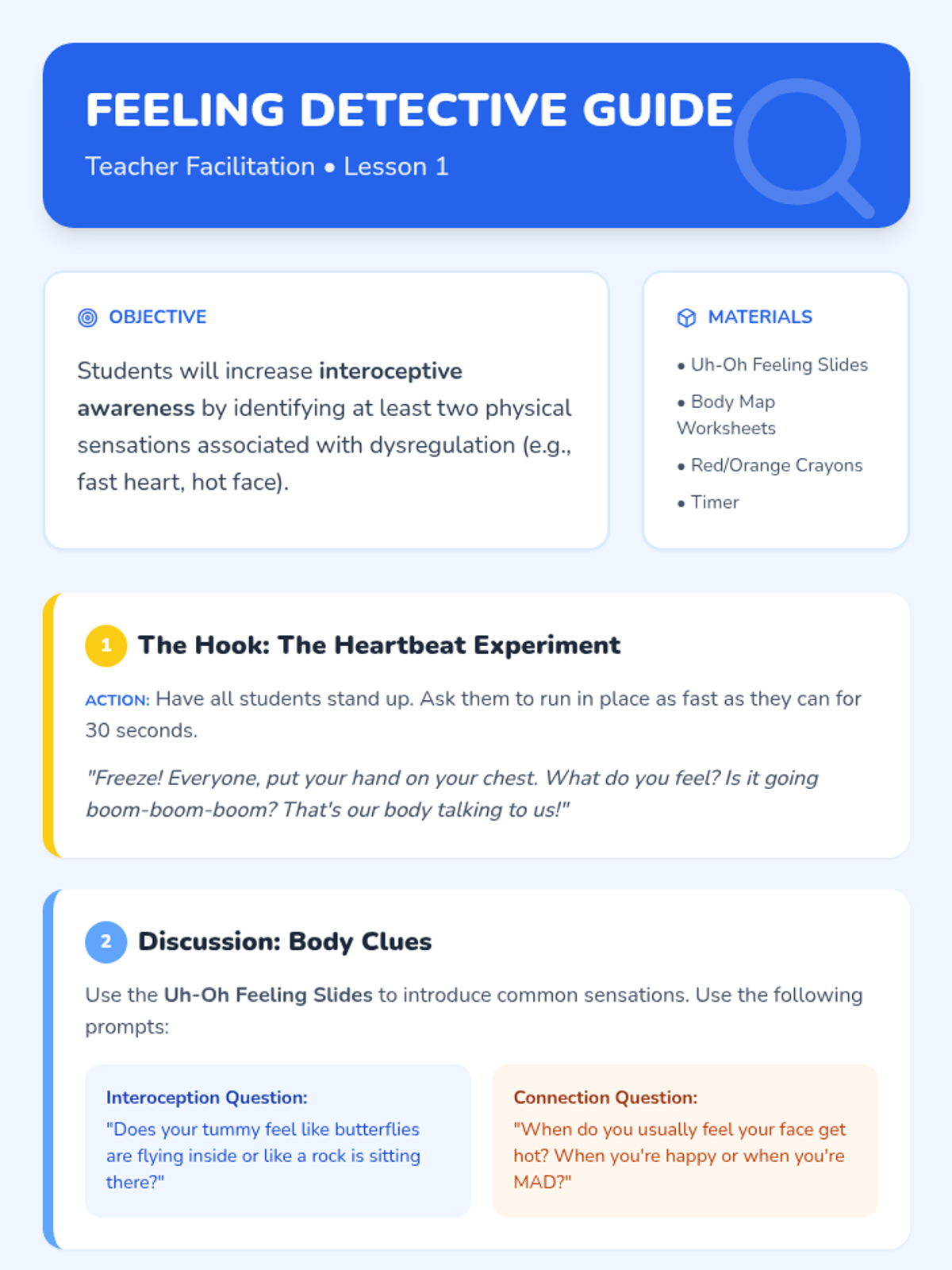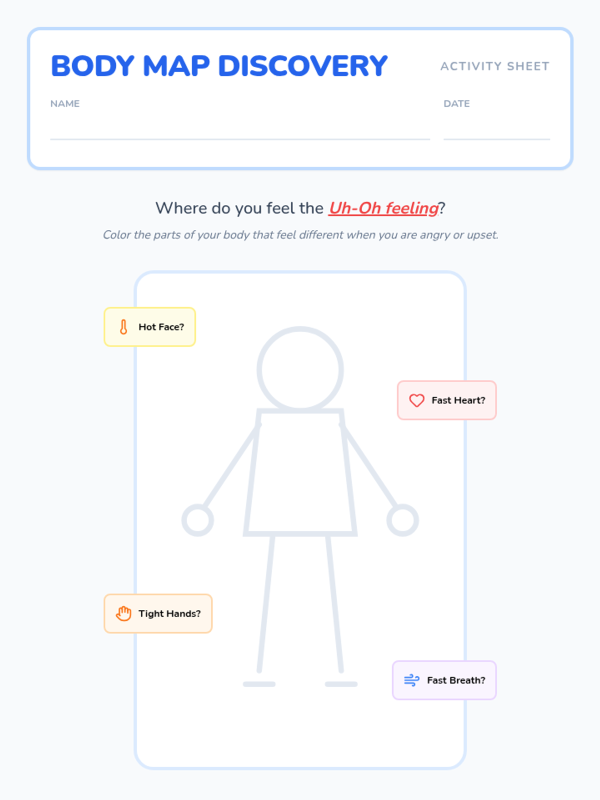 Students learn to recognize the physical sensations of stress or anger like a fast heartbeat or hot face. They use body outlines to visualize where they feel 'big emotions,' setting the stage for their personal story.