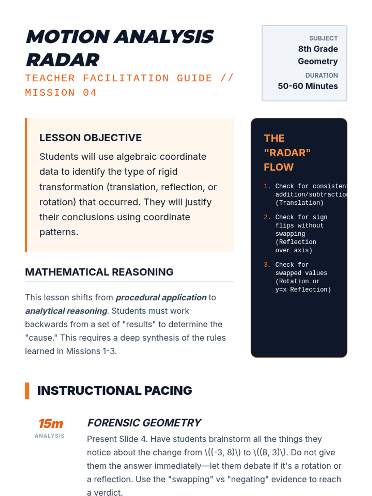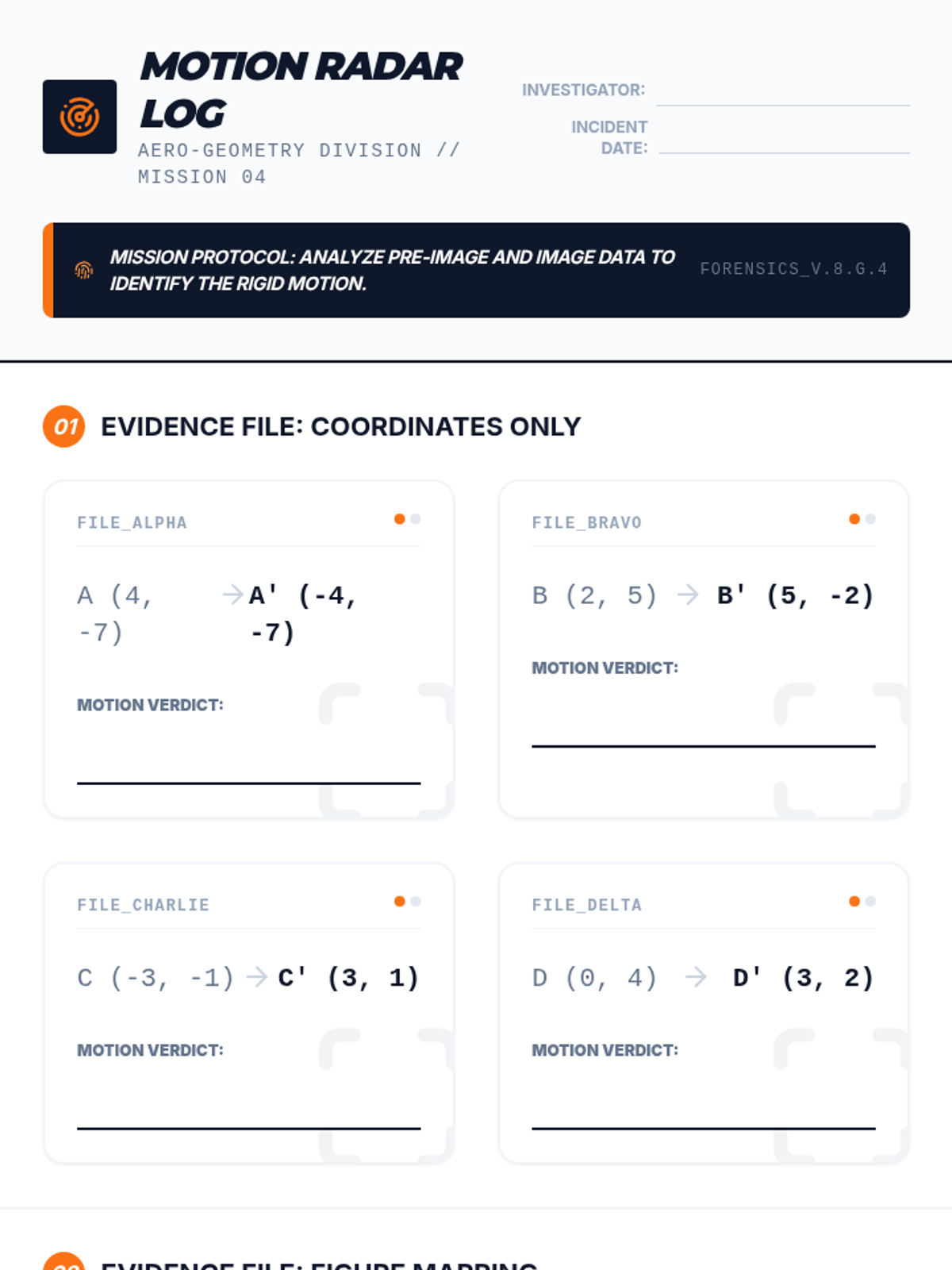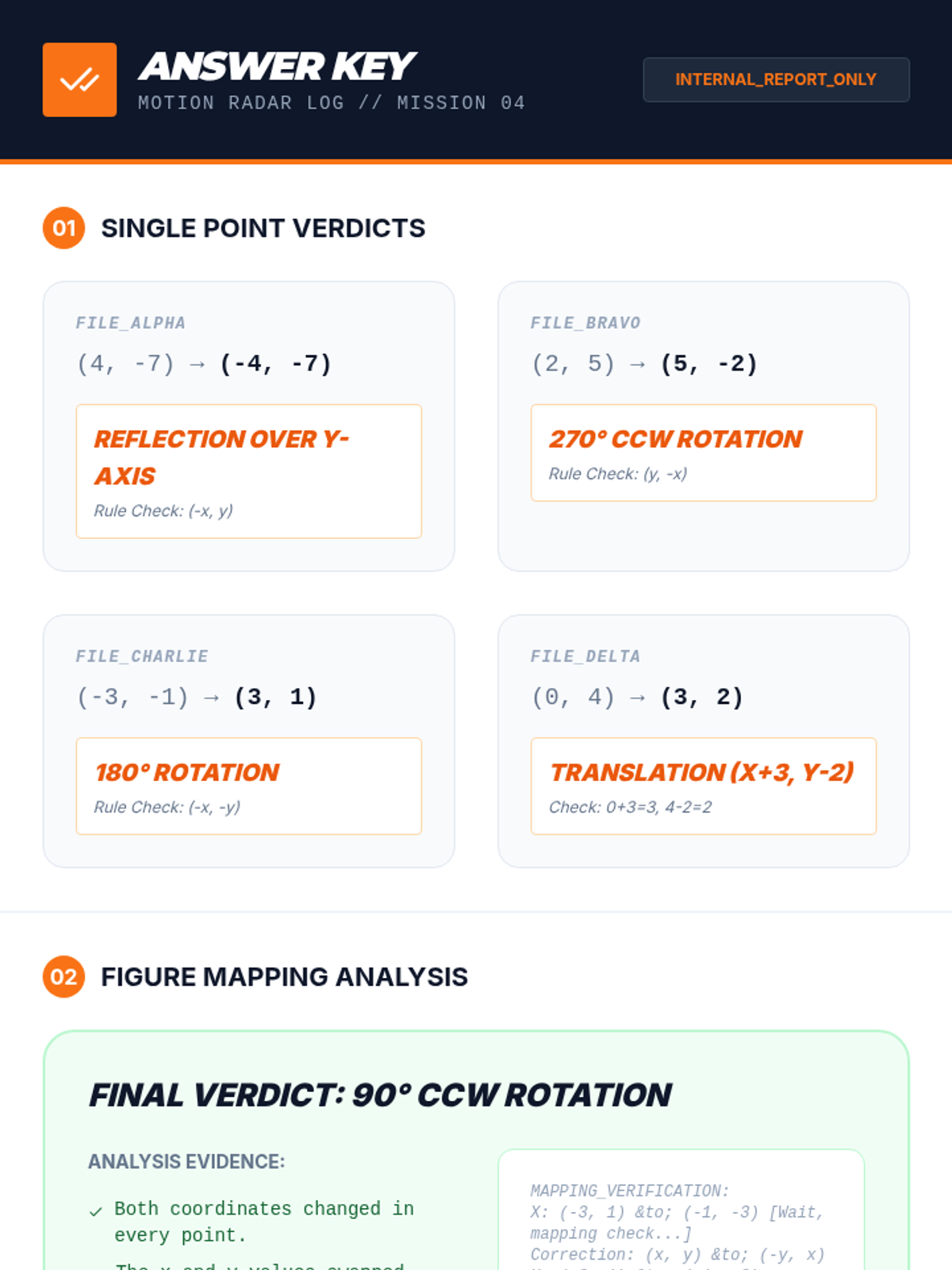 Working backwards, students are given coordinate pairs for a pre-image and an image and must determine which rigid motion occurred. This strengthens their analytical skills and understanding of the algebraic rules.
