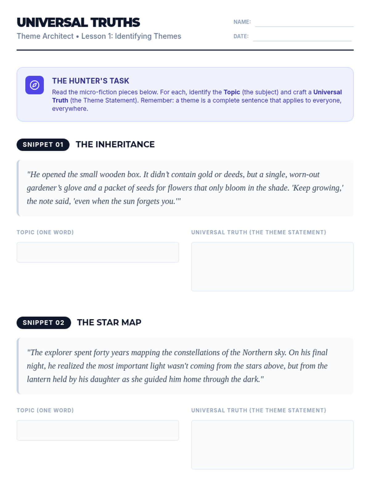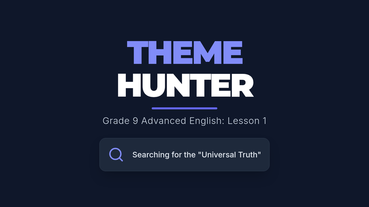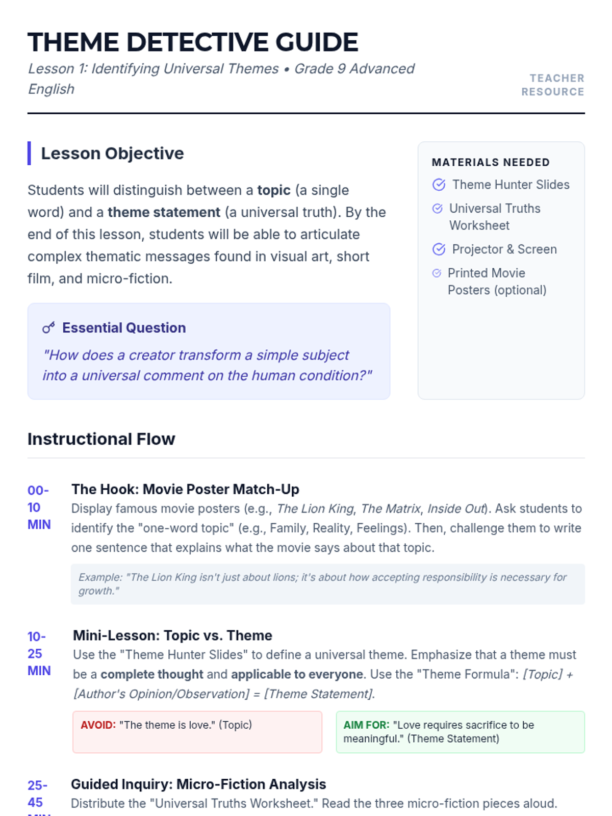 Students transition from identifying simple topics to articulating complex universal theme statements through visual art, micro-fiction, and discussion.