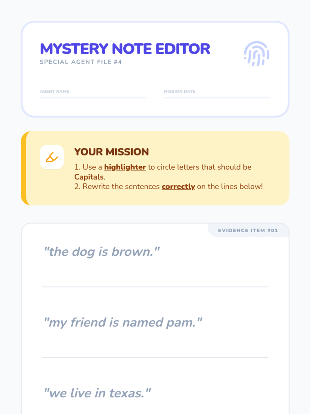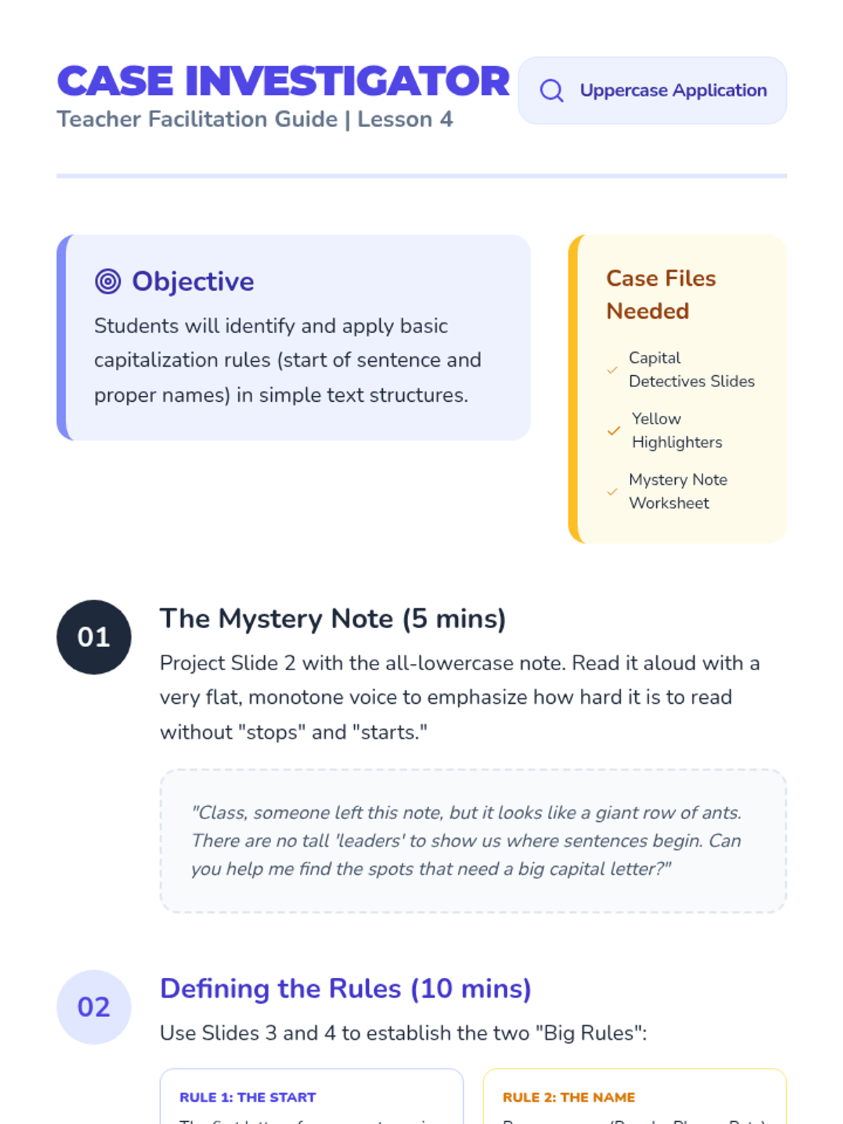 Students investigate and apply rules for when to use uppercase letters, focusing on sentence starts and proper names.